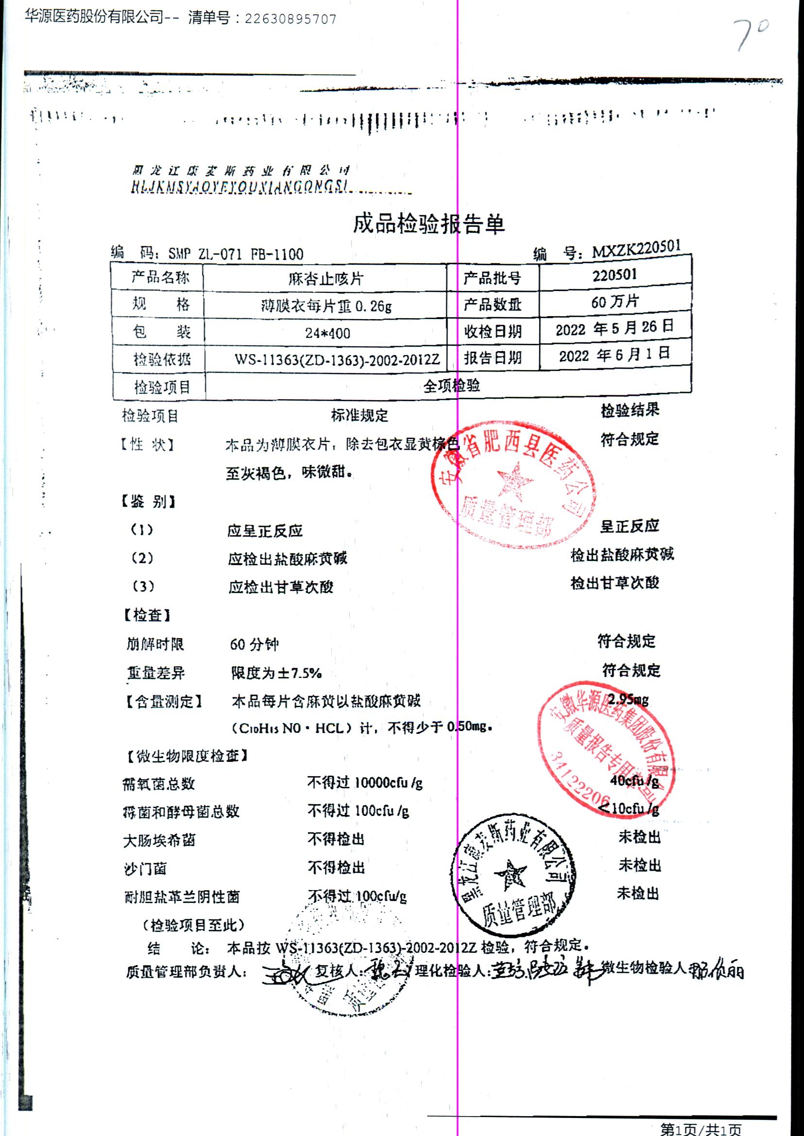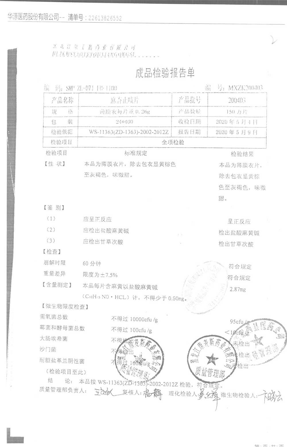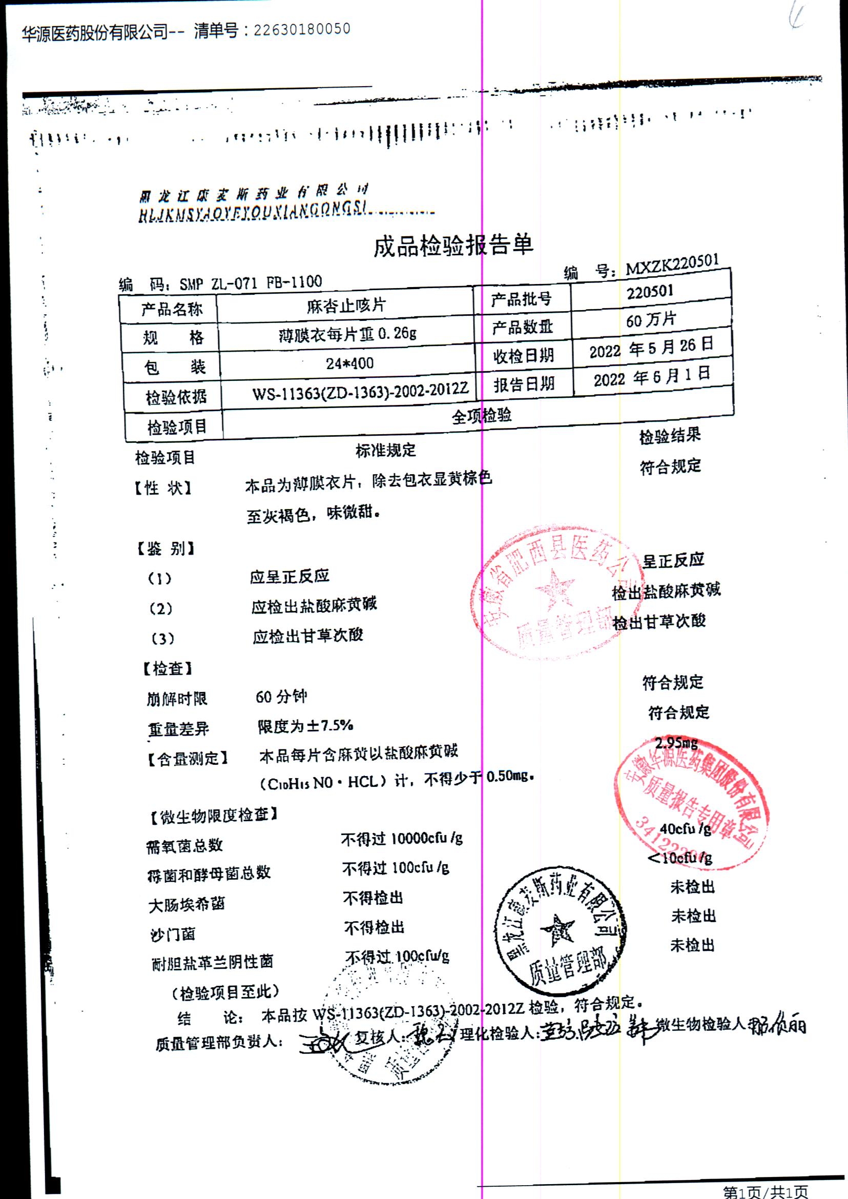 麻杏止咳片 | 0.26g | 240510/2 | 查看详情 |