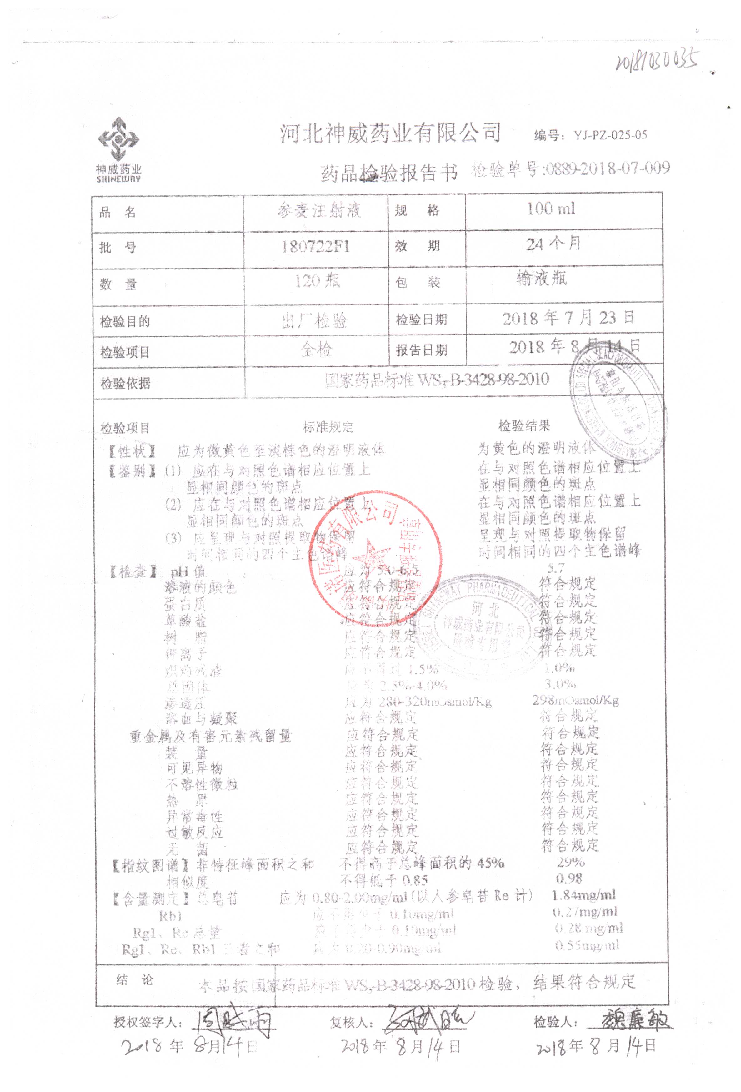 参麦注射液 | 100ml | 180722F1 | 查看详情 |
