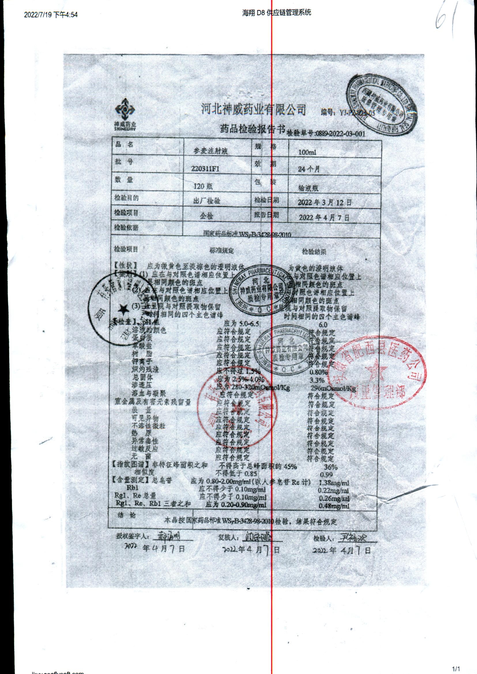 参麦注射液 | 100ml | 220311F1 | 查看详情 |