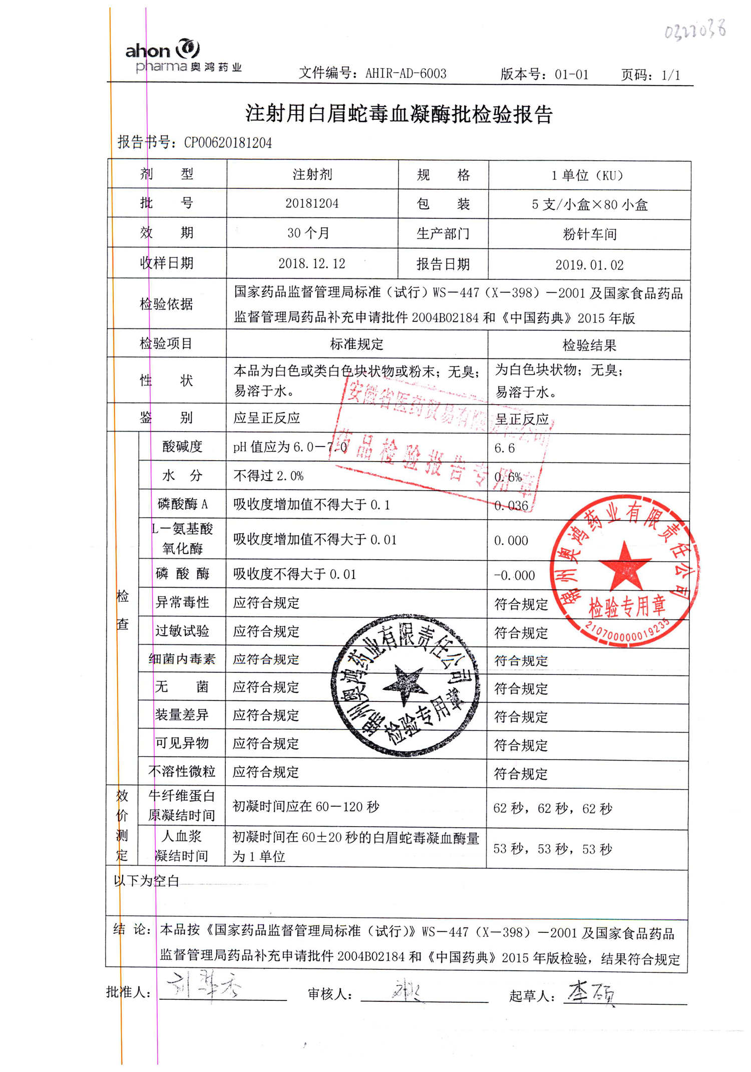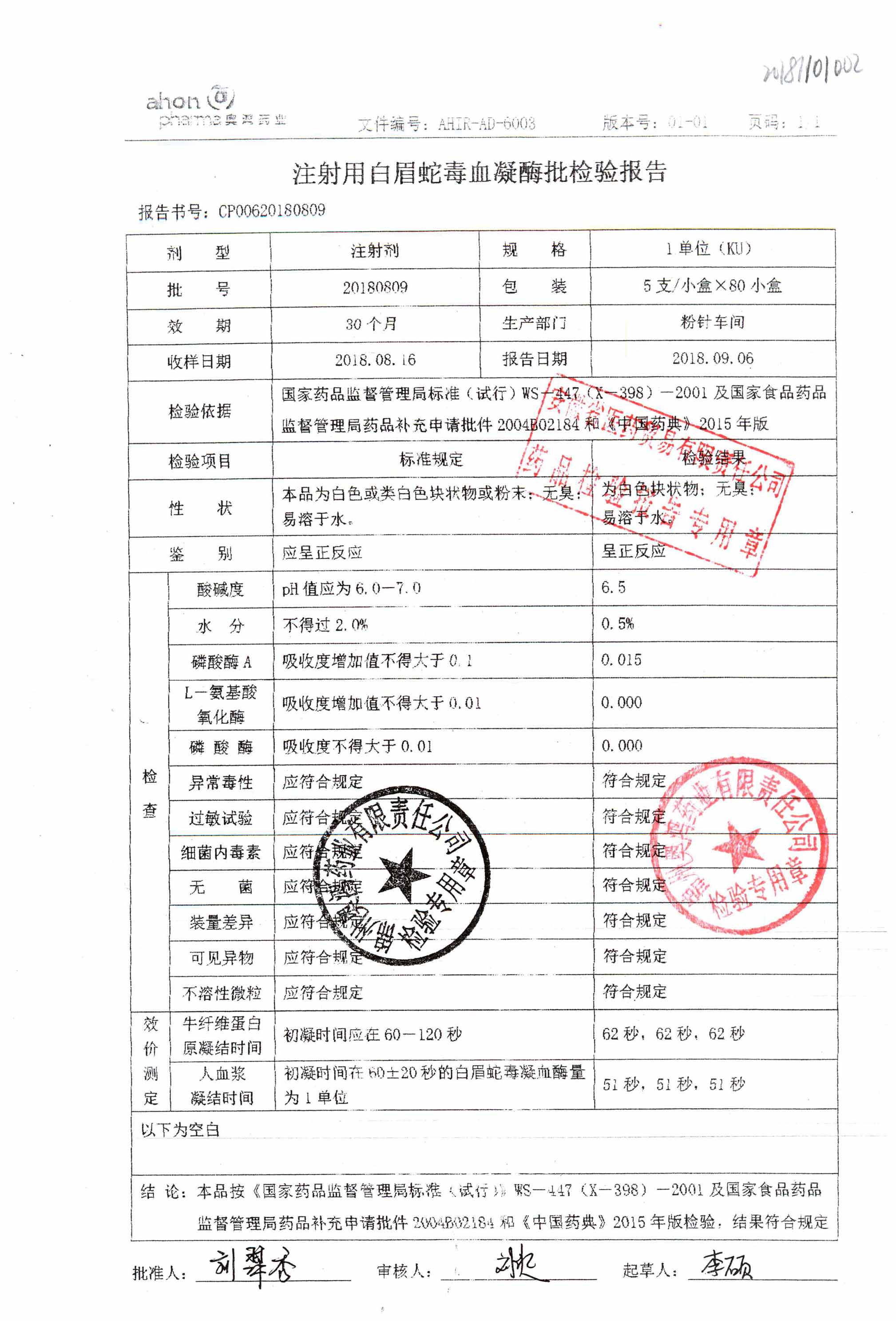 注射用白眉蛇毒血凝酶 | 1单位(KU)*5支 | 20180809 | 查看详情 |
