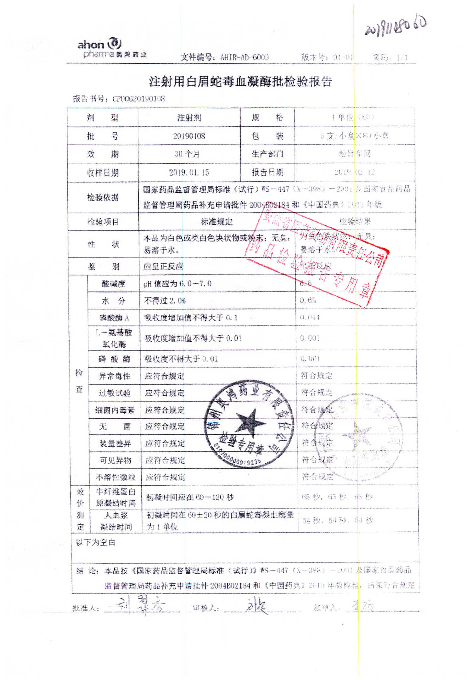 注射用白眉蛇毒血凝酶 | 1单位(KU)*5支 | 20190108 | 查看详情 |