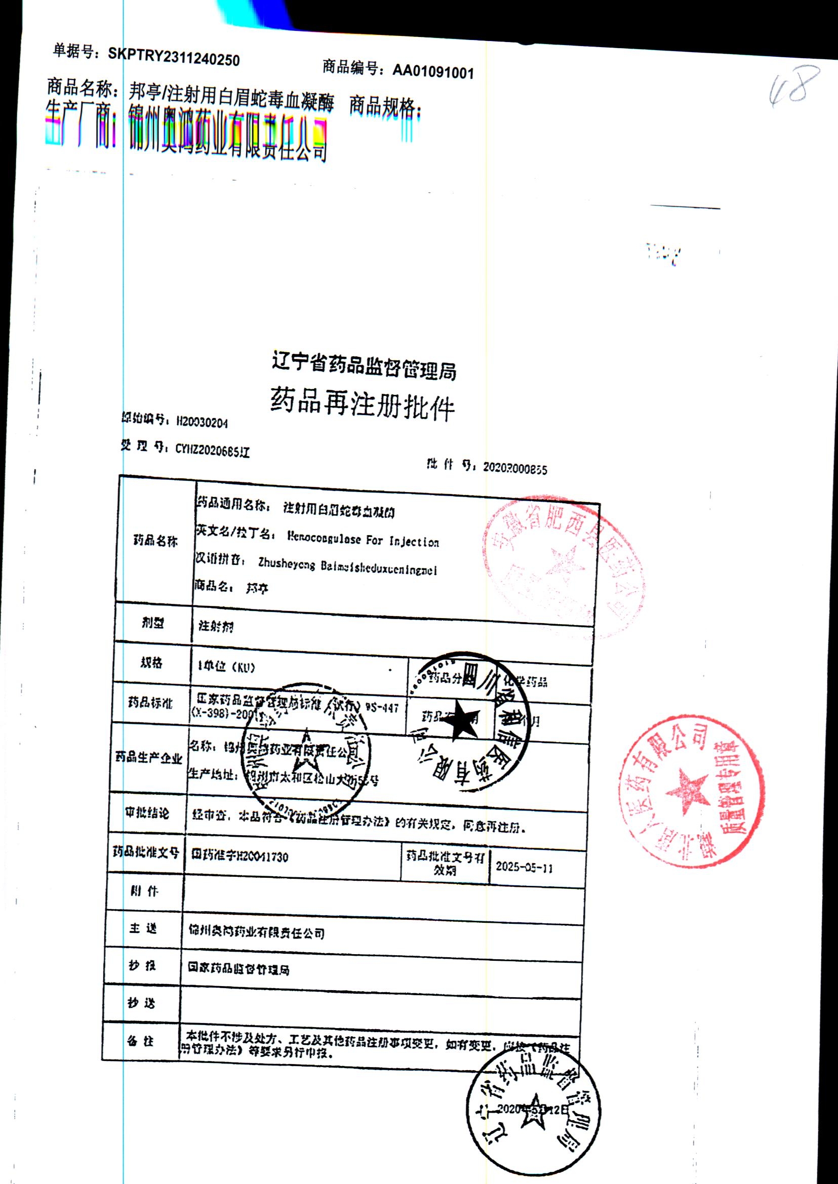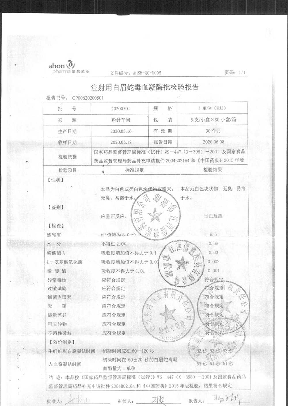 注射用白眉蛇毒血凝酶 | 1单位(KU)*5支 | 20200501 | 查看详情 |