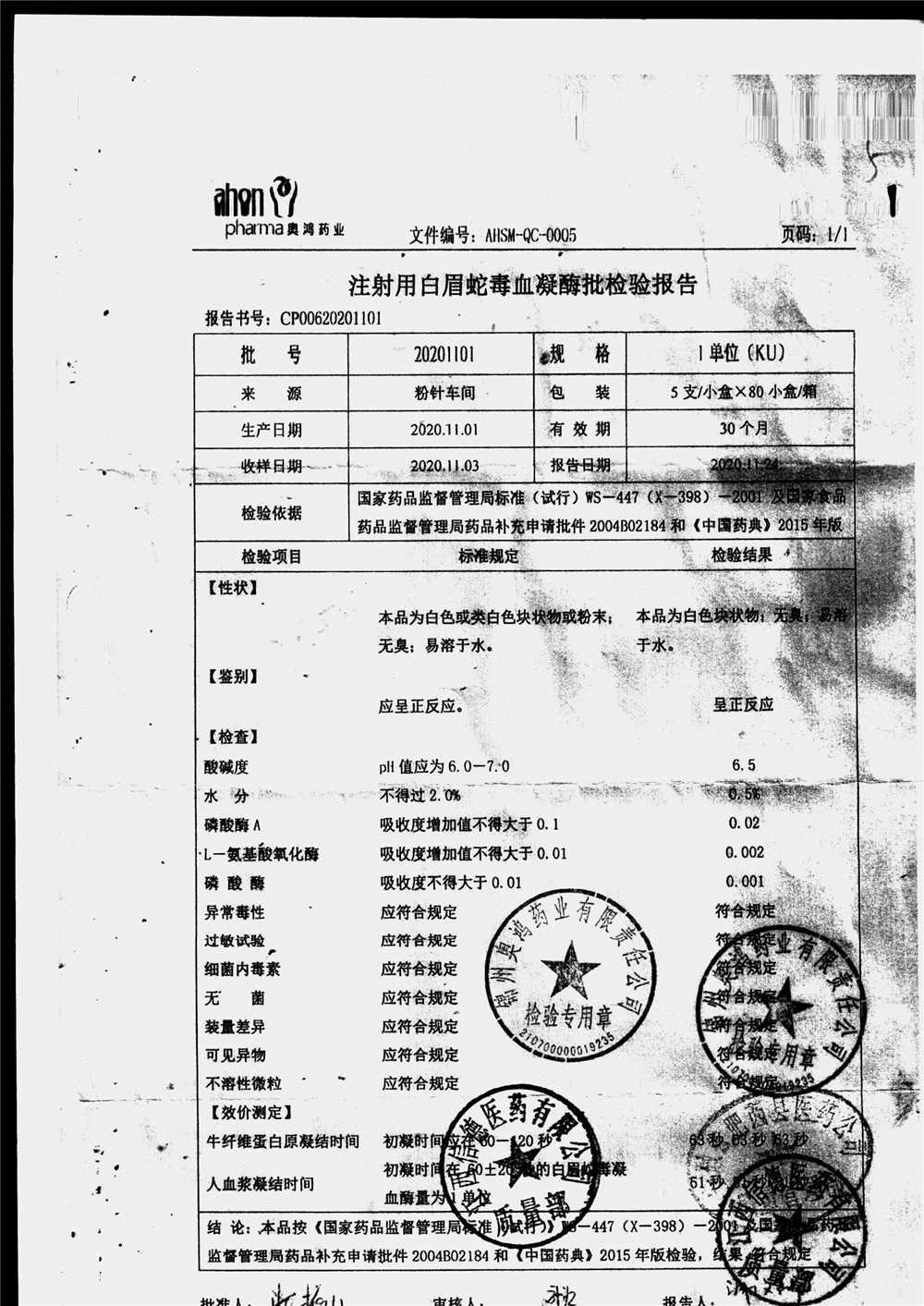 注射用白眉蛇毒血凝酶 | 1单位(KU)*5支 | 20201101 | 查看详情 |