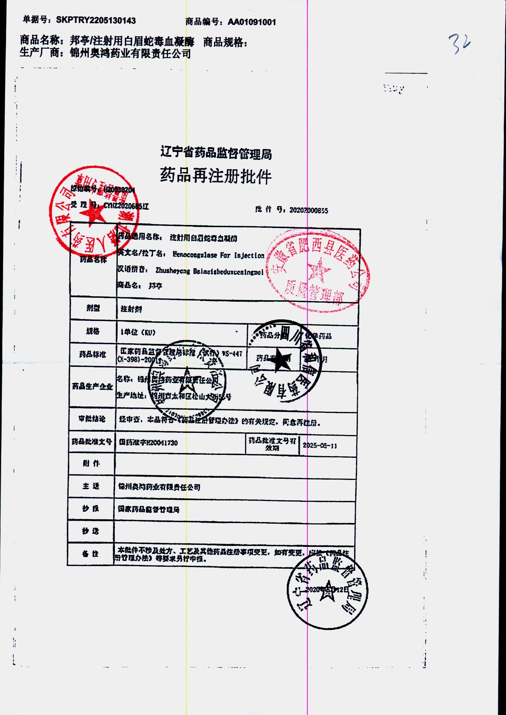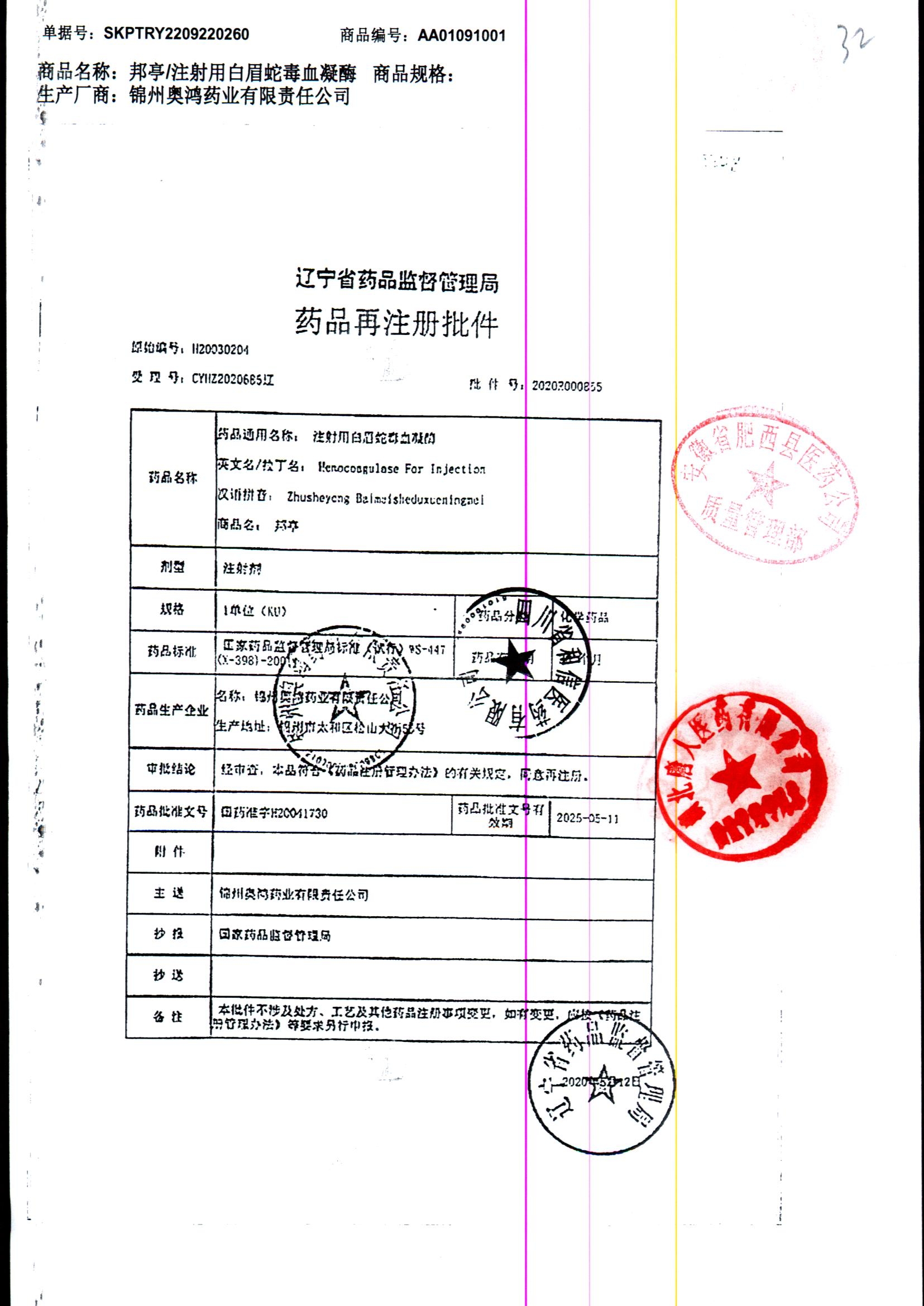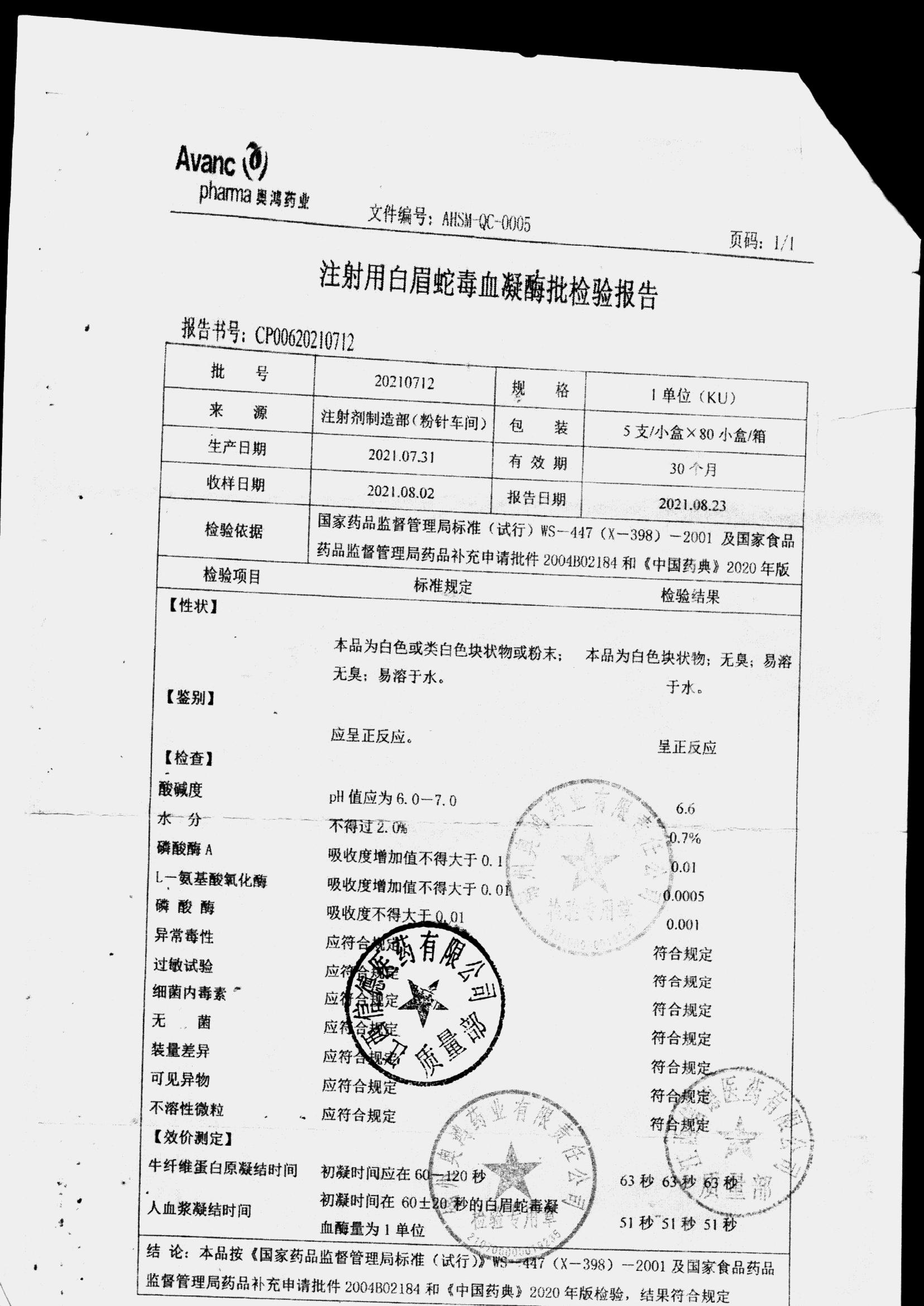 注射用白眉蛇毒血凝酶 | 1单位(KU)*5支 | 20210712 | 查看详情 |