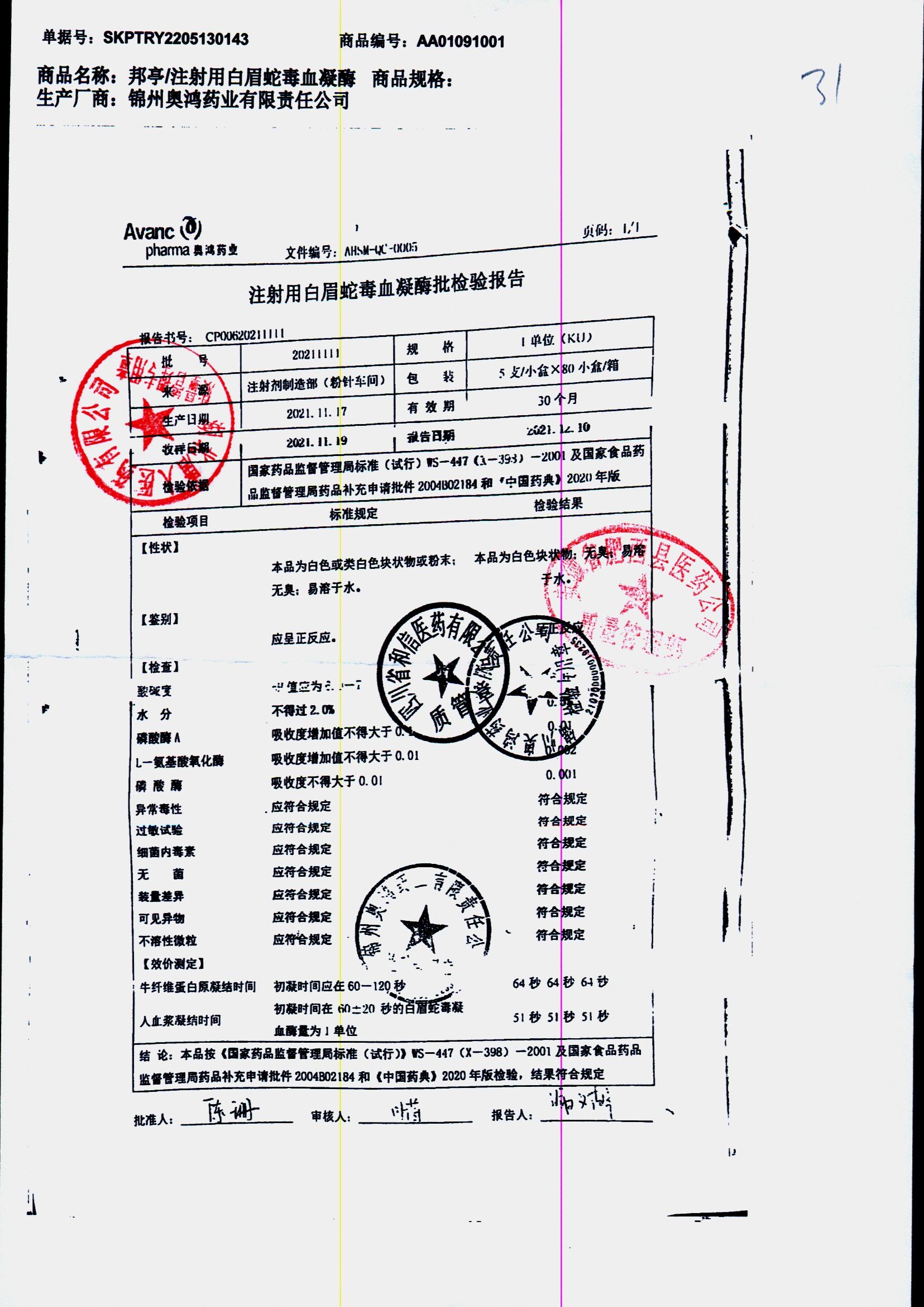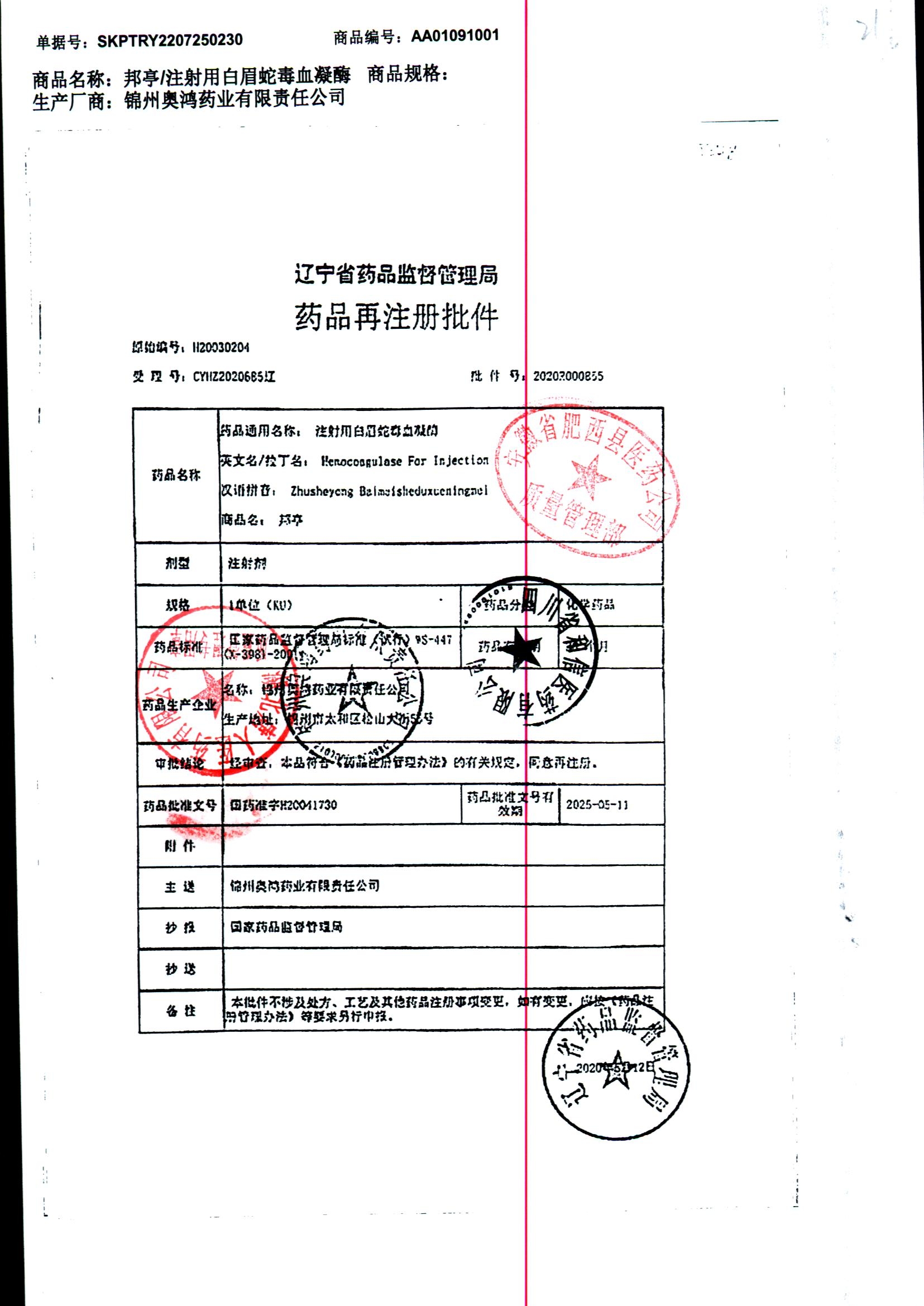 注射用白眉蛇毒血凝酶 | 1单位(KU)*5支 | 20211111/1 | 查看详情 |