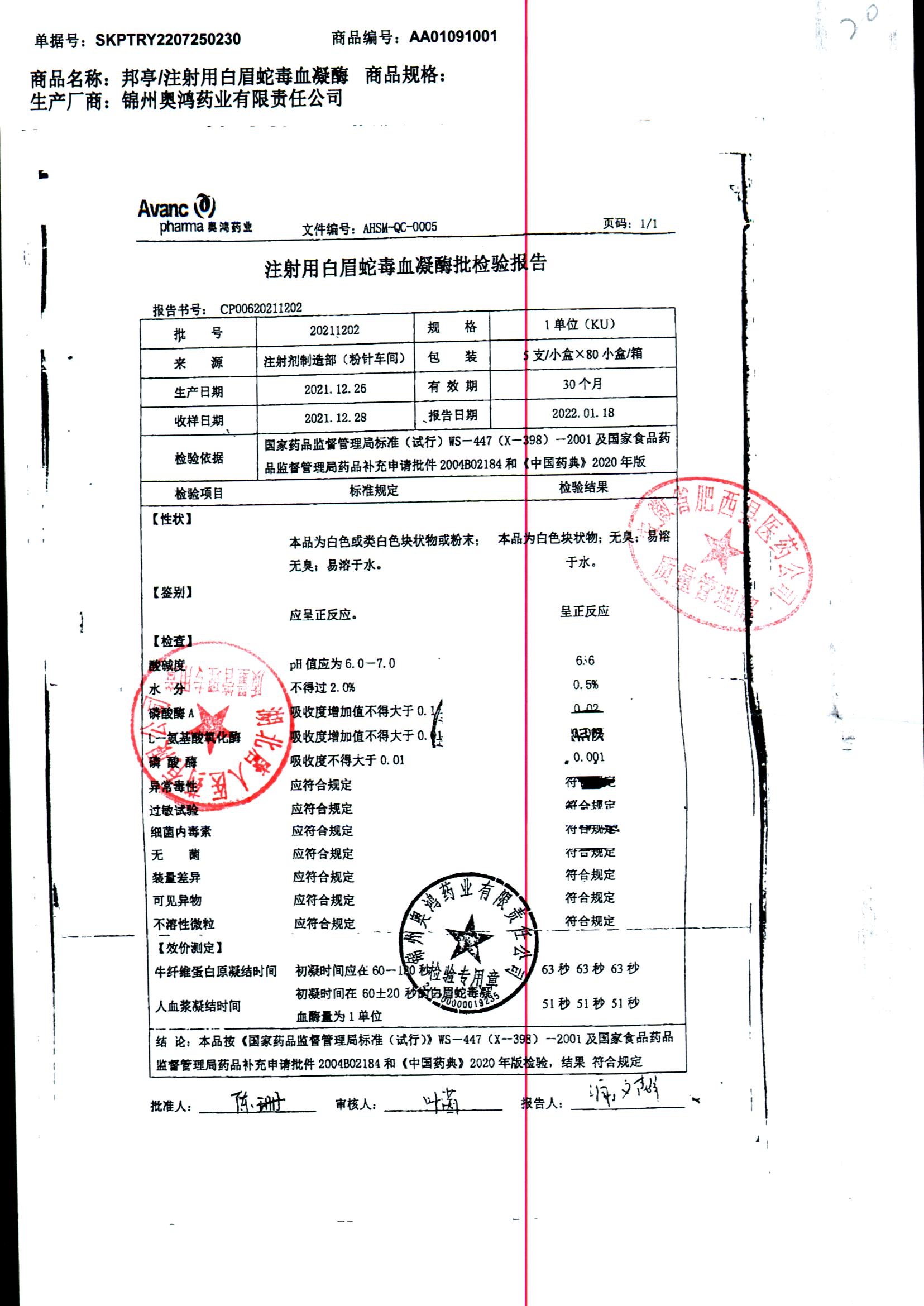 注射用白眉蛇毒血凝酶 | 1单位(KU)*5支 | 20211202/2 | 查看详情 |