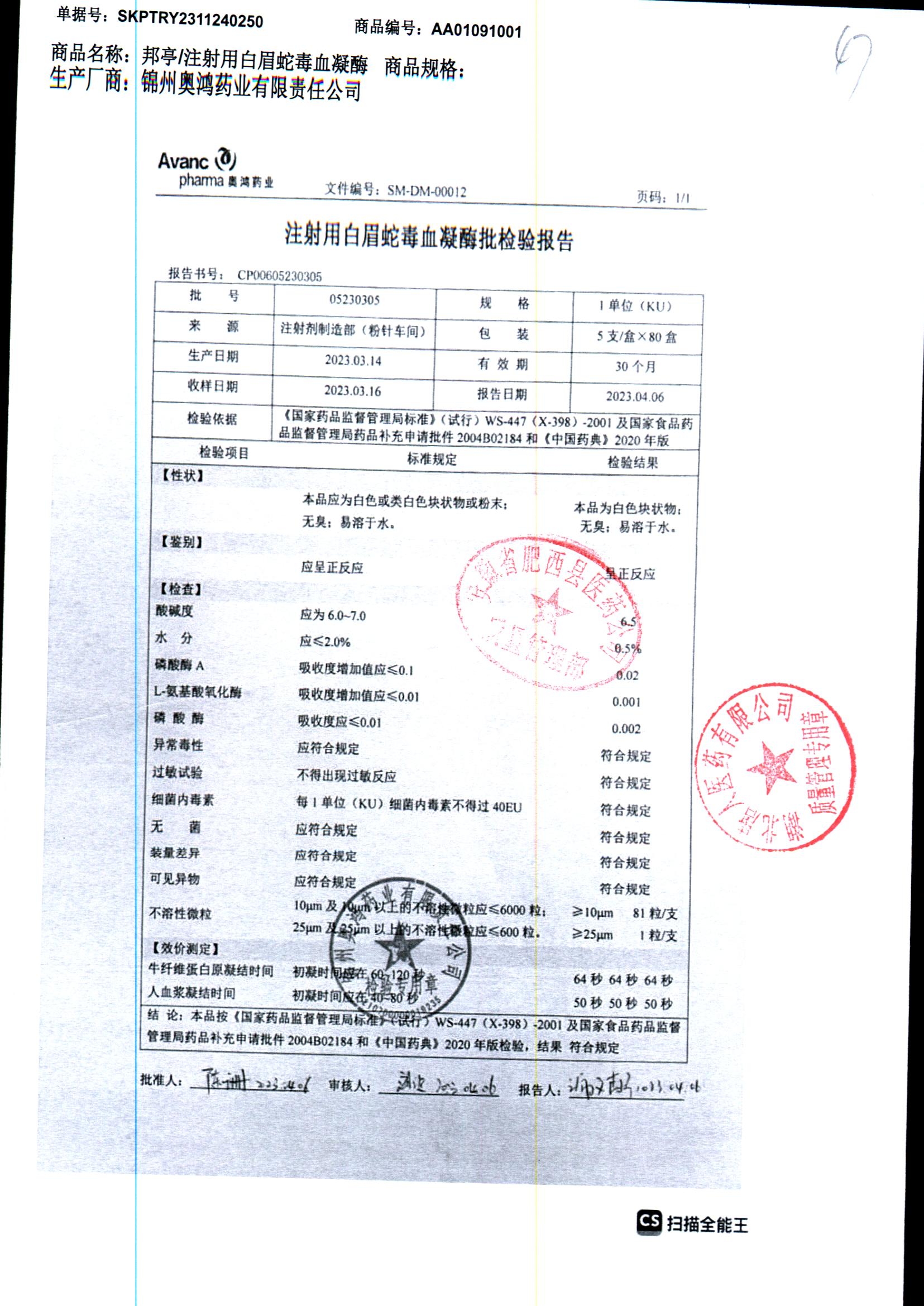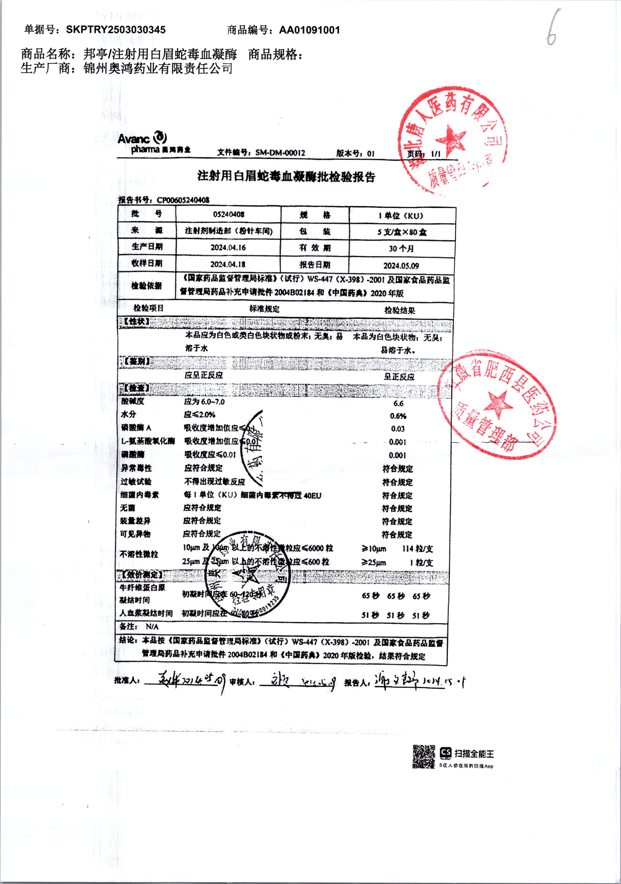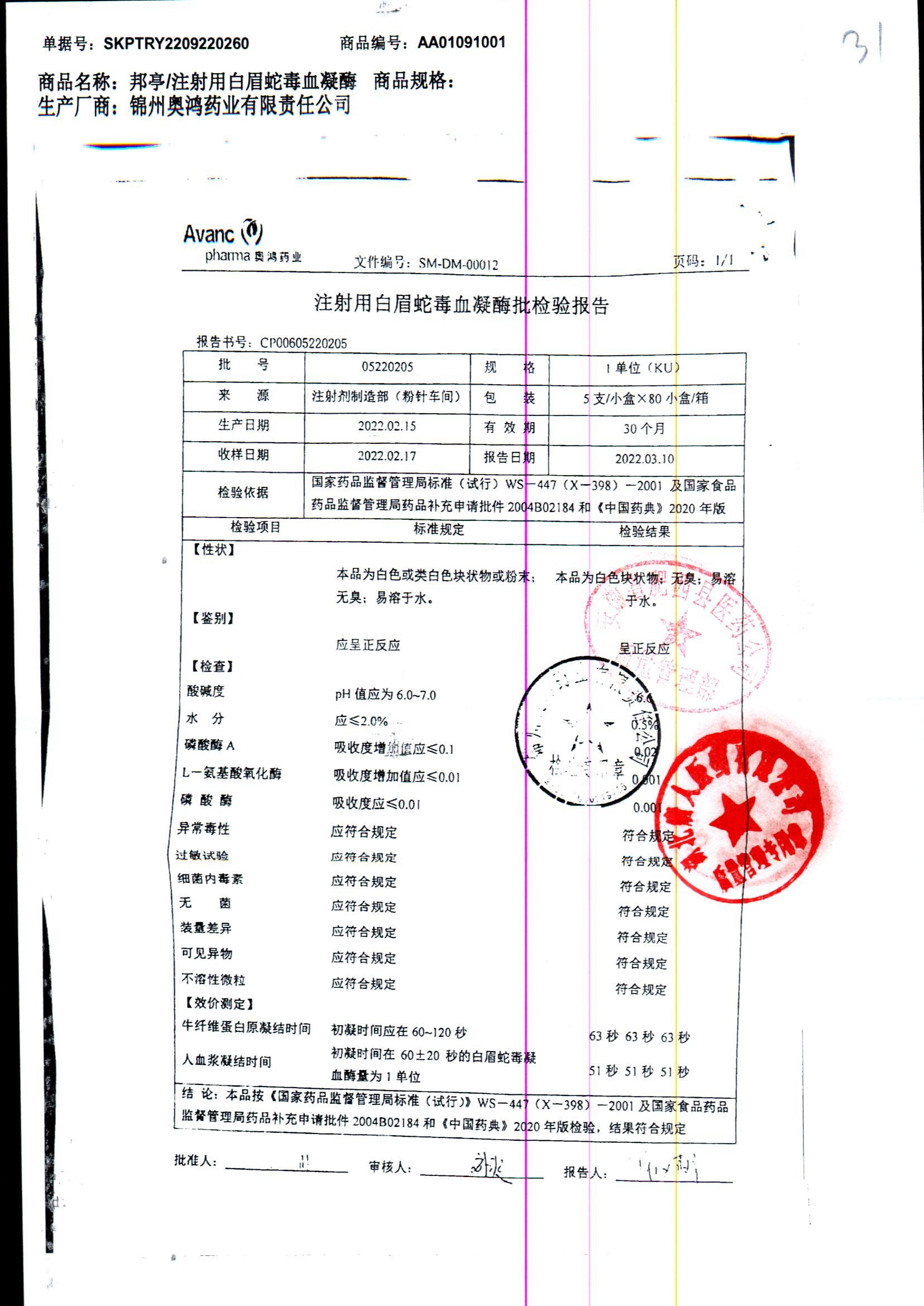 注射用白眉蛇毒血凝酶 | 1单位(KU)*5支 | 20210504 | 查看详情 |