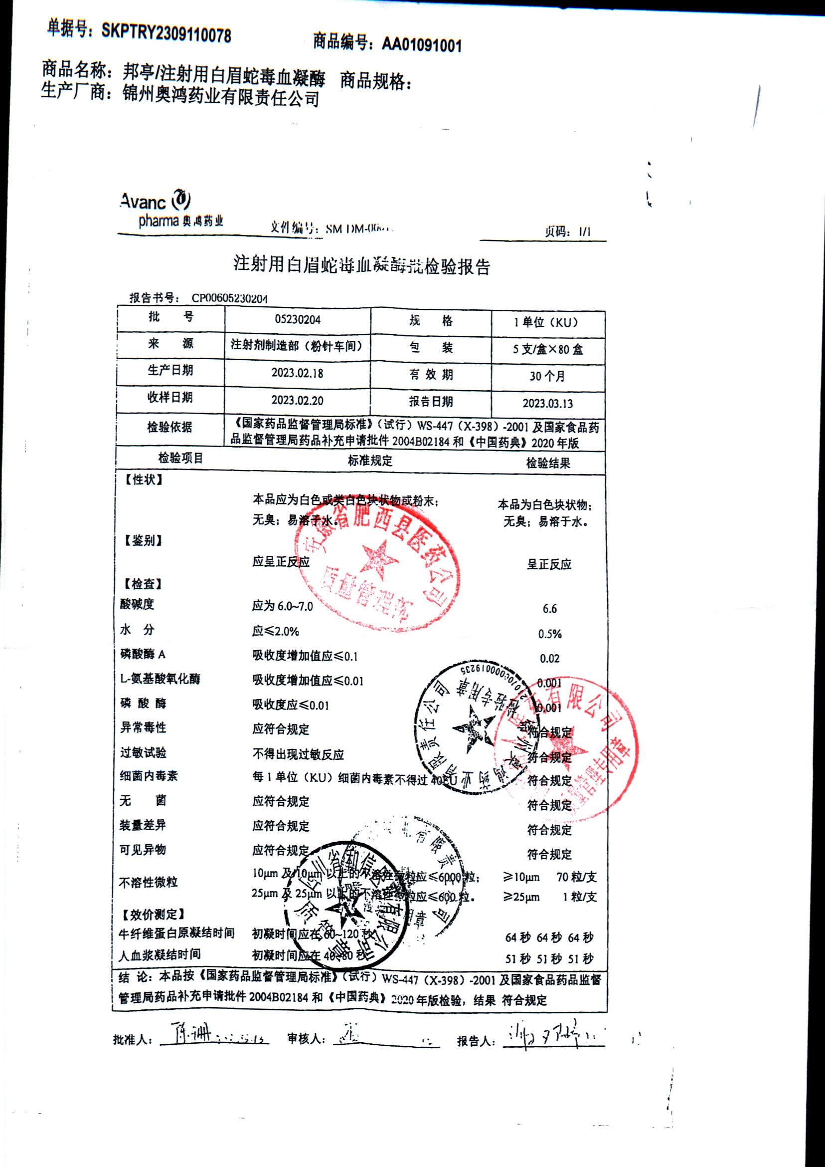注射用白眉蛇毒血凝酶 | 1单位(KU)*5支 | 20211111/2 | 查看详情 |