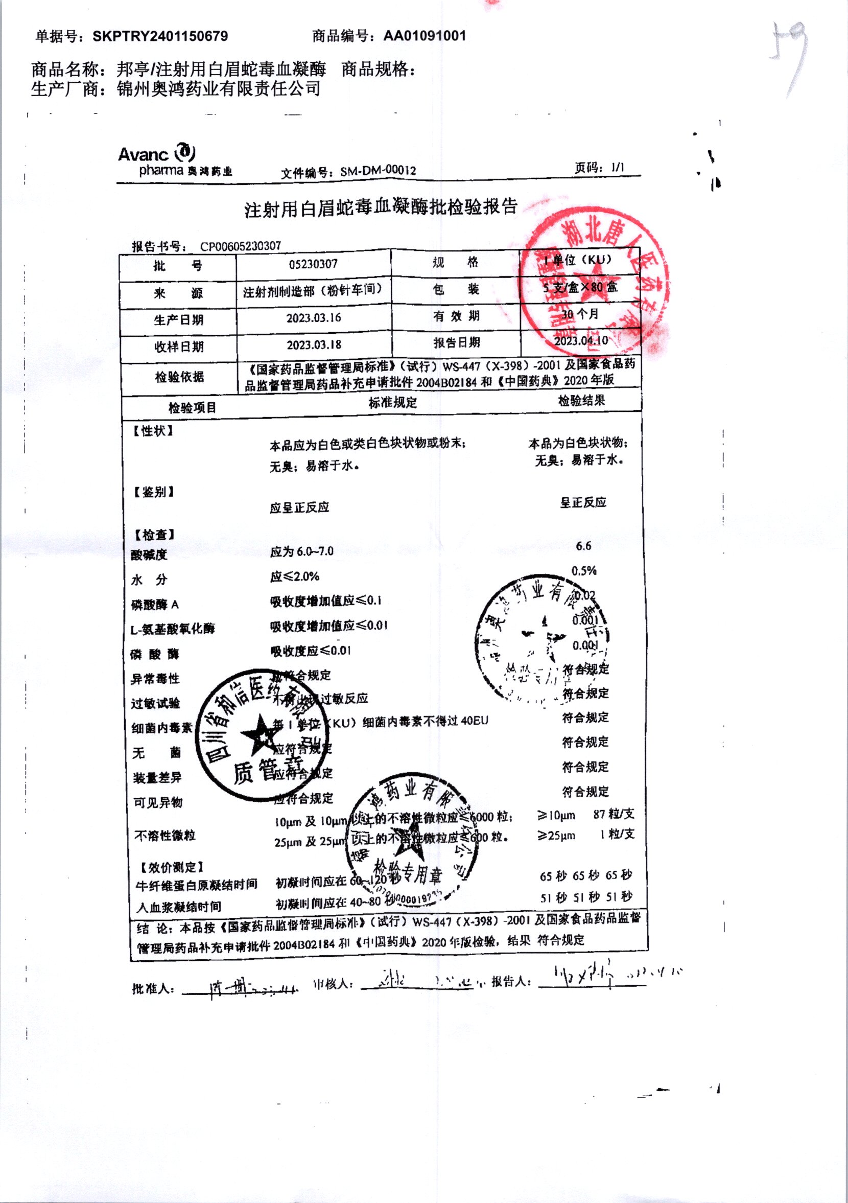注射用白眉蛇毒血凝酶 | 1单位(KU)*5支 | 05240408 | 查看详情 |
