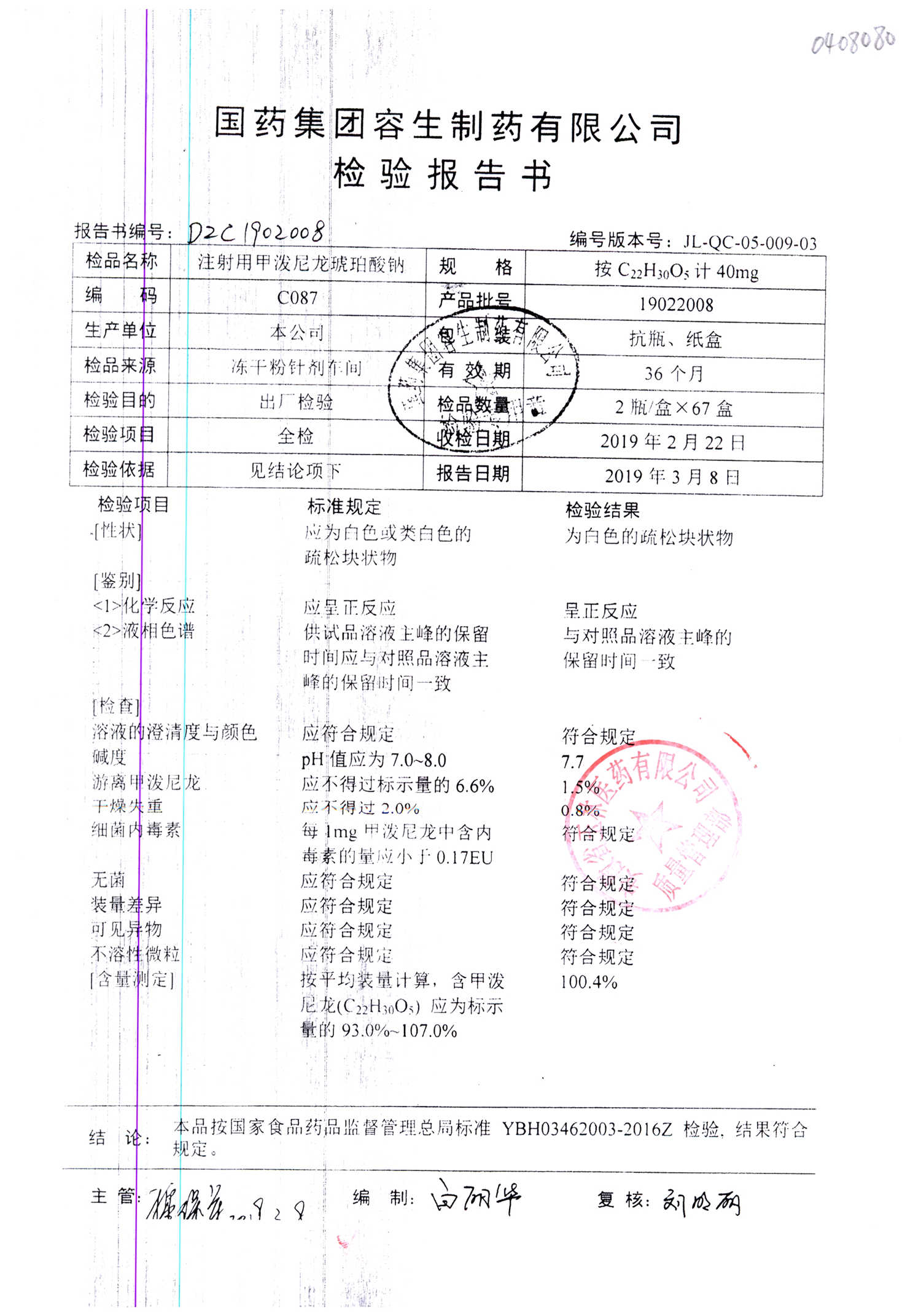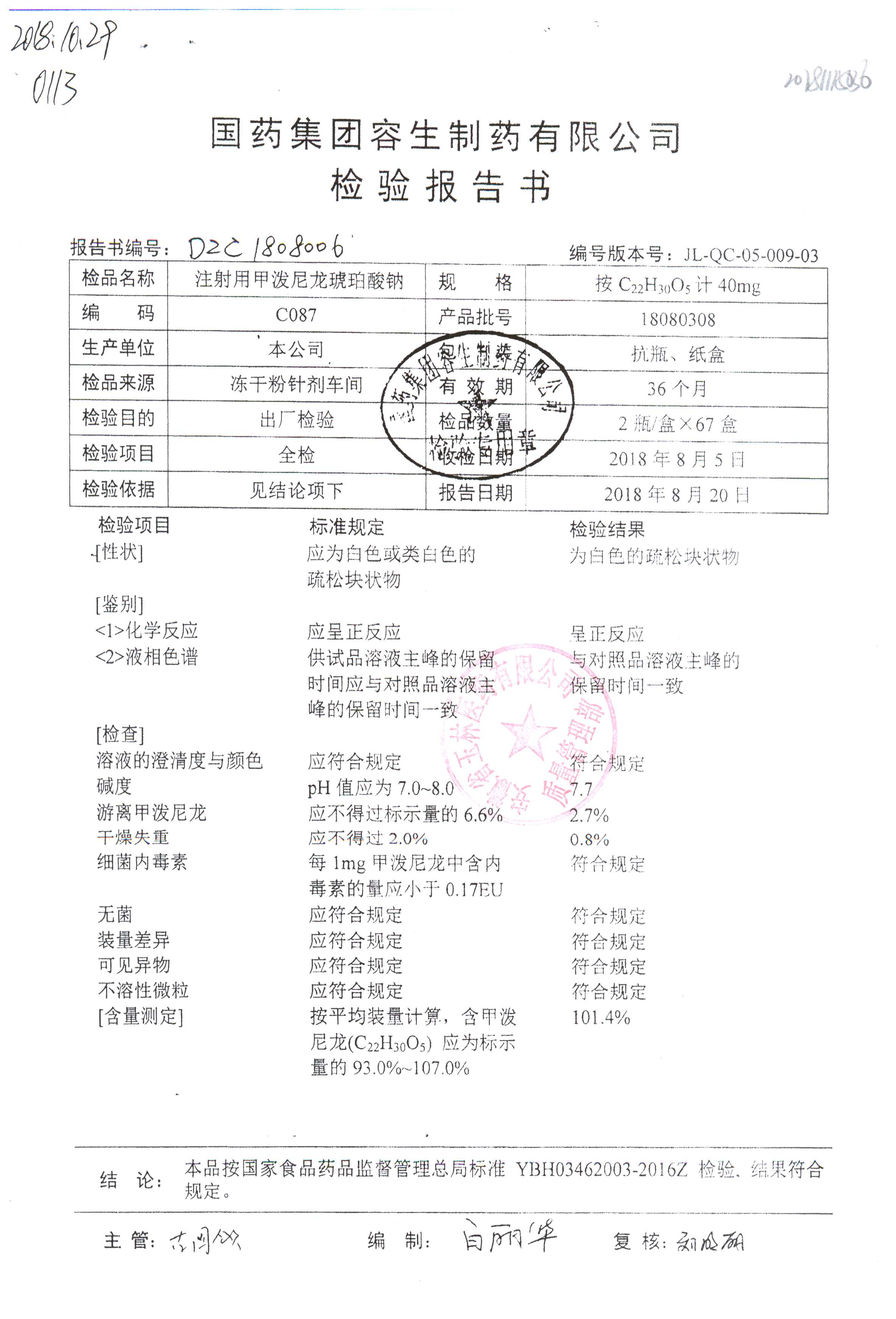 注射用甲泼尼龙琥珀酸钠 | 40mg | 18080308 | 查看详情 |