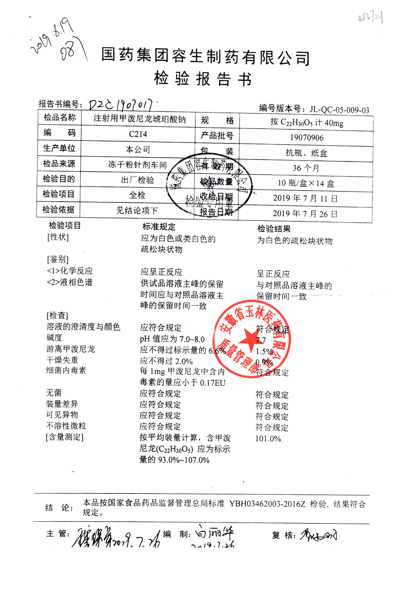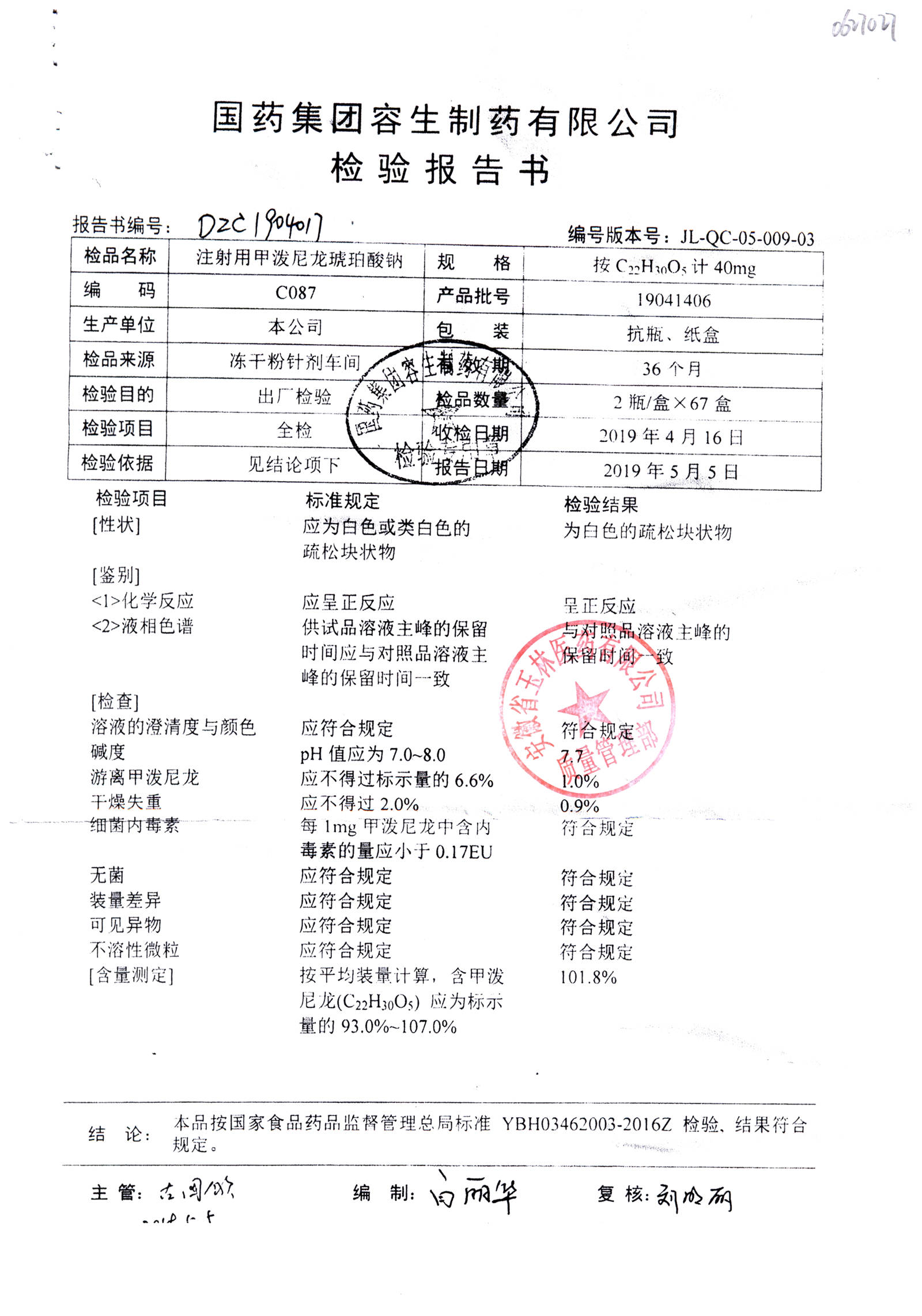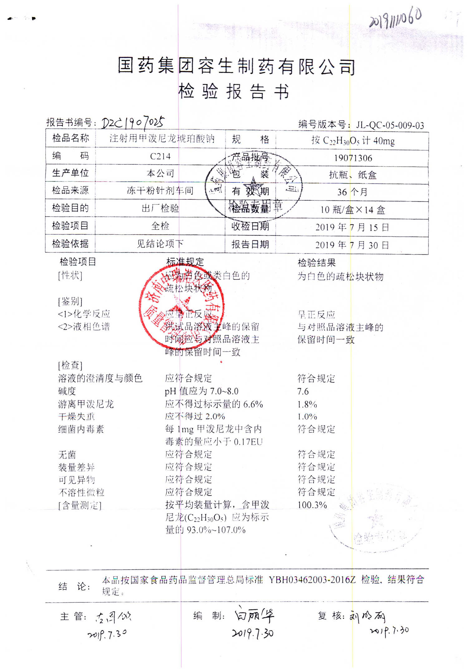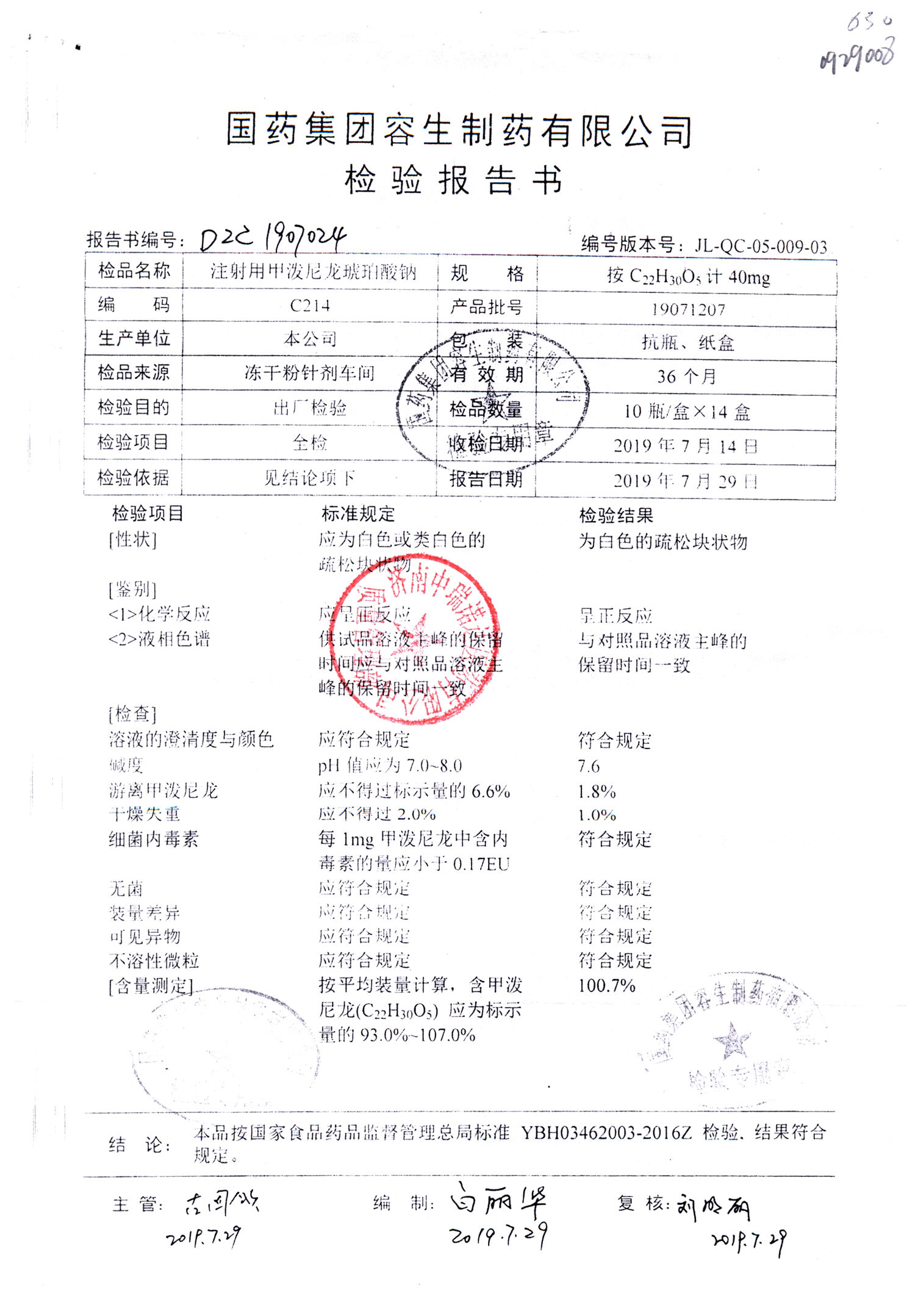 注射用甲泼尼龙琥珀酸钠 | 40mg | 19071207 | 查看详情 |