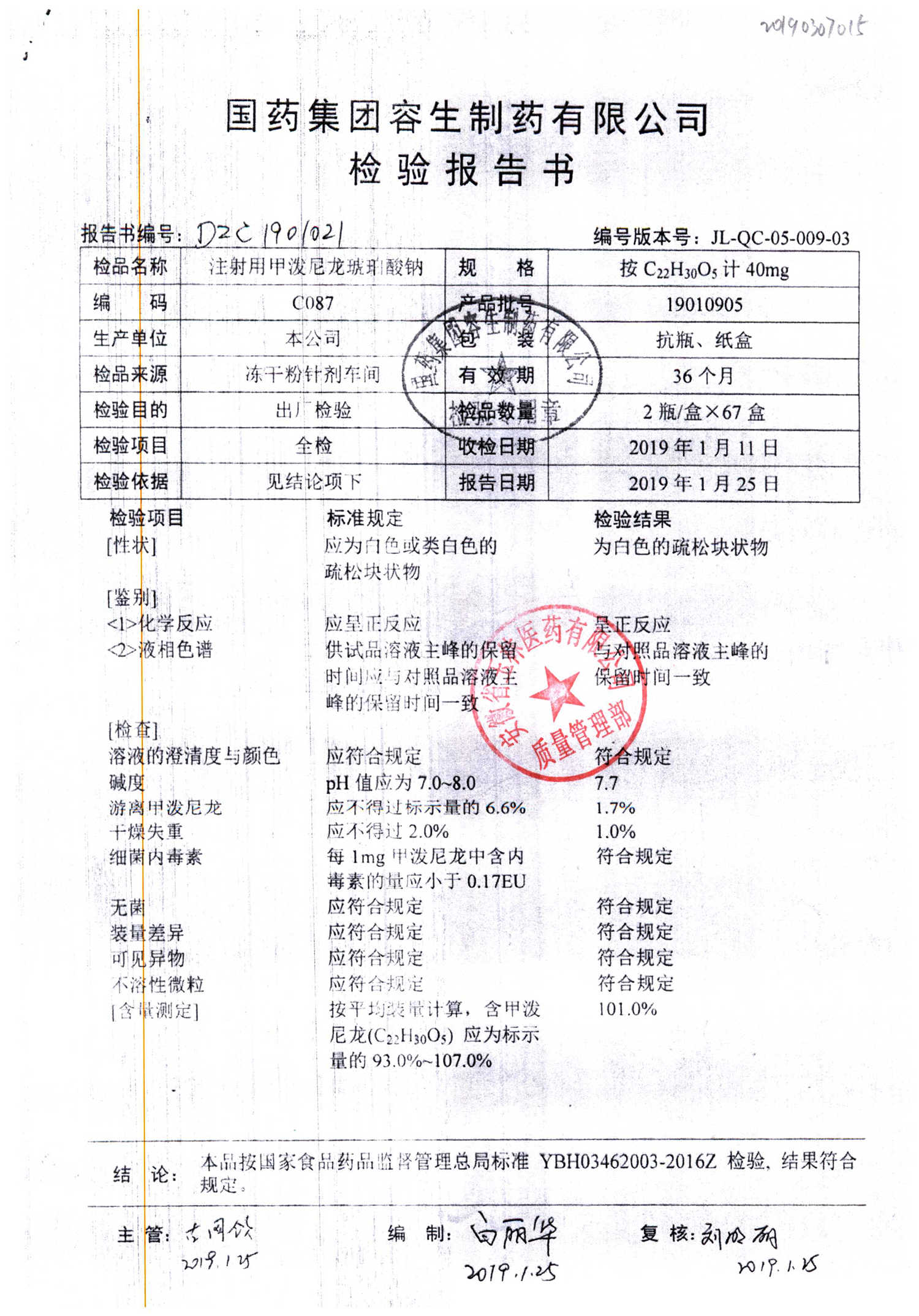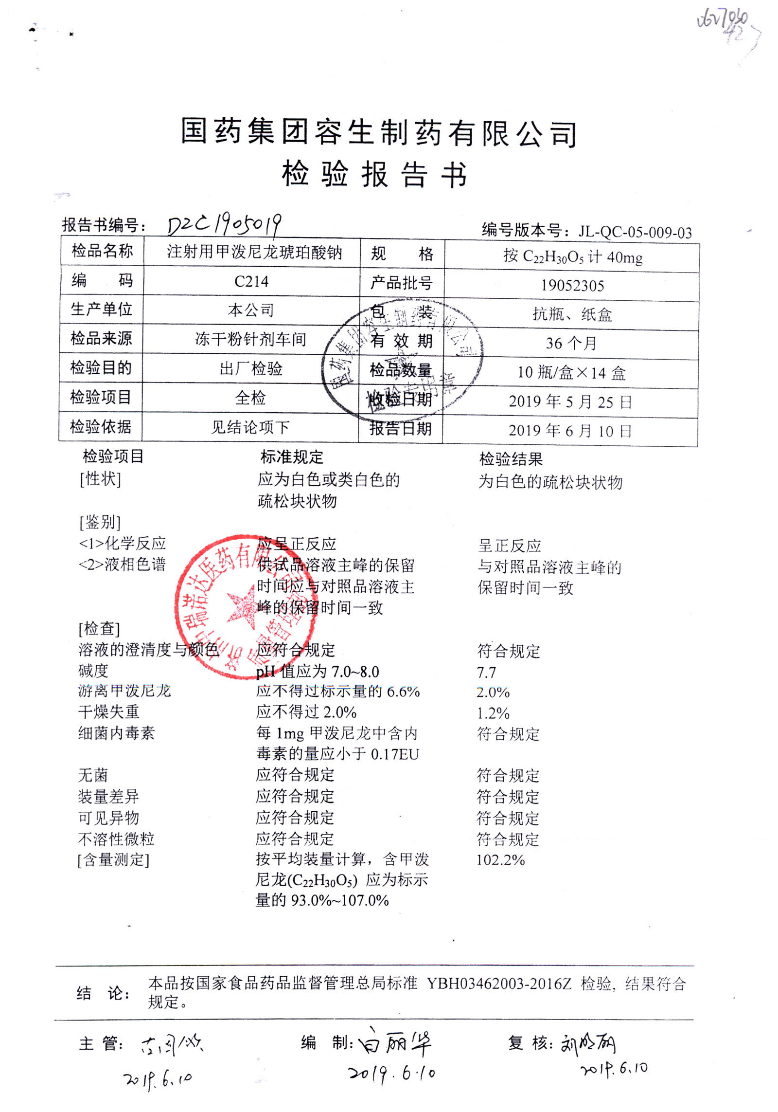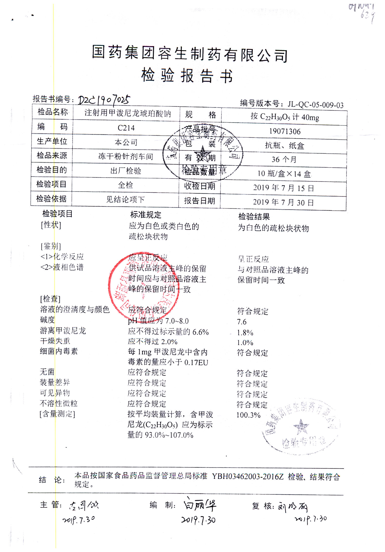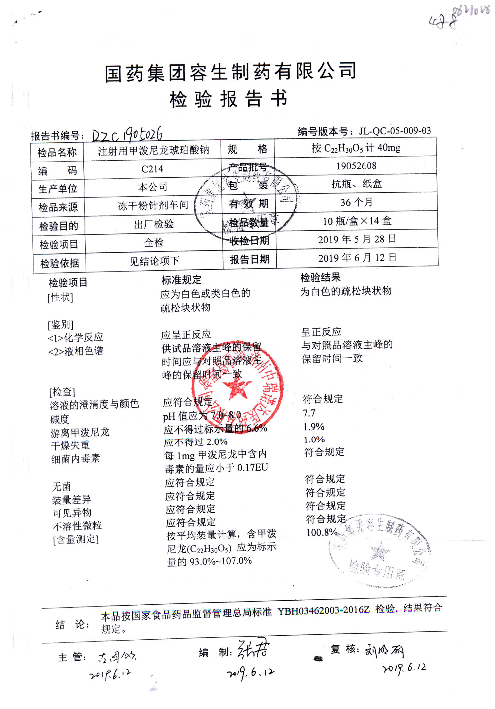 注射用甲泼尼龙琥珀酸钠 | 40mg | 19071207 | 查看详情 |