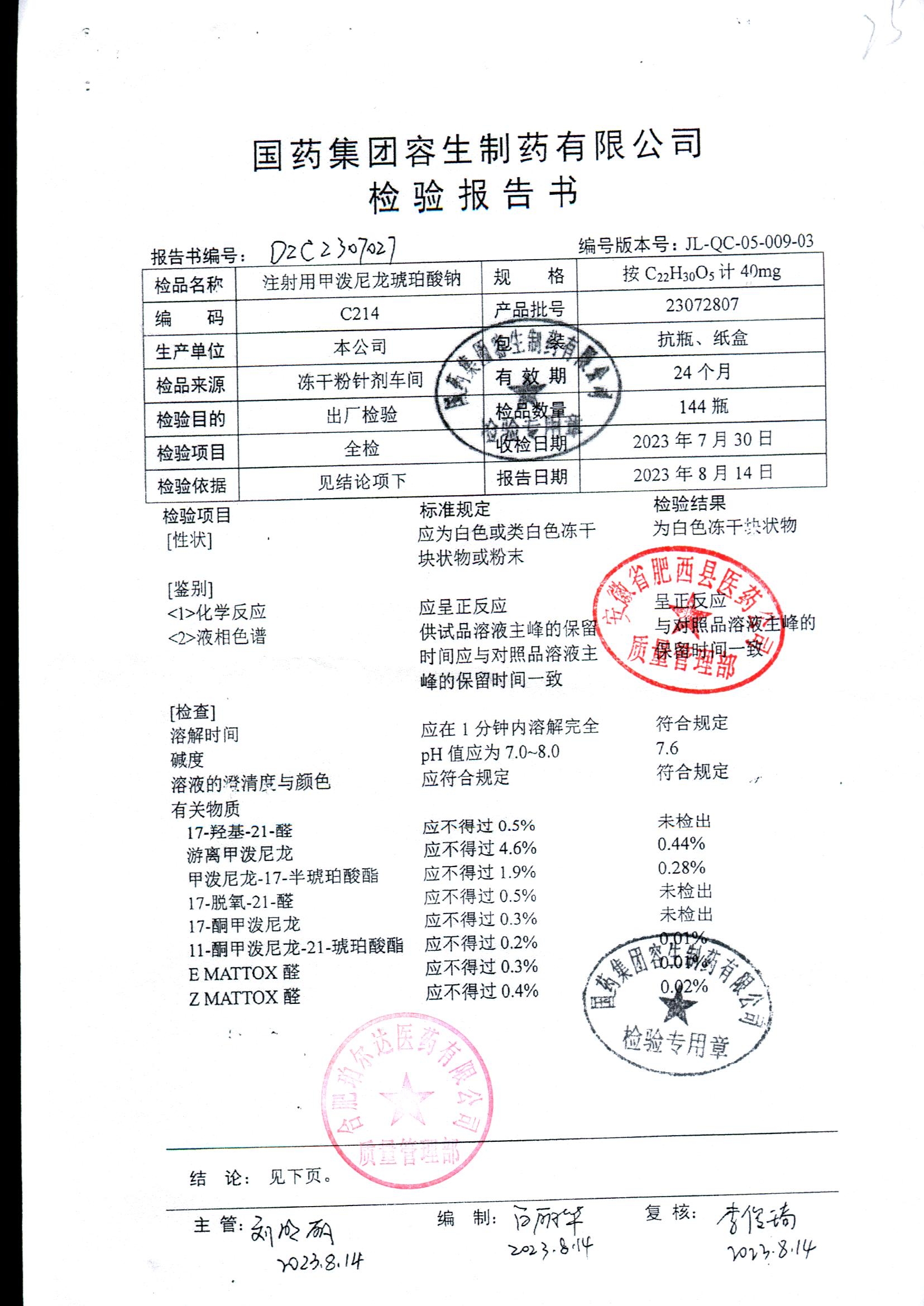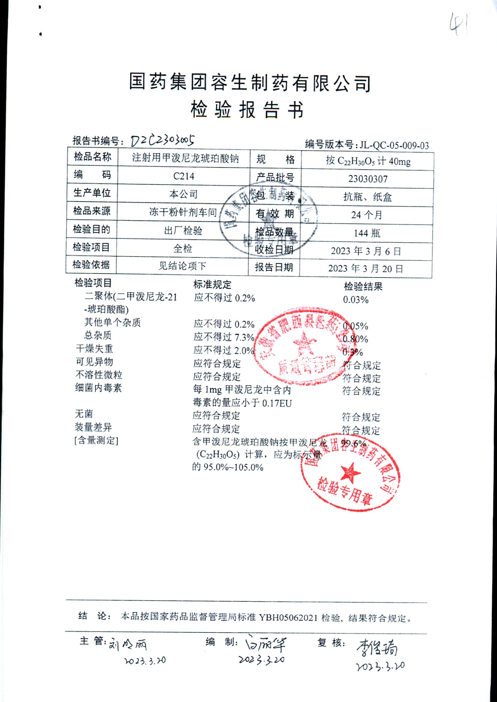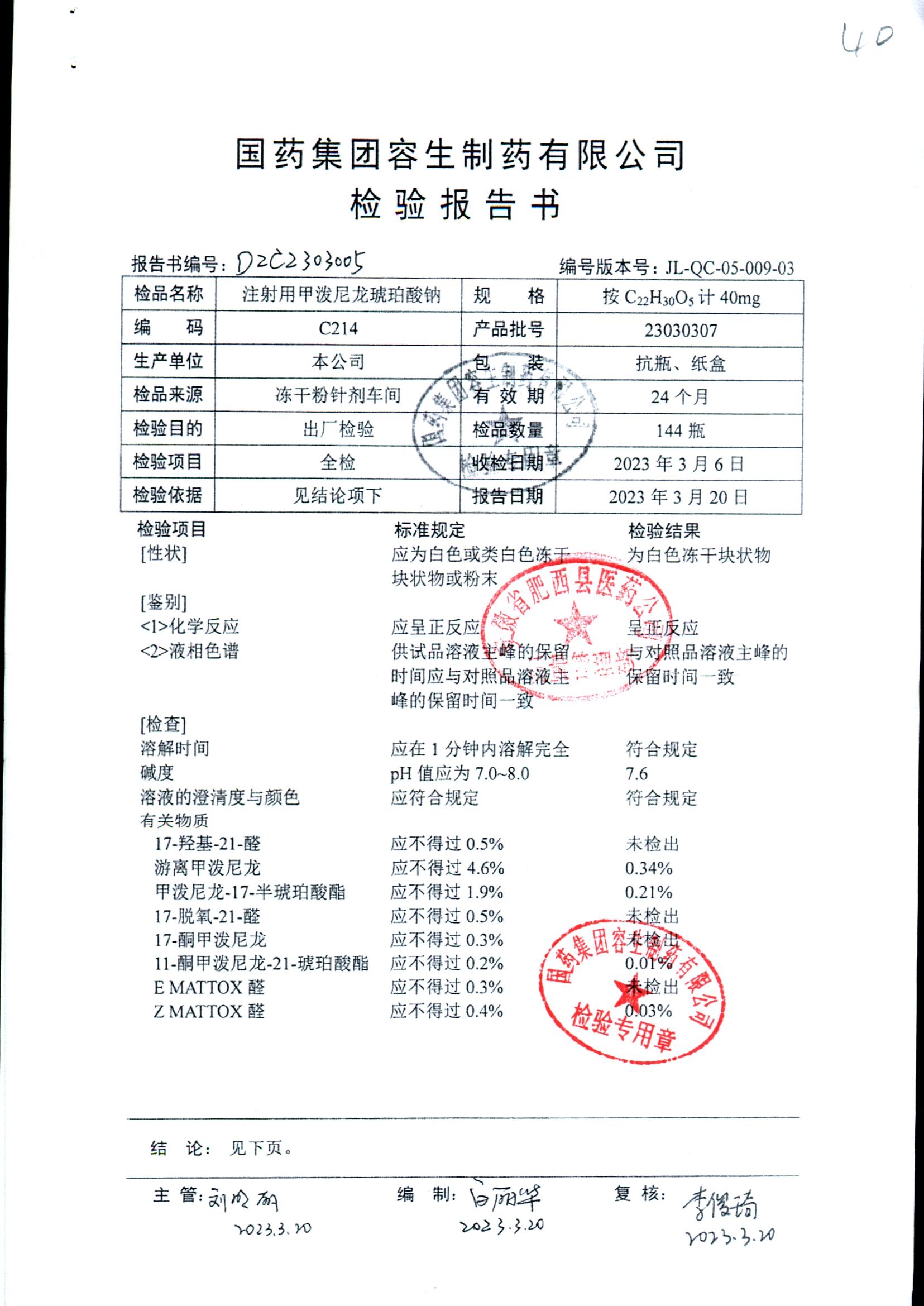 注射用甲泼尼龙琥珀酸钠 | 40mg | 23030307 | 查看详情 |