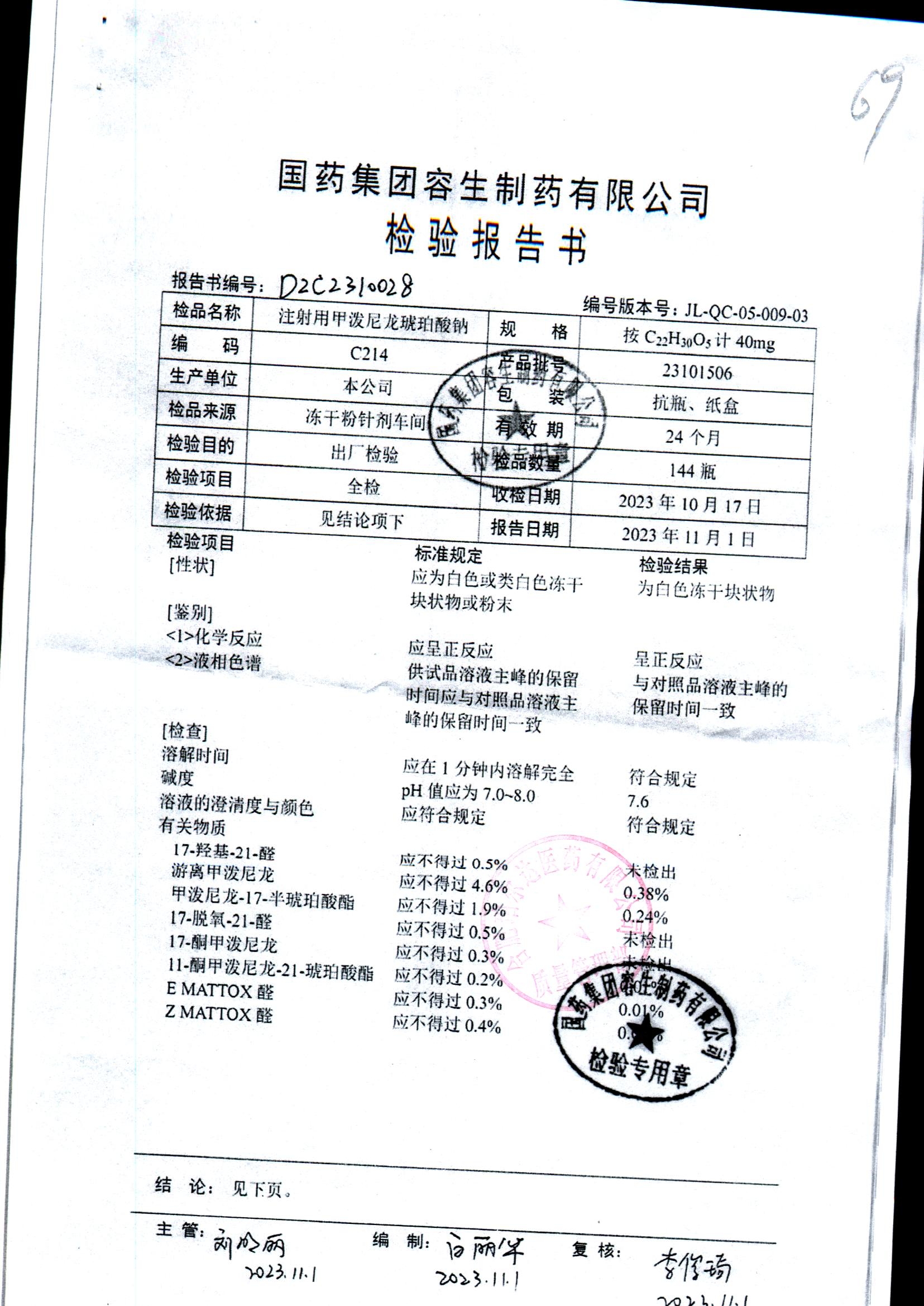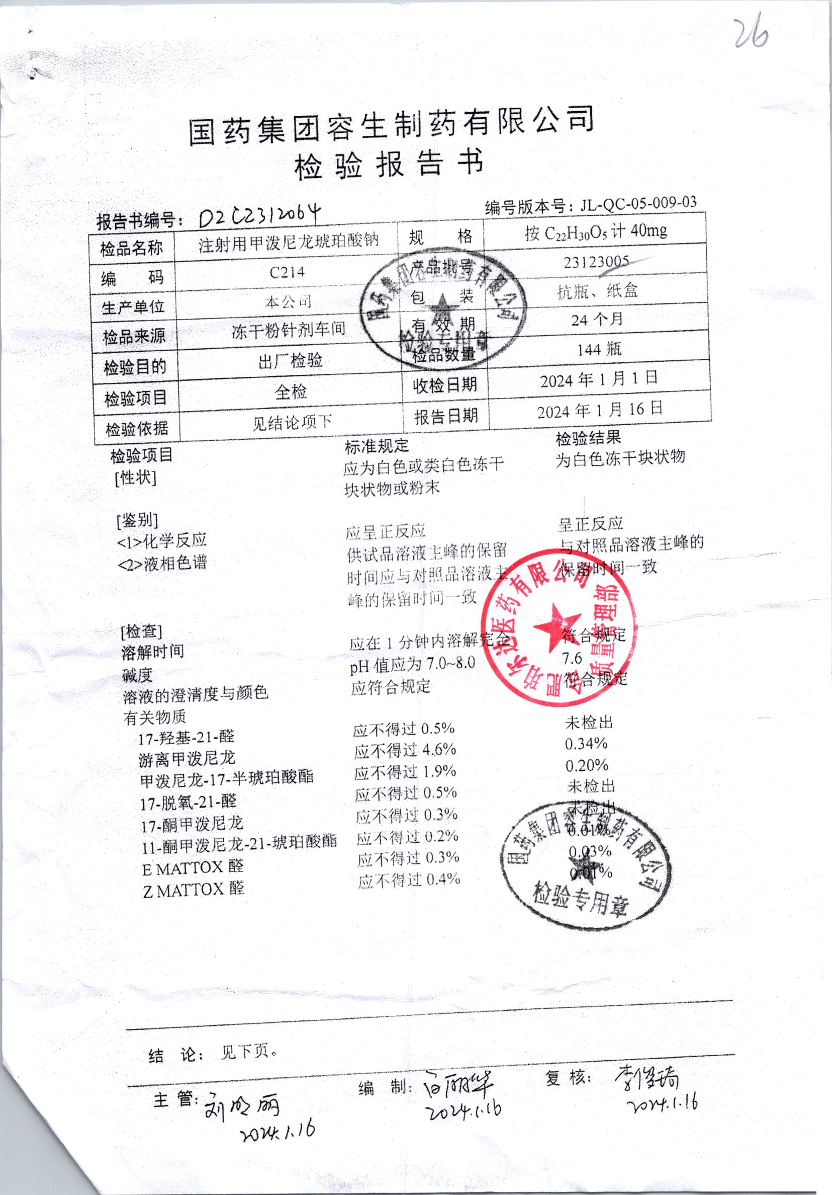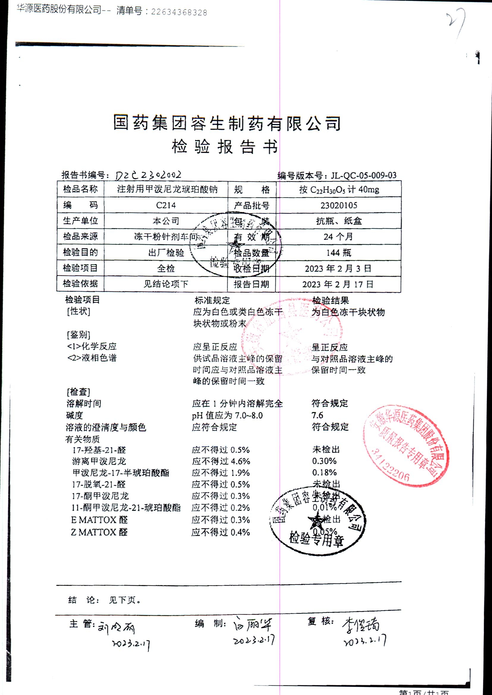 注射用甲泼尼龙琥珀酸钠 | 40mg | 23030307 | 查看详情 |