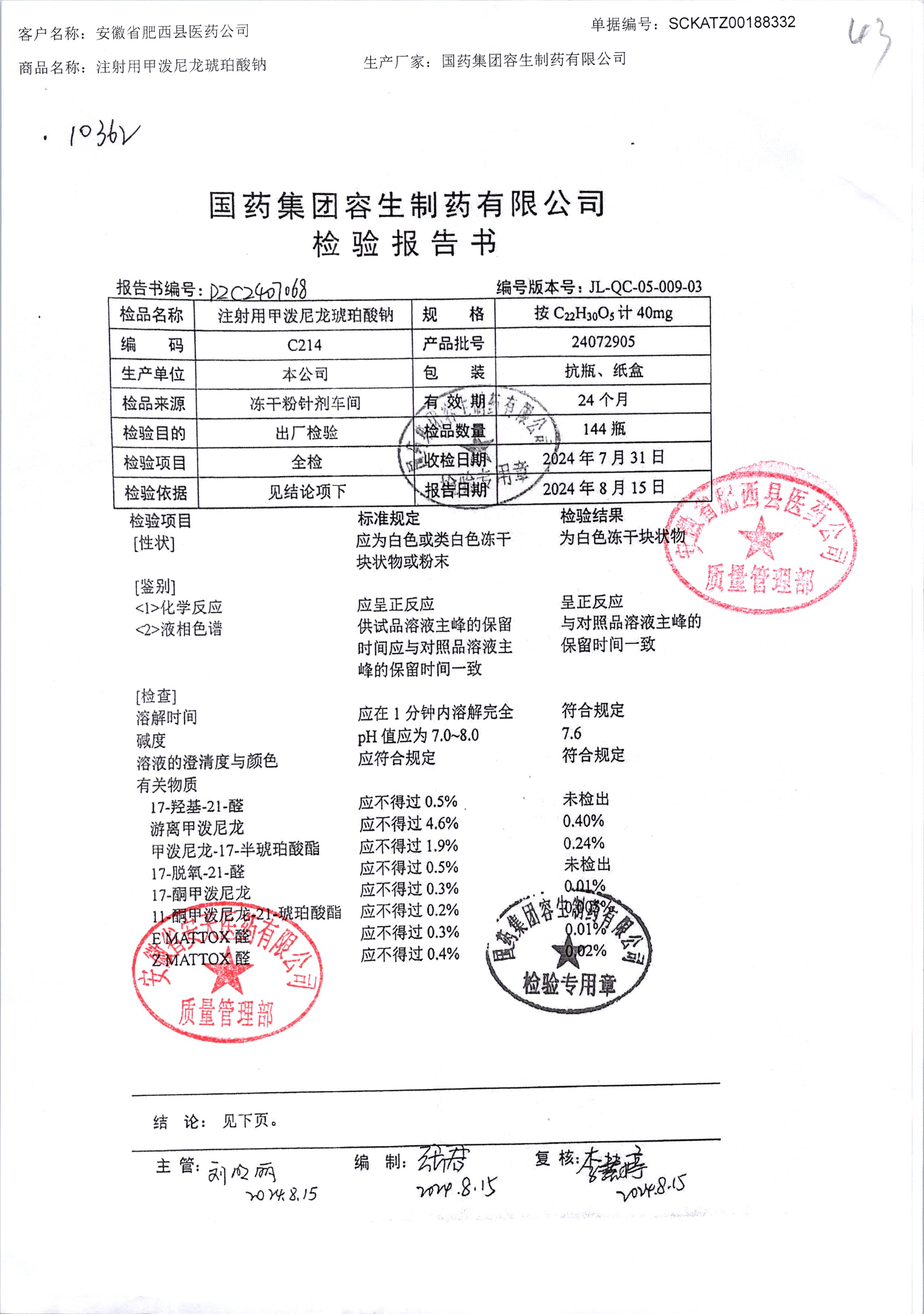 注射用甲泼尼龙琥珀酸钠 | 40mg | 23020105 | 查看详情 |