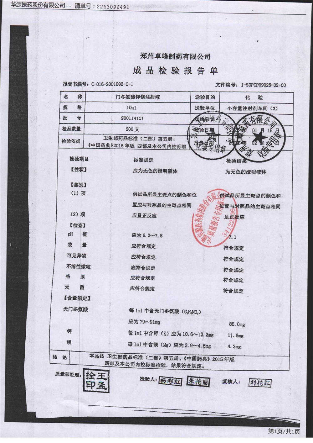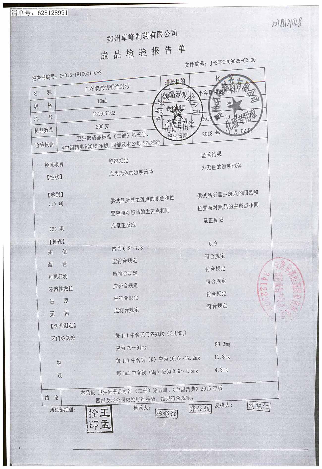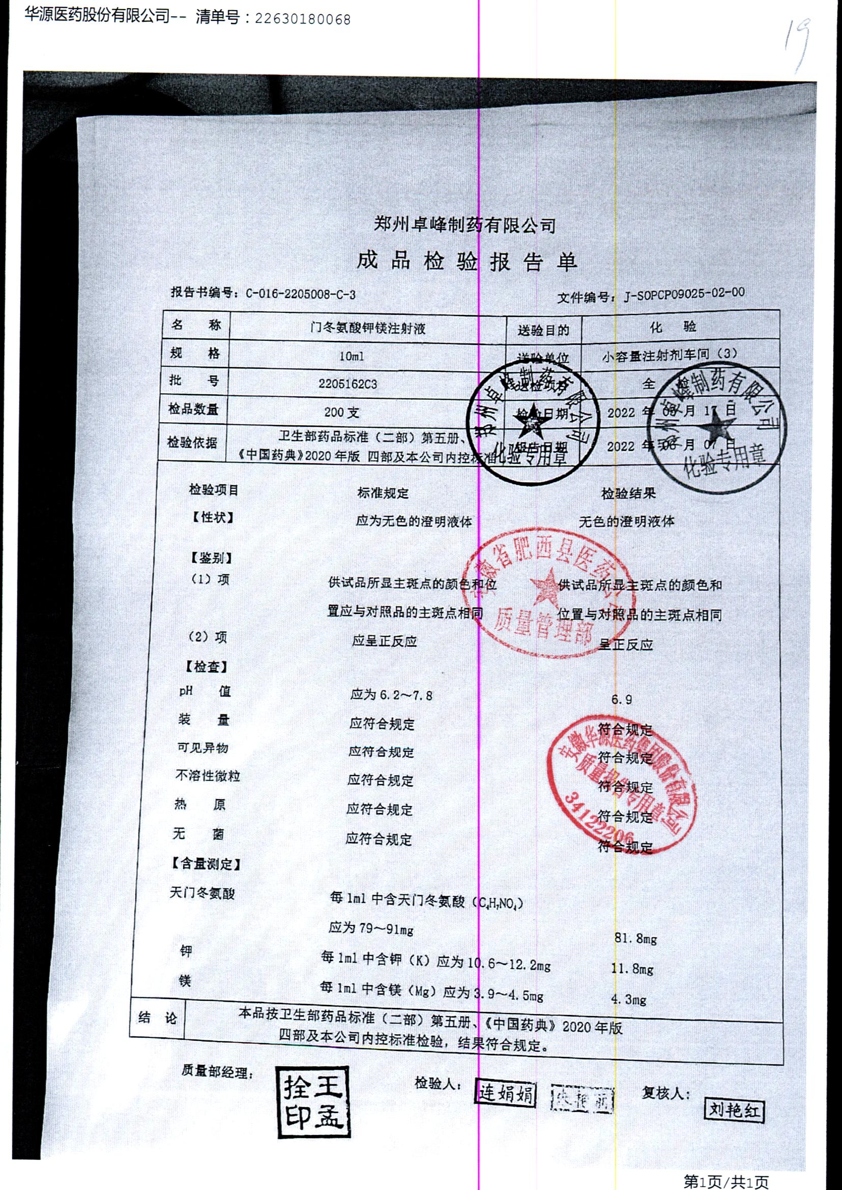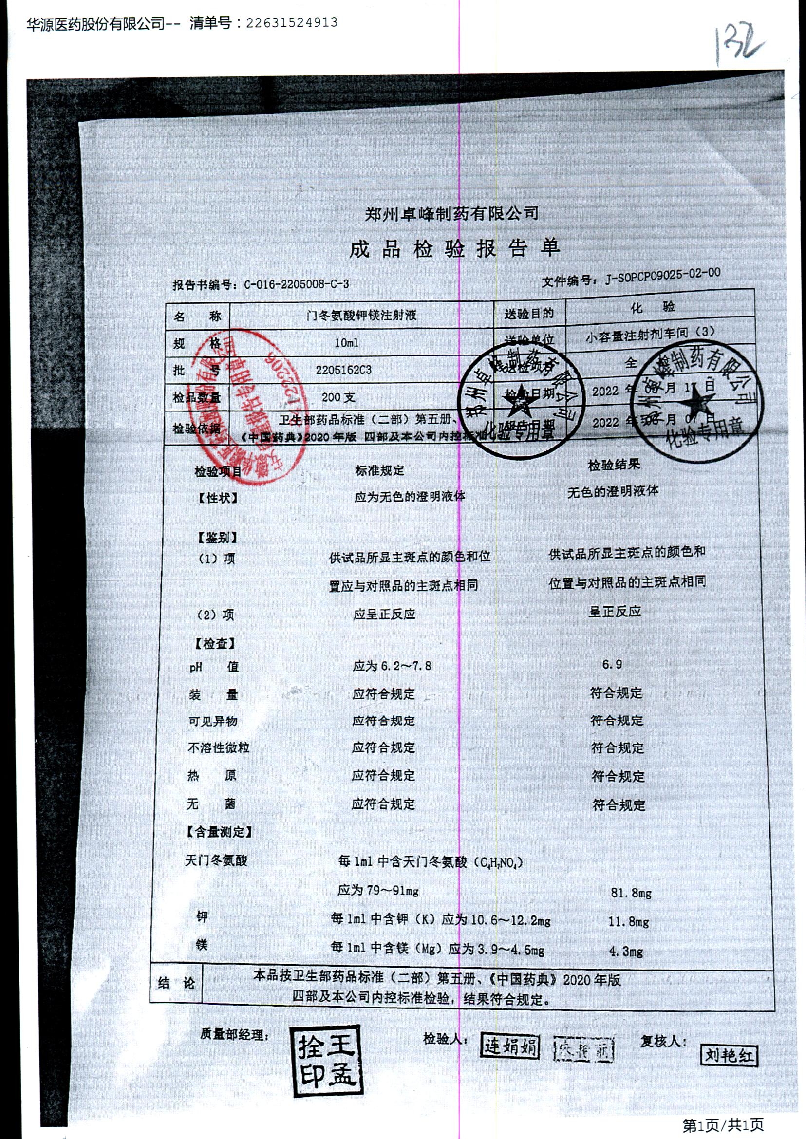 门冬氨酸钾镁注射液 | 10ml | 2010161C1 | 查看详情 |