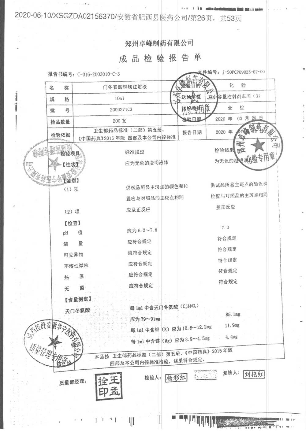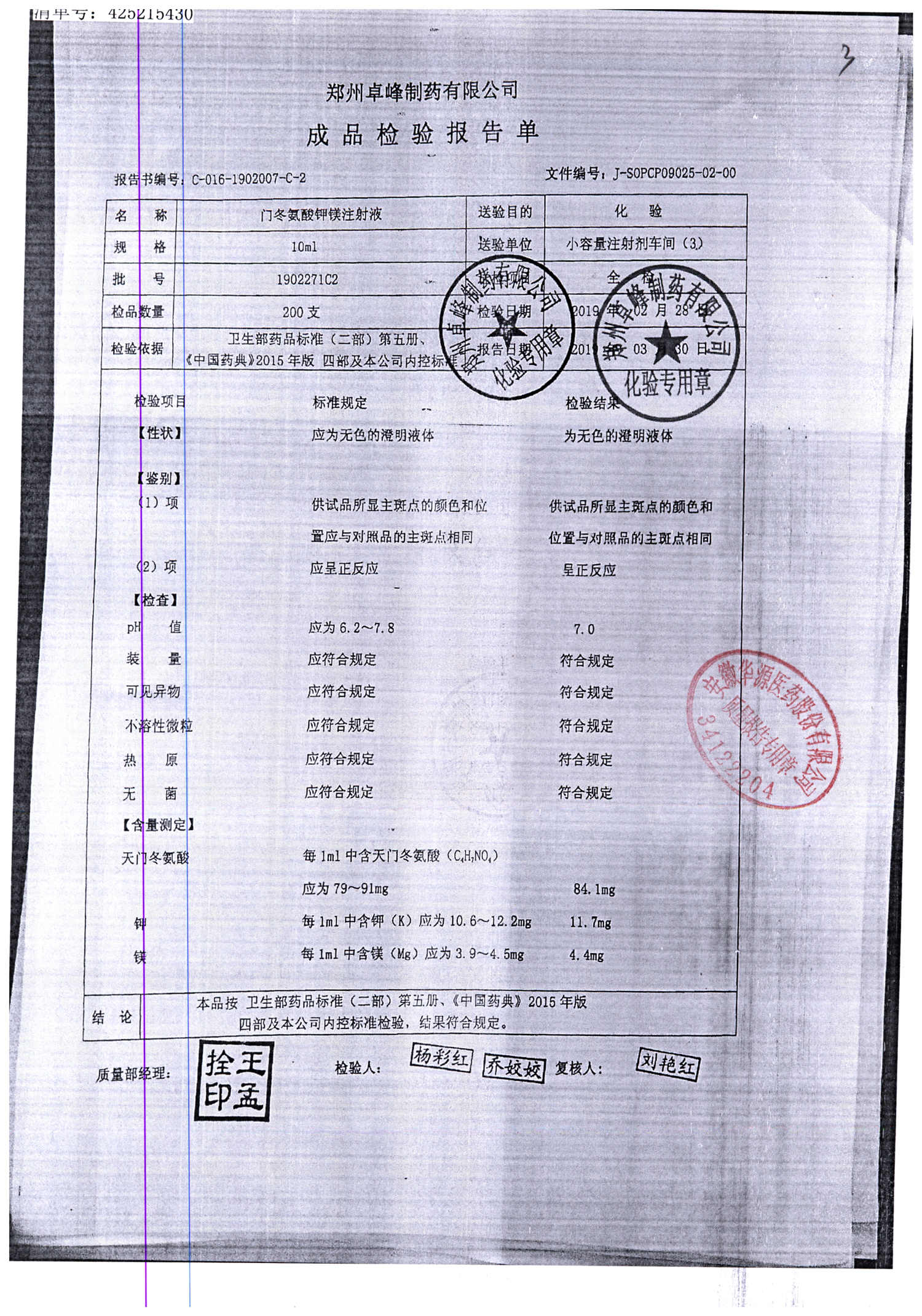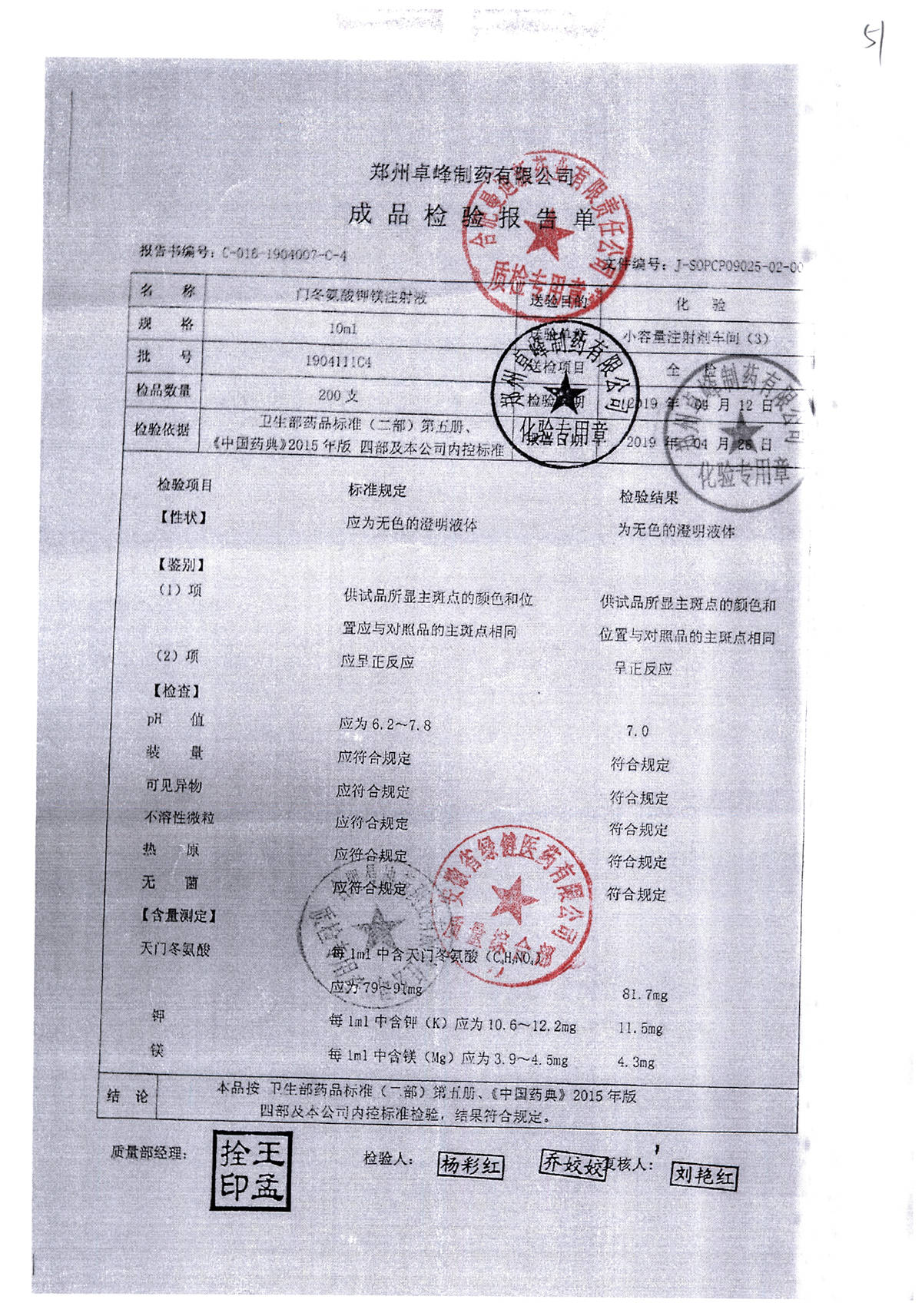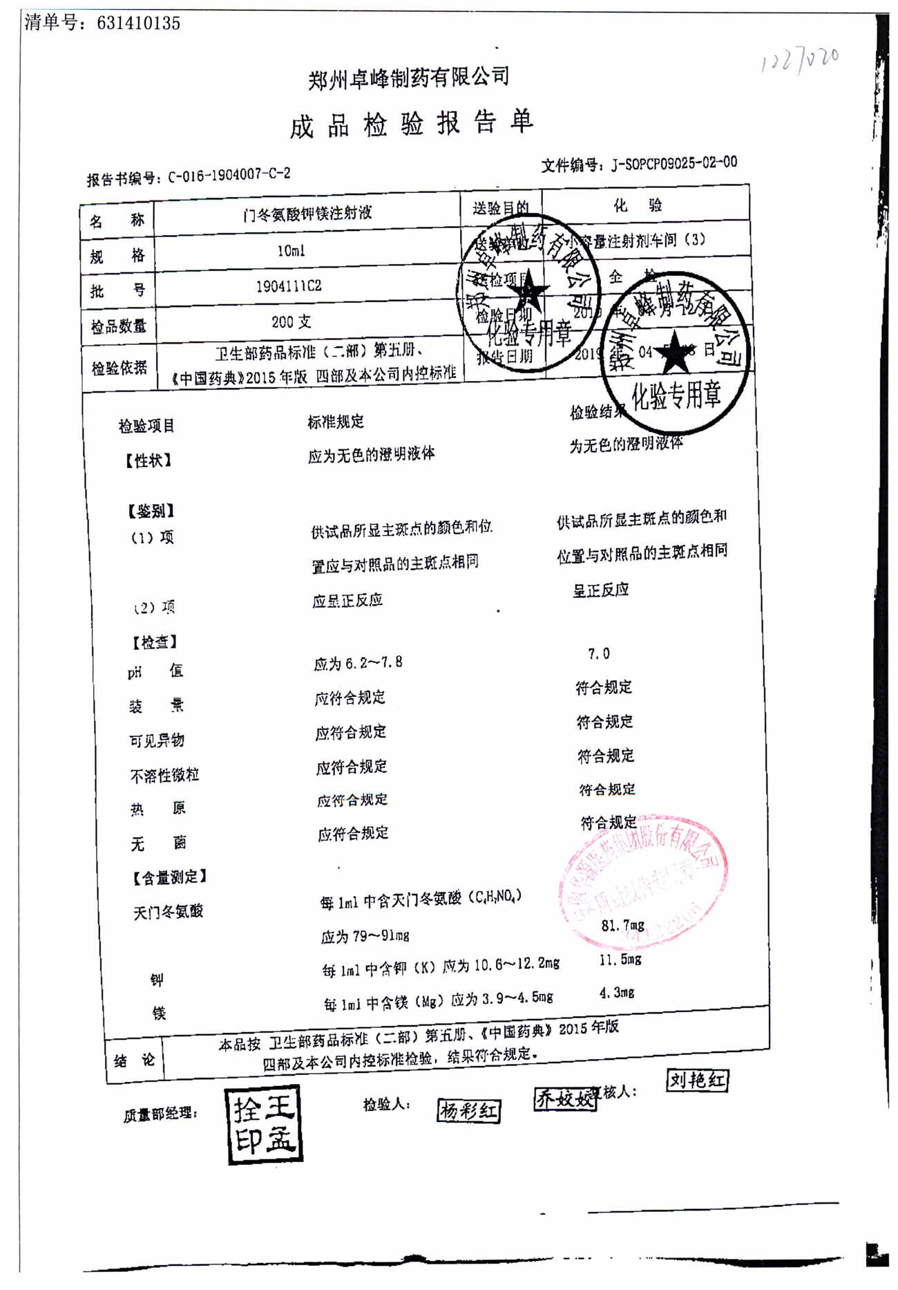 门冬氨酸钾镁注射液 | 10ml | 1904111C2 | 查看详情 |