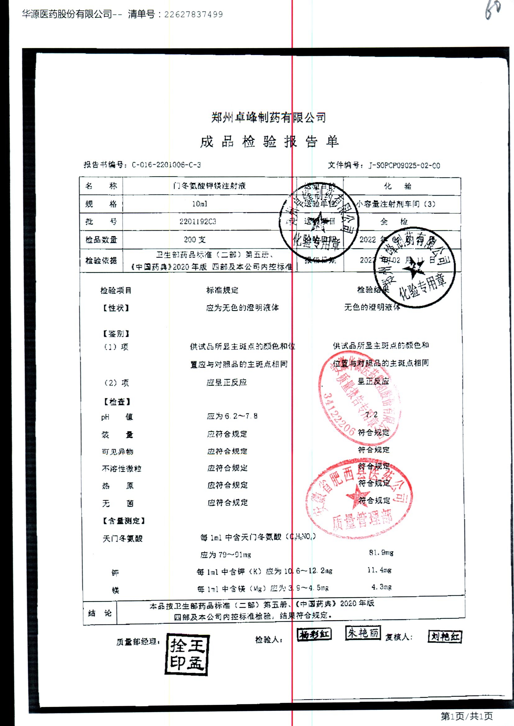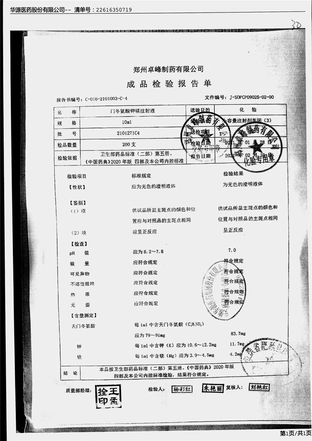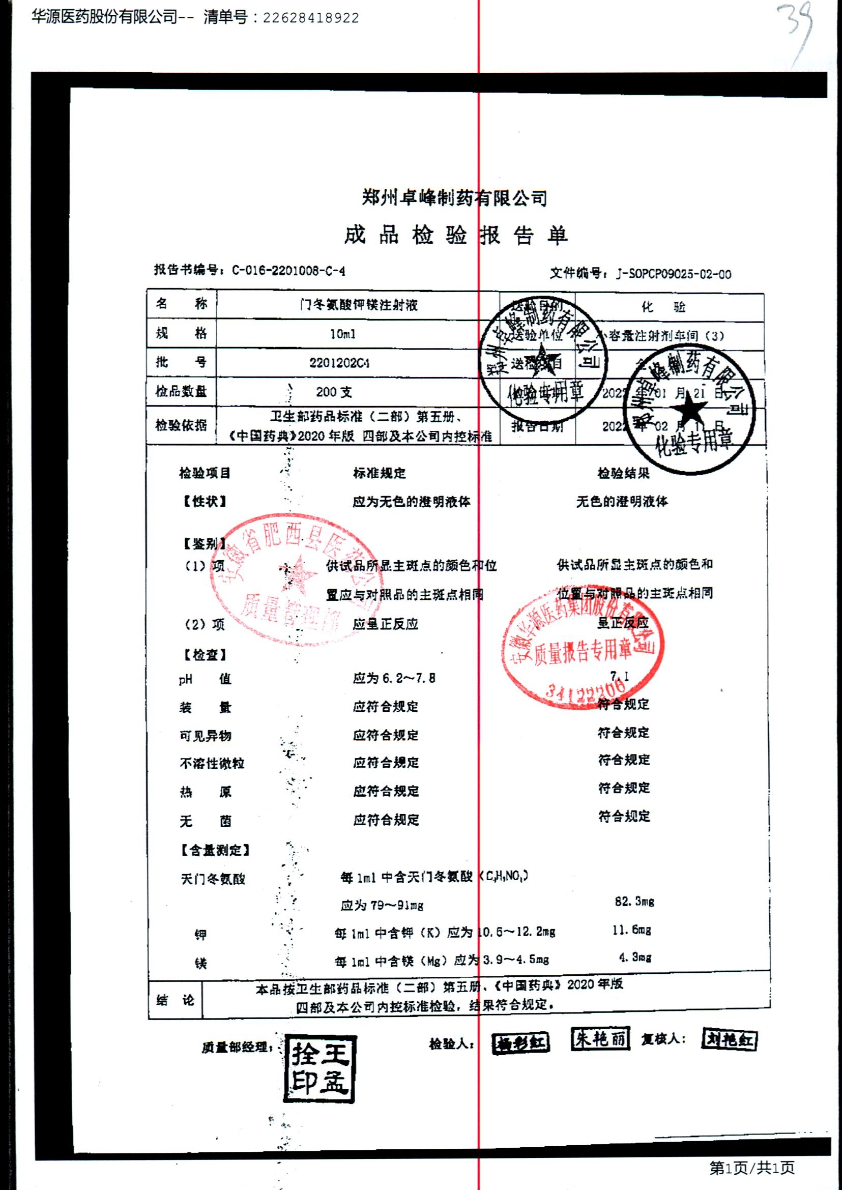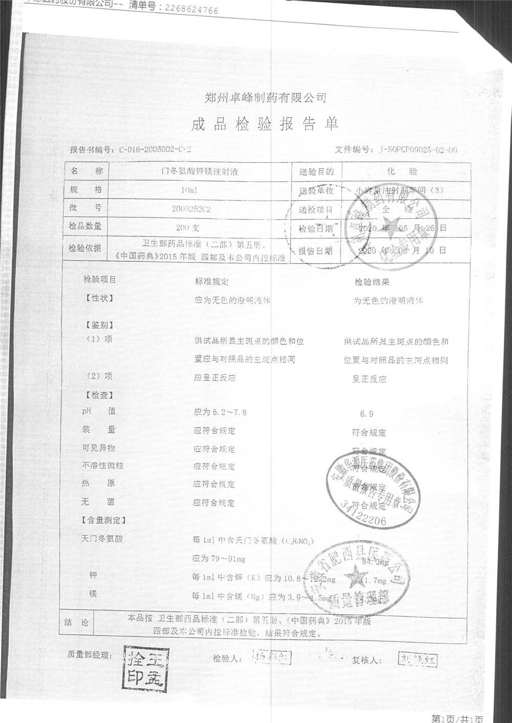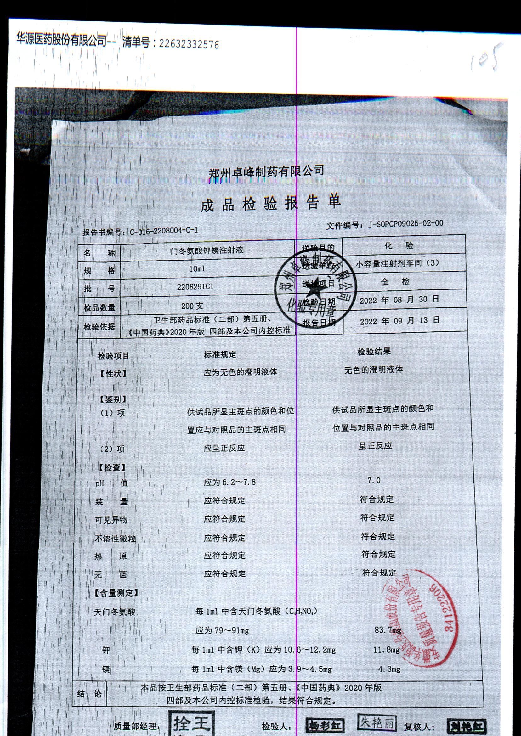 门冬氨酸钾镁注射液 | 10ml | 2201202C4 | 查看详情 |