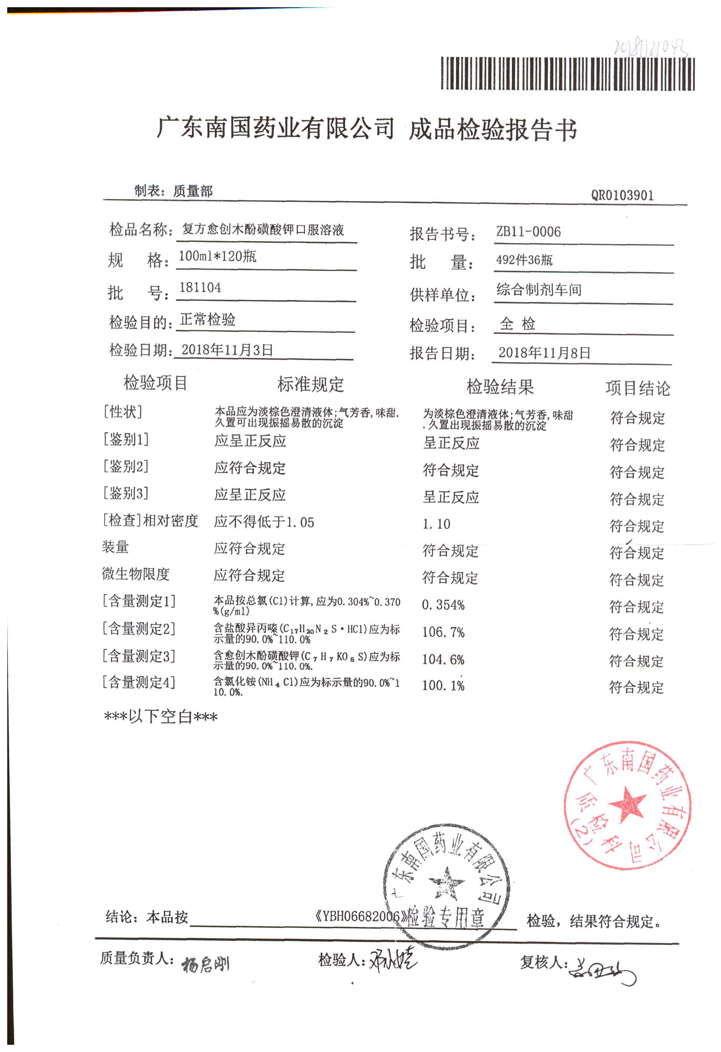 复方愈创木酚磺酸钾口服溶液 | 100ml | 181104 | 查看详情 |