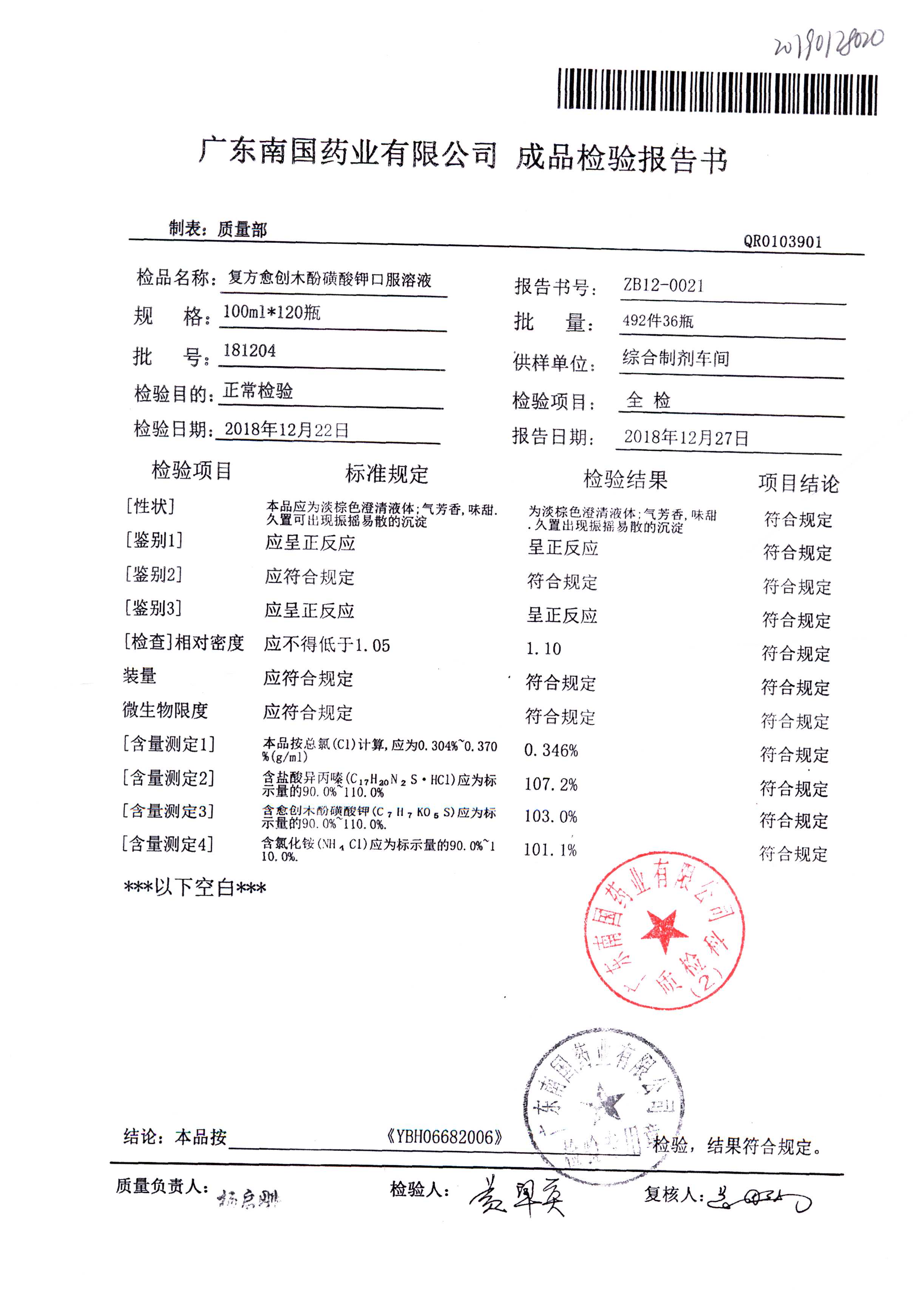 复方愈创木酚磺酸钾口服溶液 | 100ml | 190907 | 查看详情 |