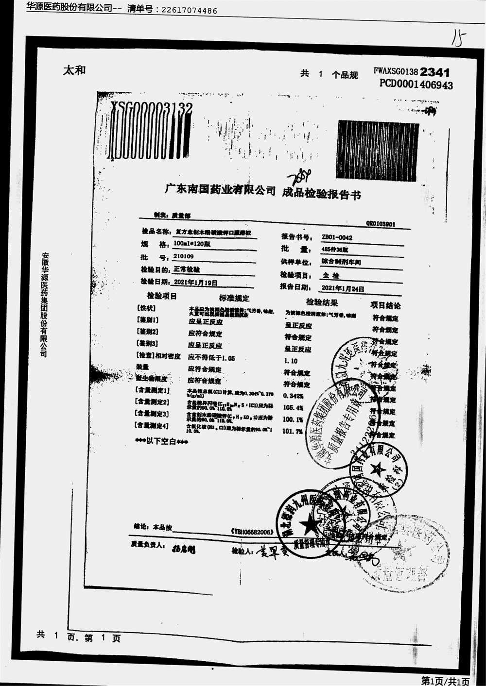 复方愈创木酚磺酸钾口服溶液 | 100ml | 210109 | 查看详情 |