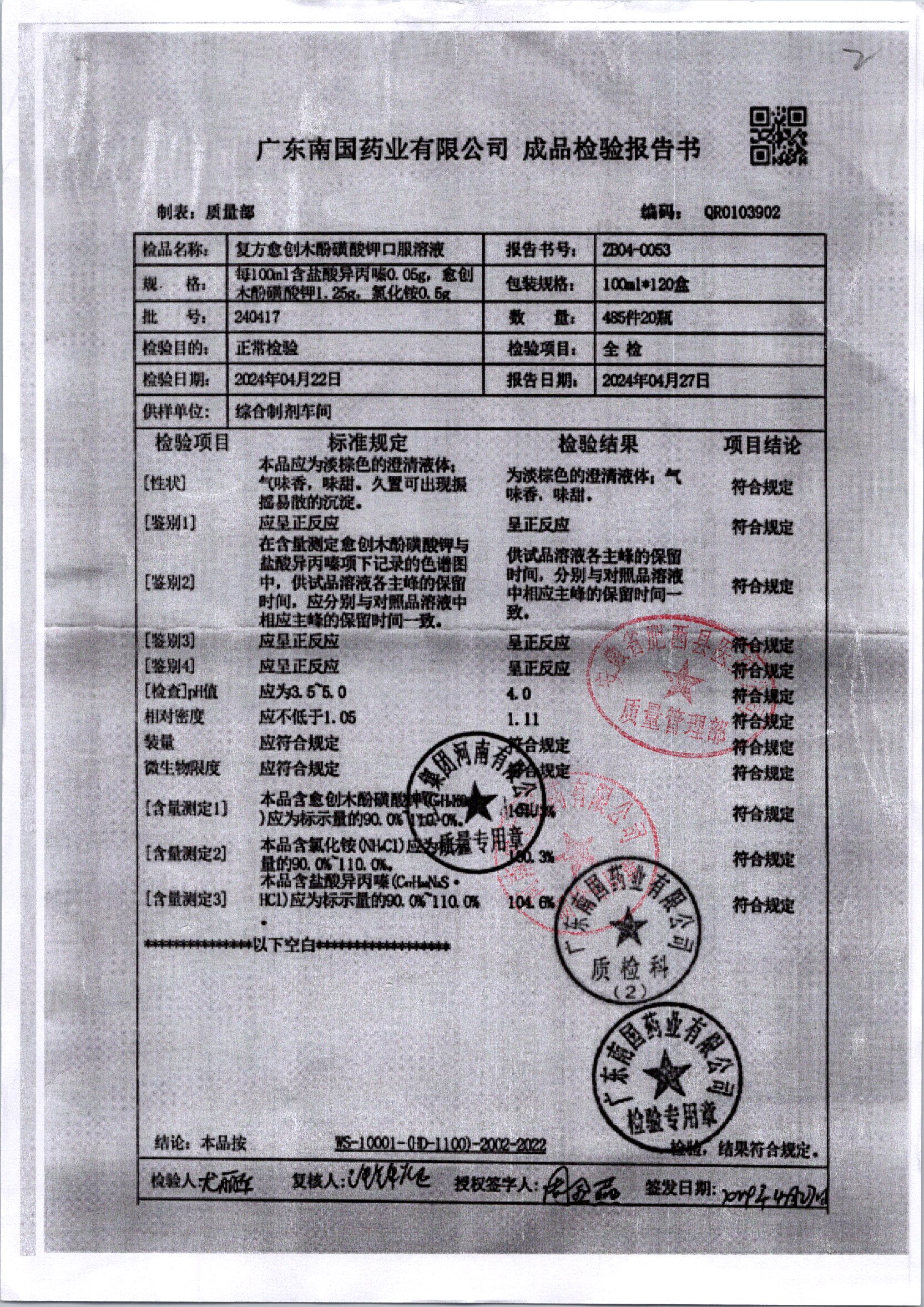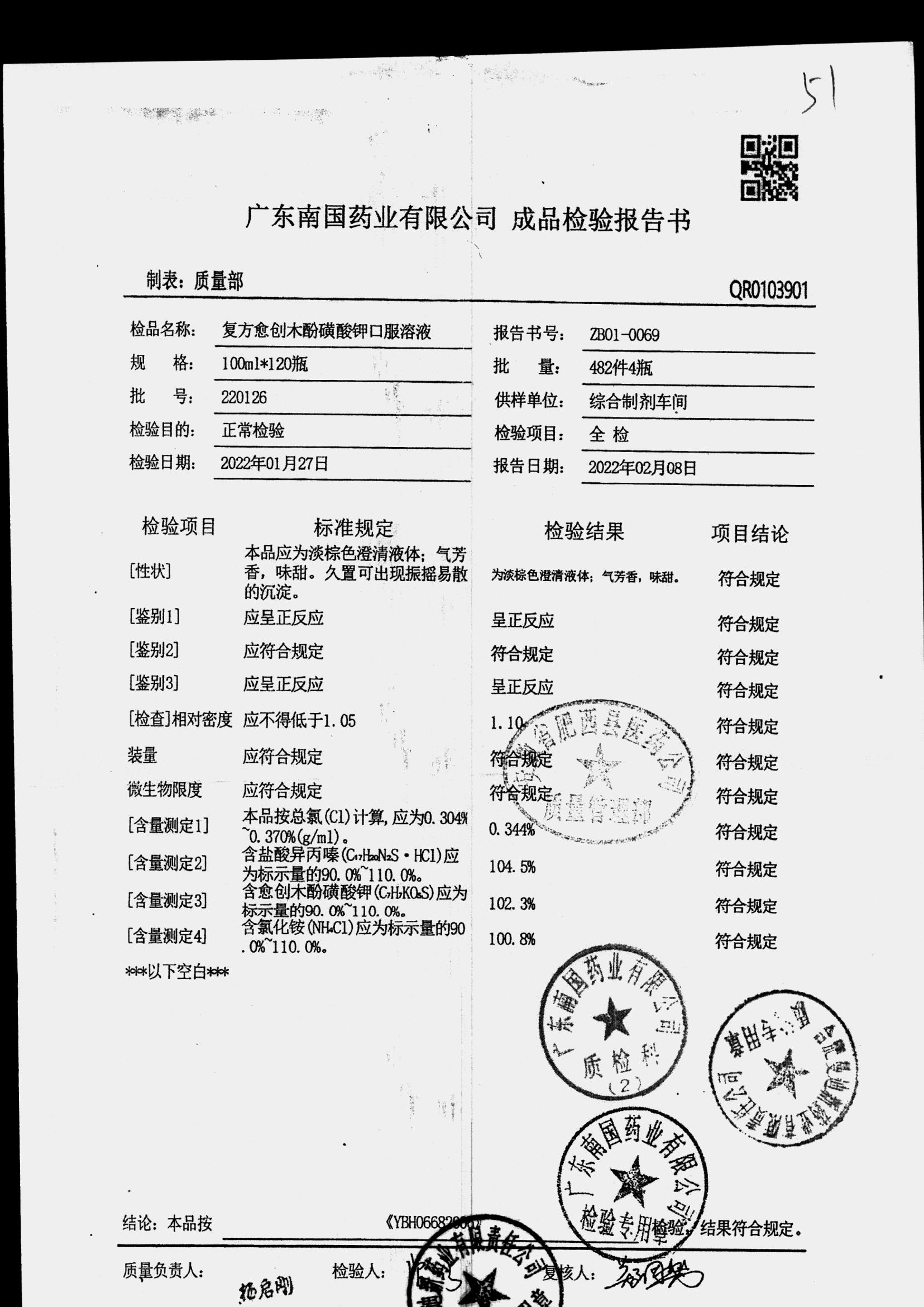 复方愈创木酚磺酸钾口服溶液 | 100ml | 240417 | 查看详情 |
