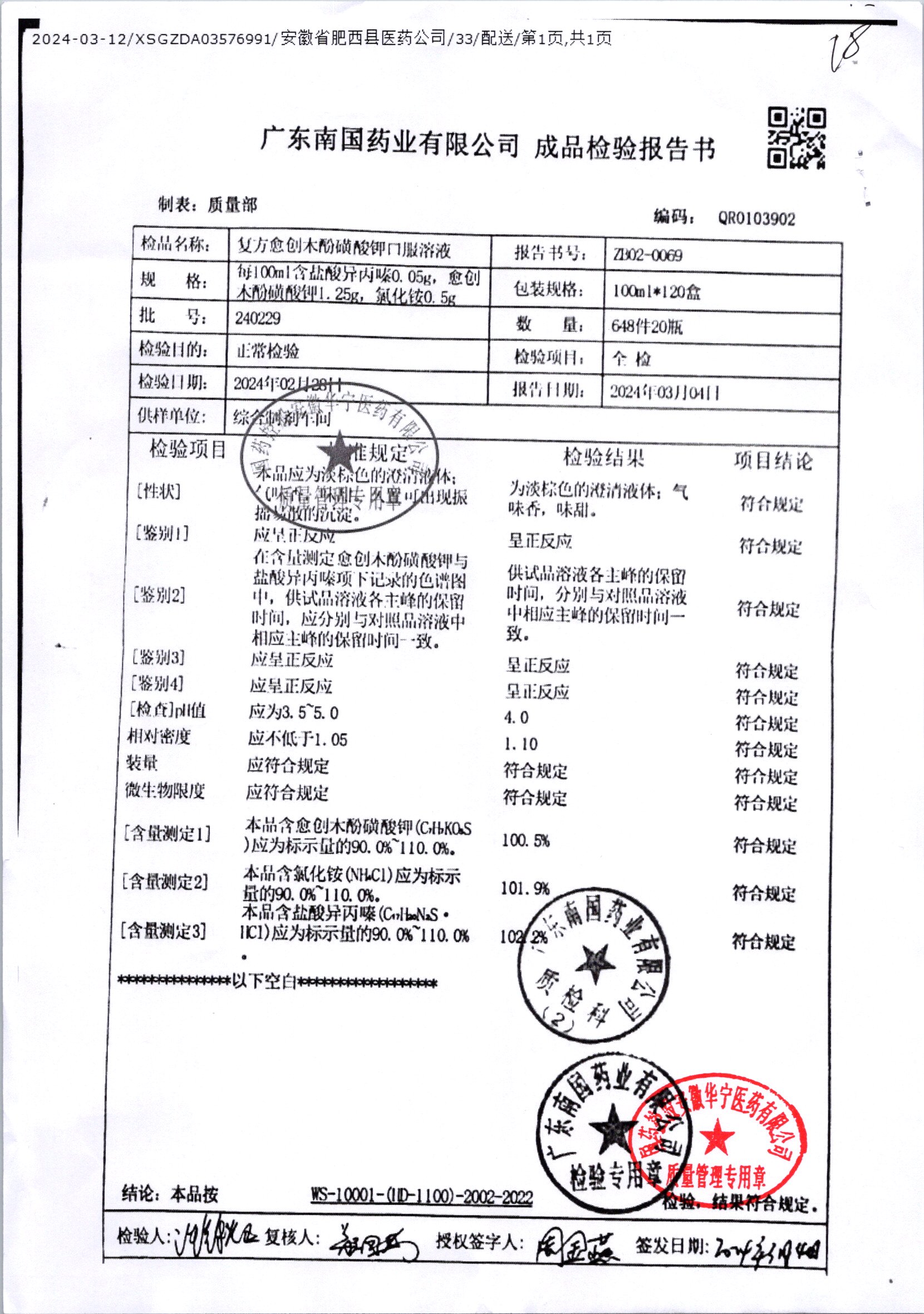 复方愈创木酚磺酸钾口服溶液 | 100ml | 240229 | 查看详情 |
