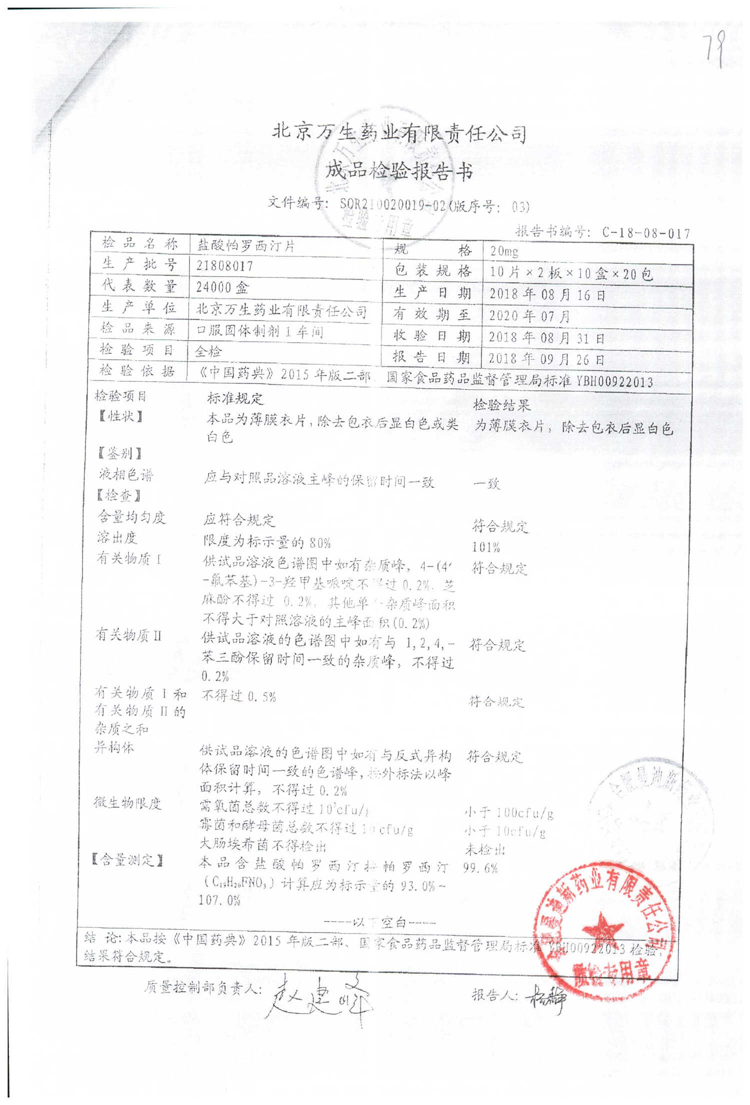 盐酸帕罗西汀片