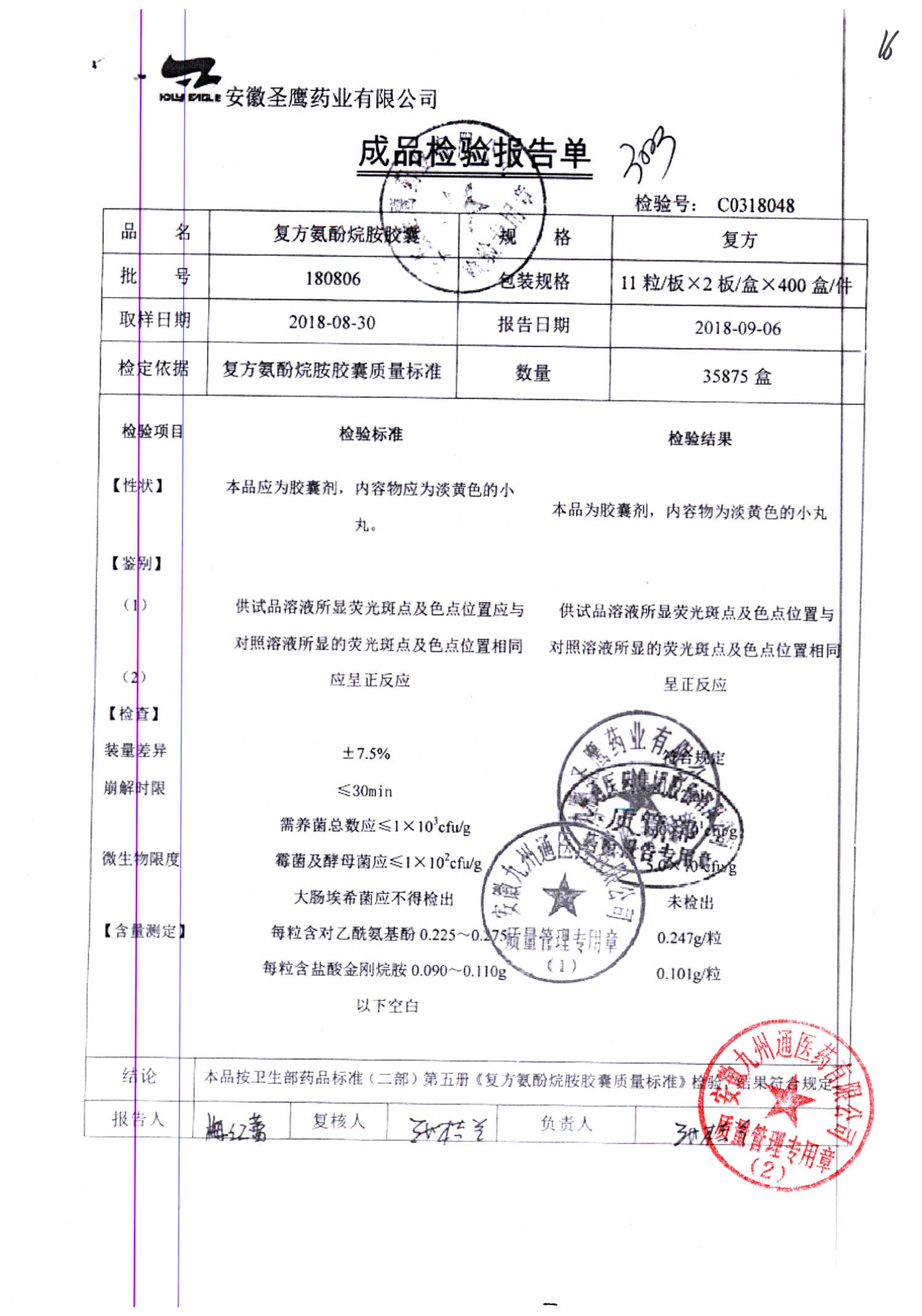 复方氨酚烷胺胶囊 | 22粒 | 180806(1/2) | 查看详情 |
