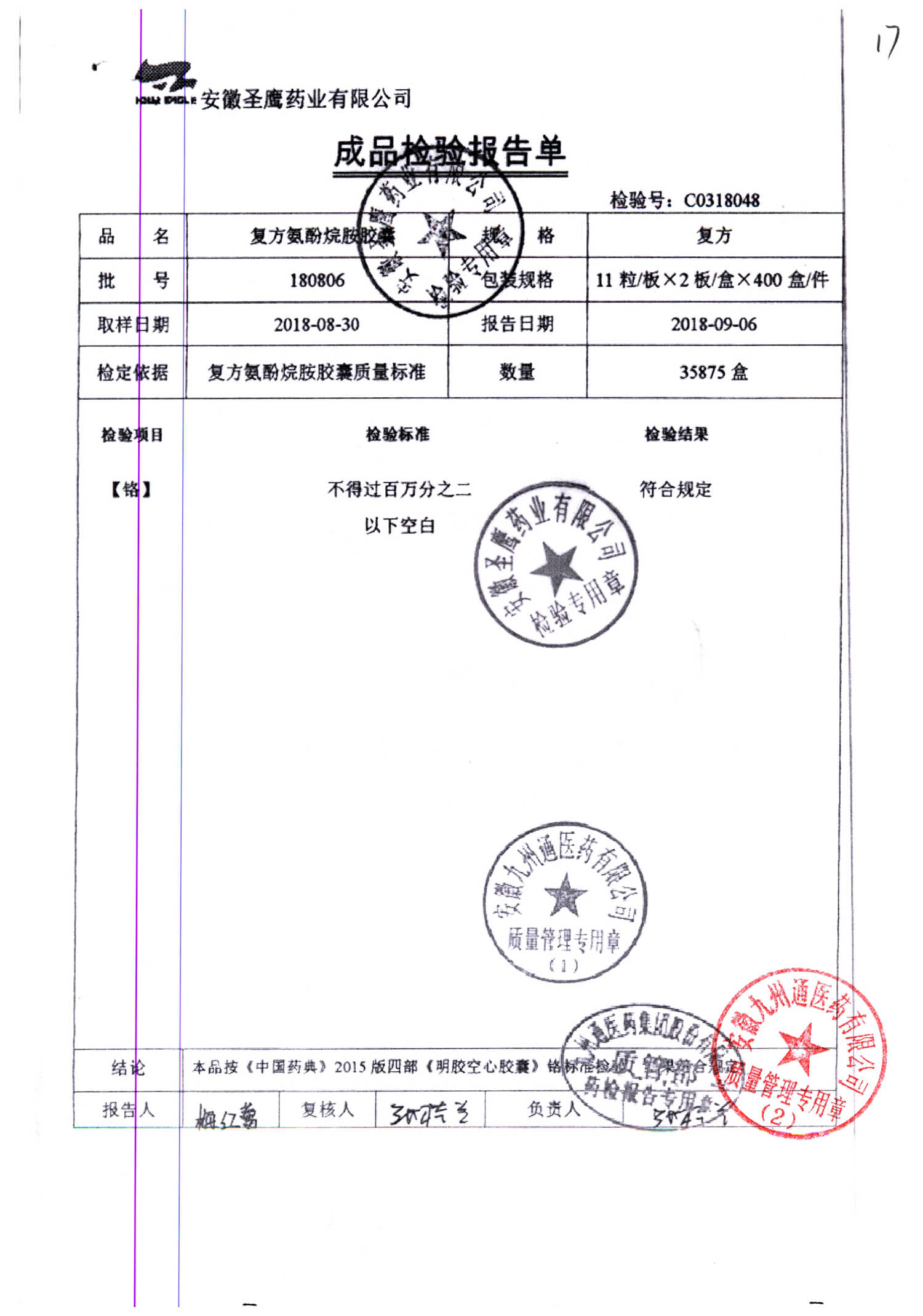 复方氨酚烷胺胶囊 | 22粒 | 180702(1/2) | 查看详情 |