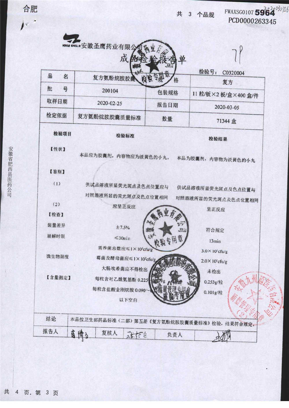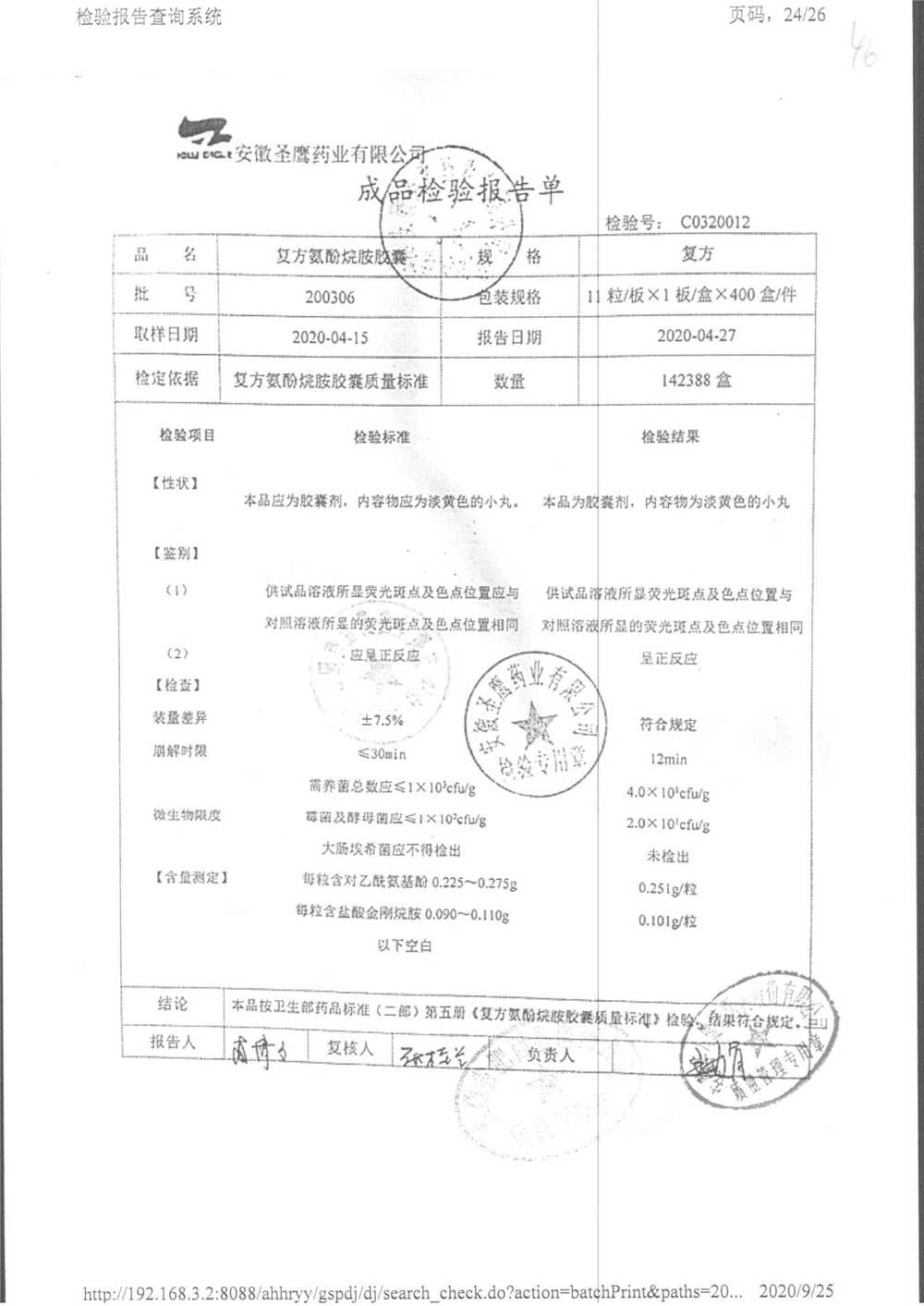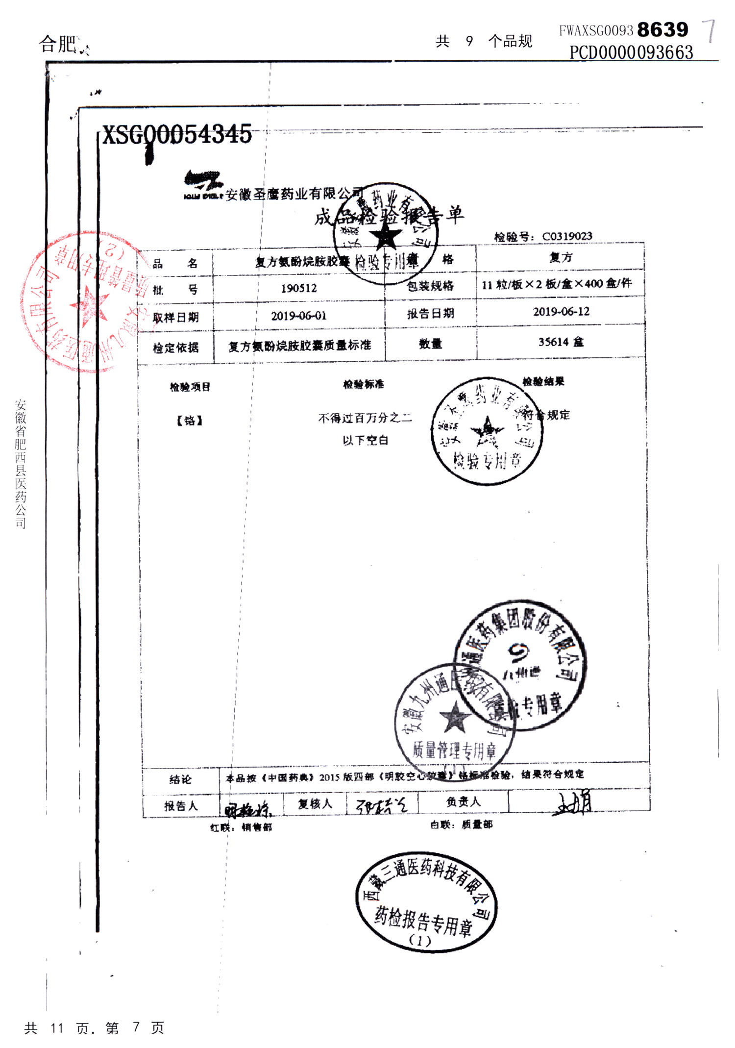 复方氨酚烷胺胶囊 | 22粒 | 190512(1/2) | 查看详情 |