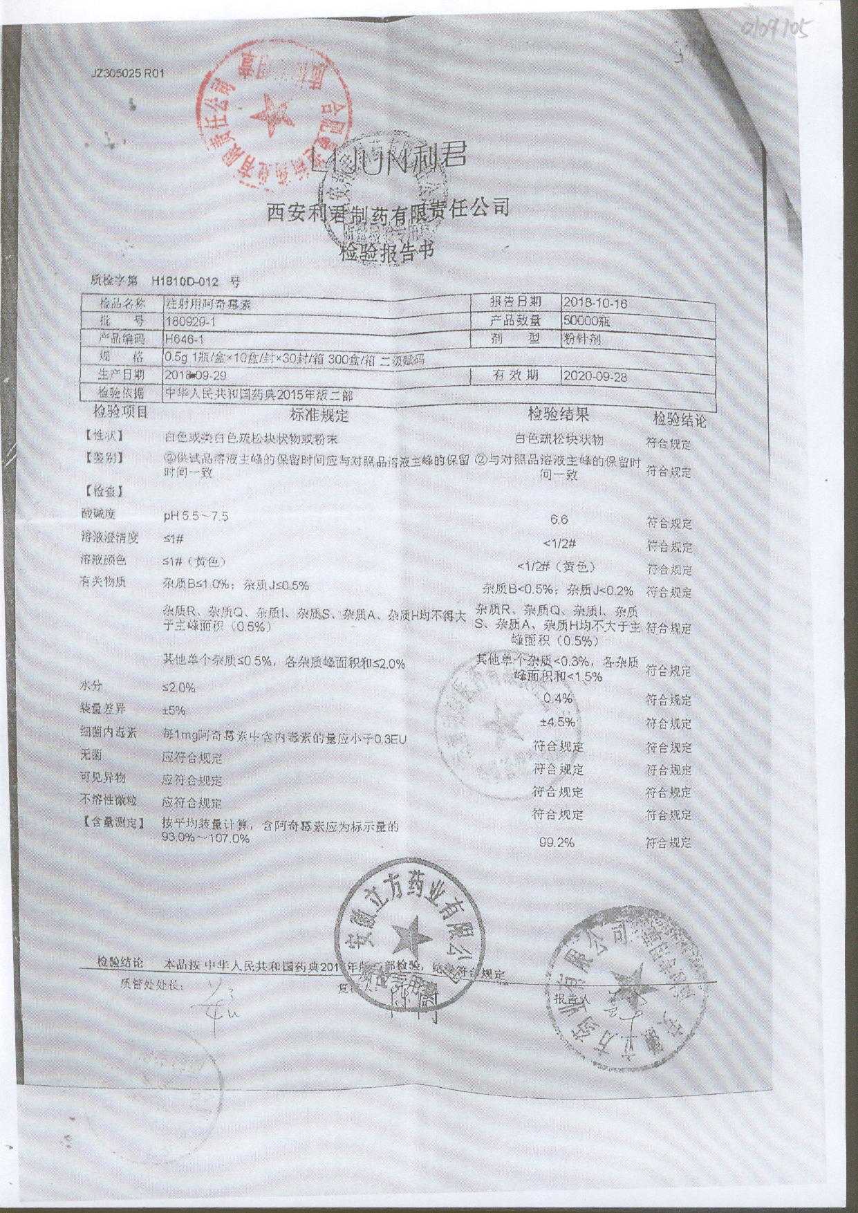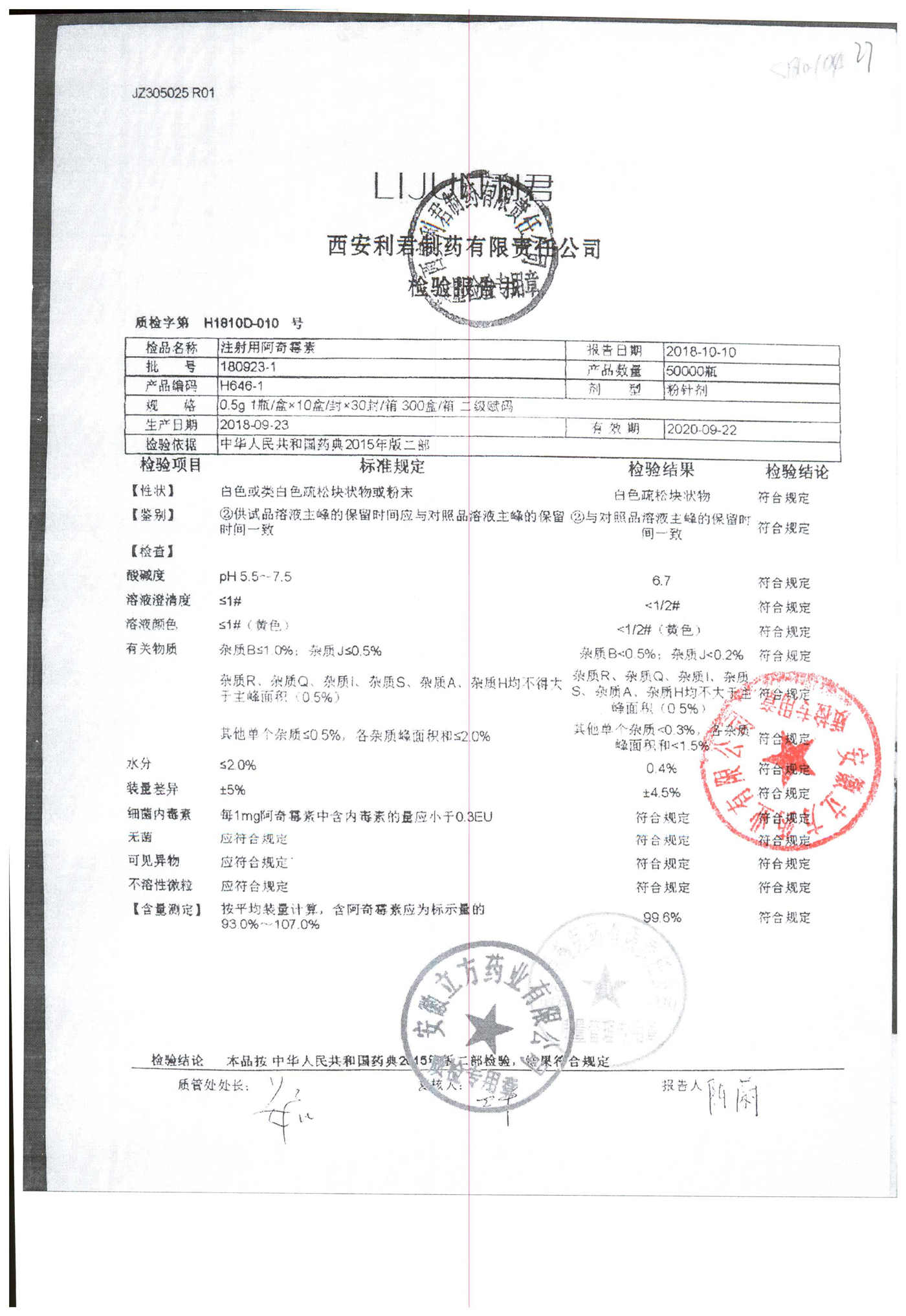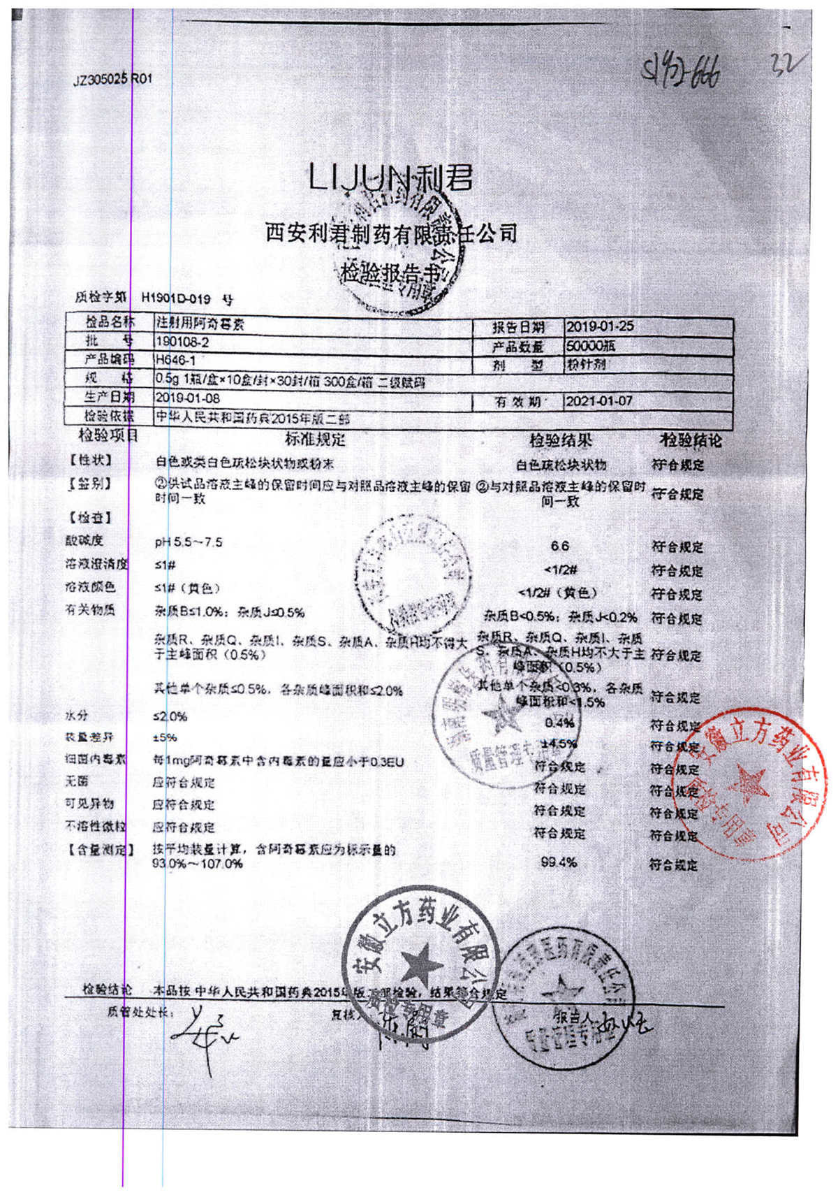 注射用阿奇霉素 | 0.5g | 190609-1 | 查看详情 |