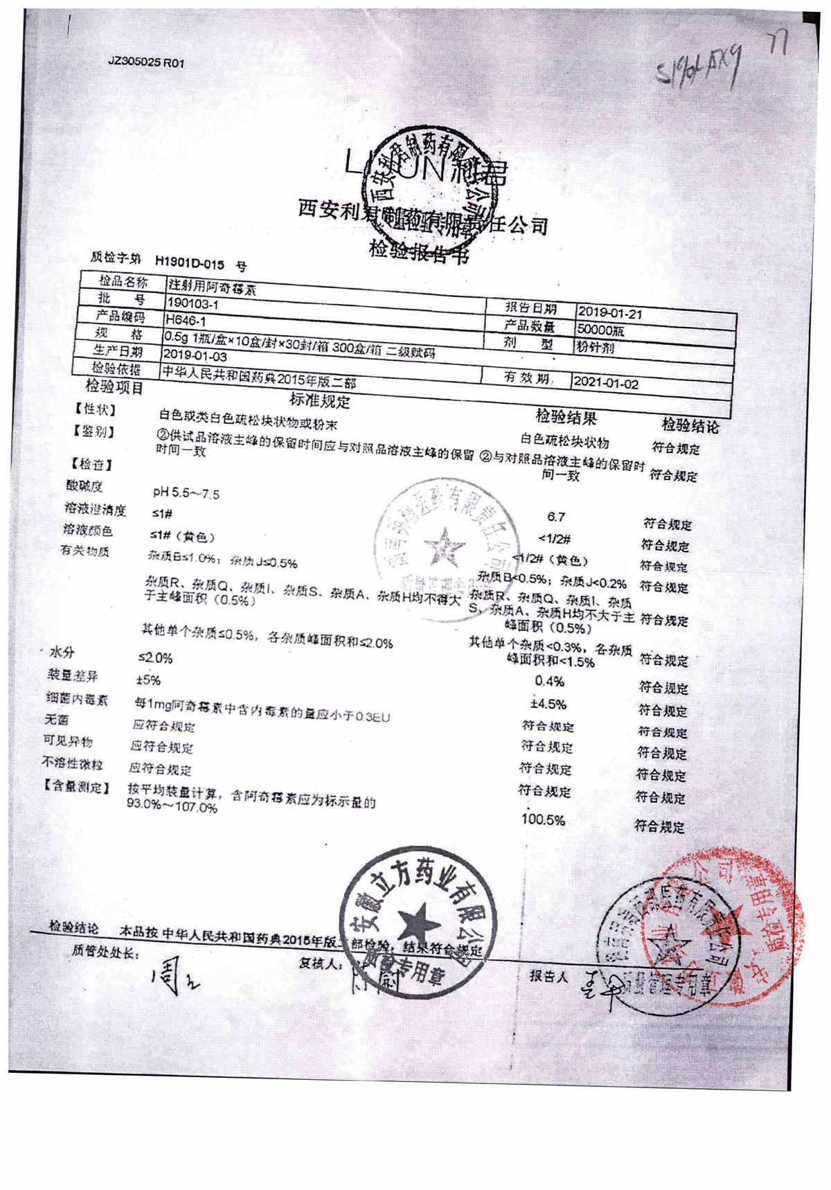 注射用阿奇霉素 | 0.5g | 190103-1 | 查看详情 |