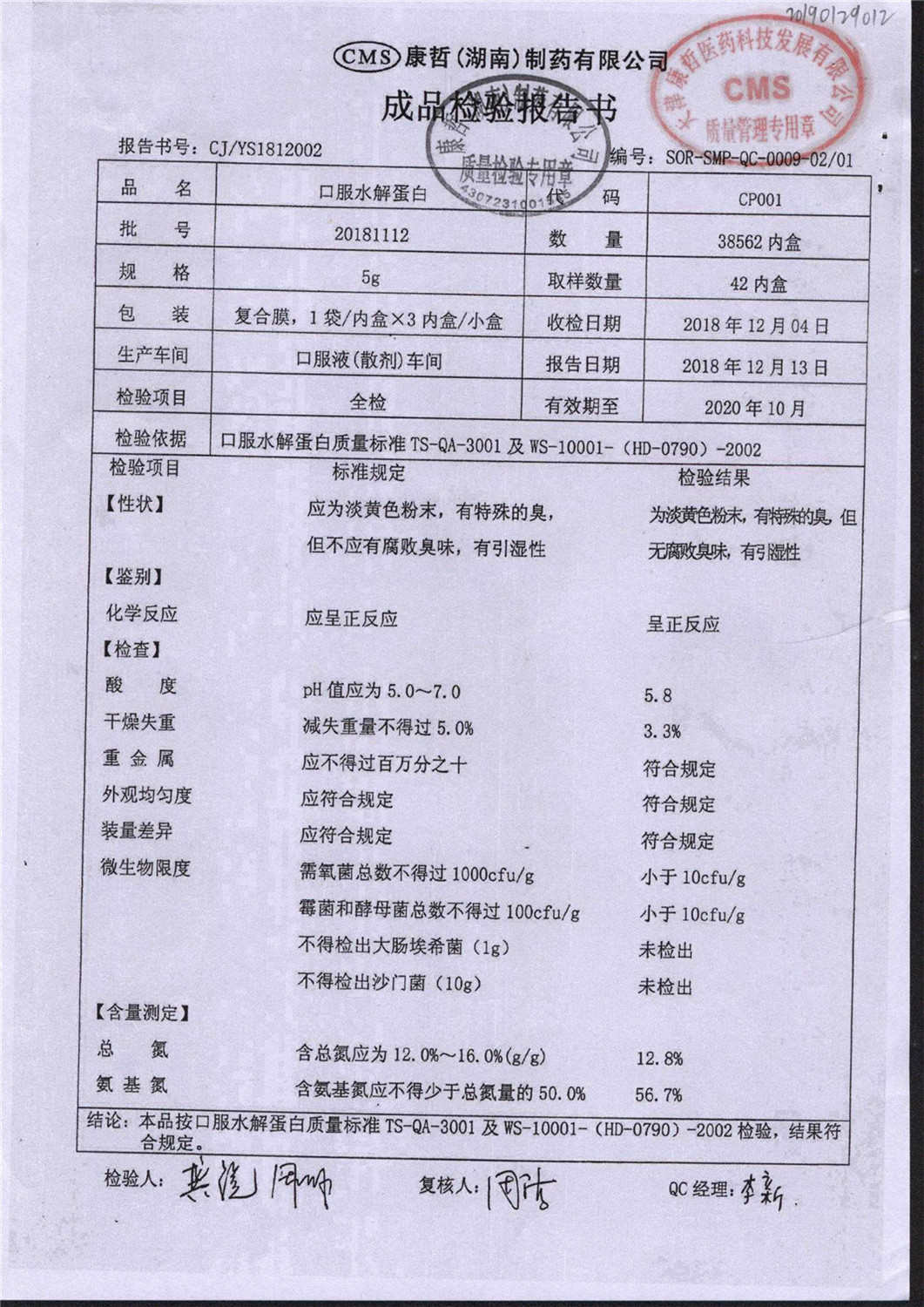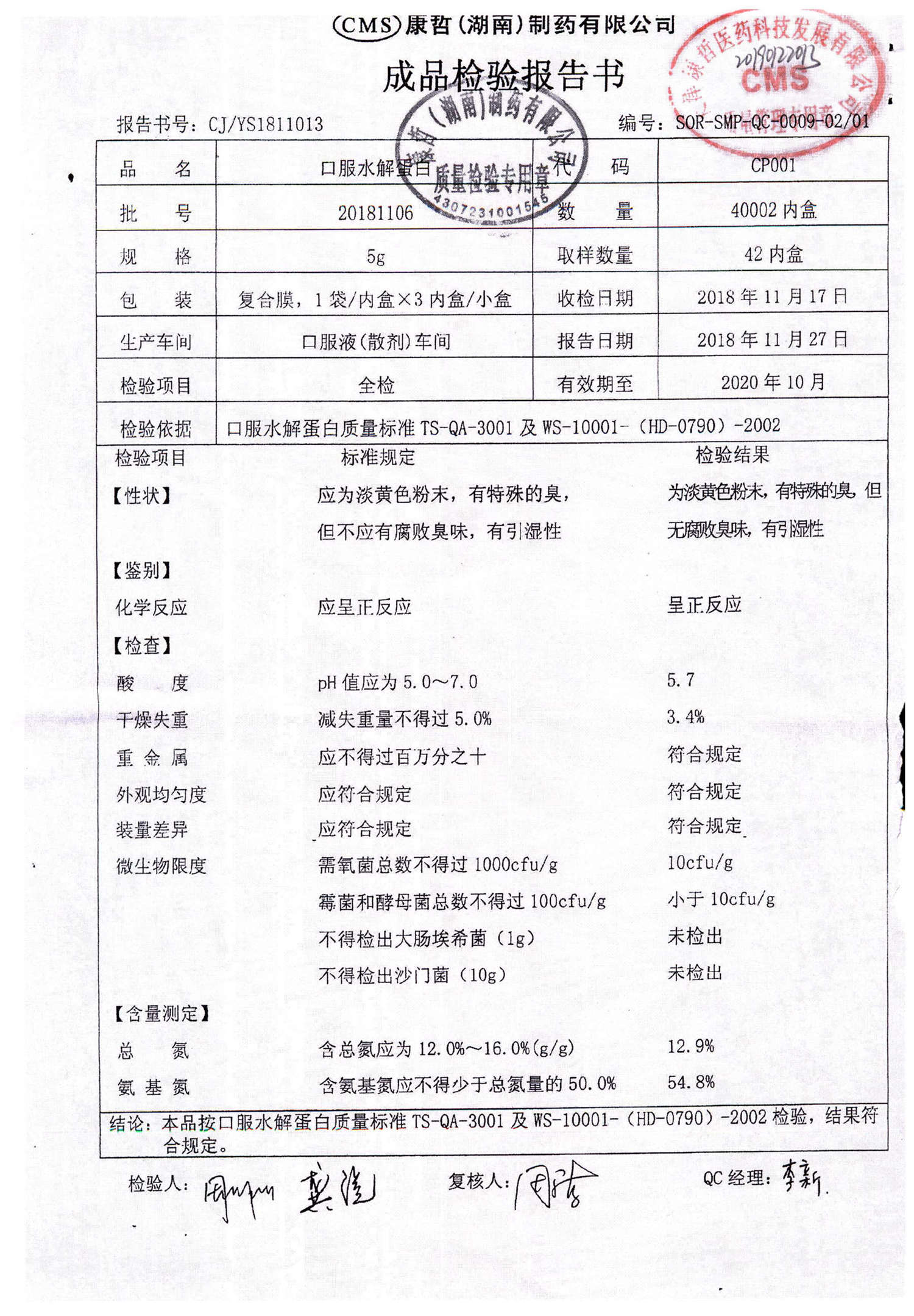 口服水解蛋白 | 5g*1袋 | 20181112 | 查看详情 |