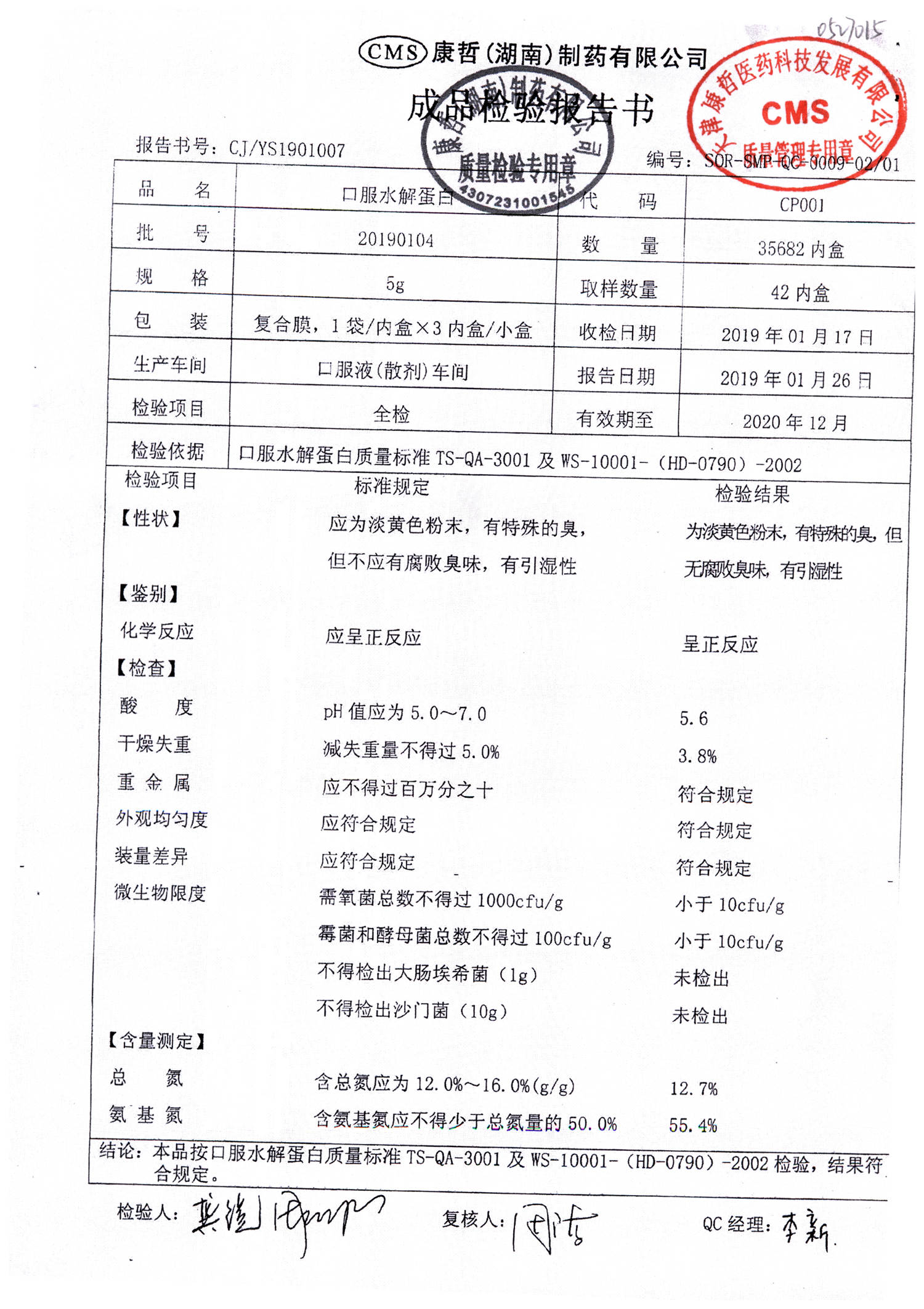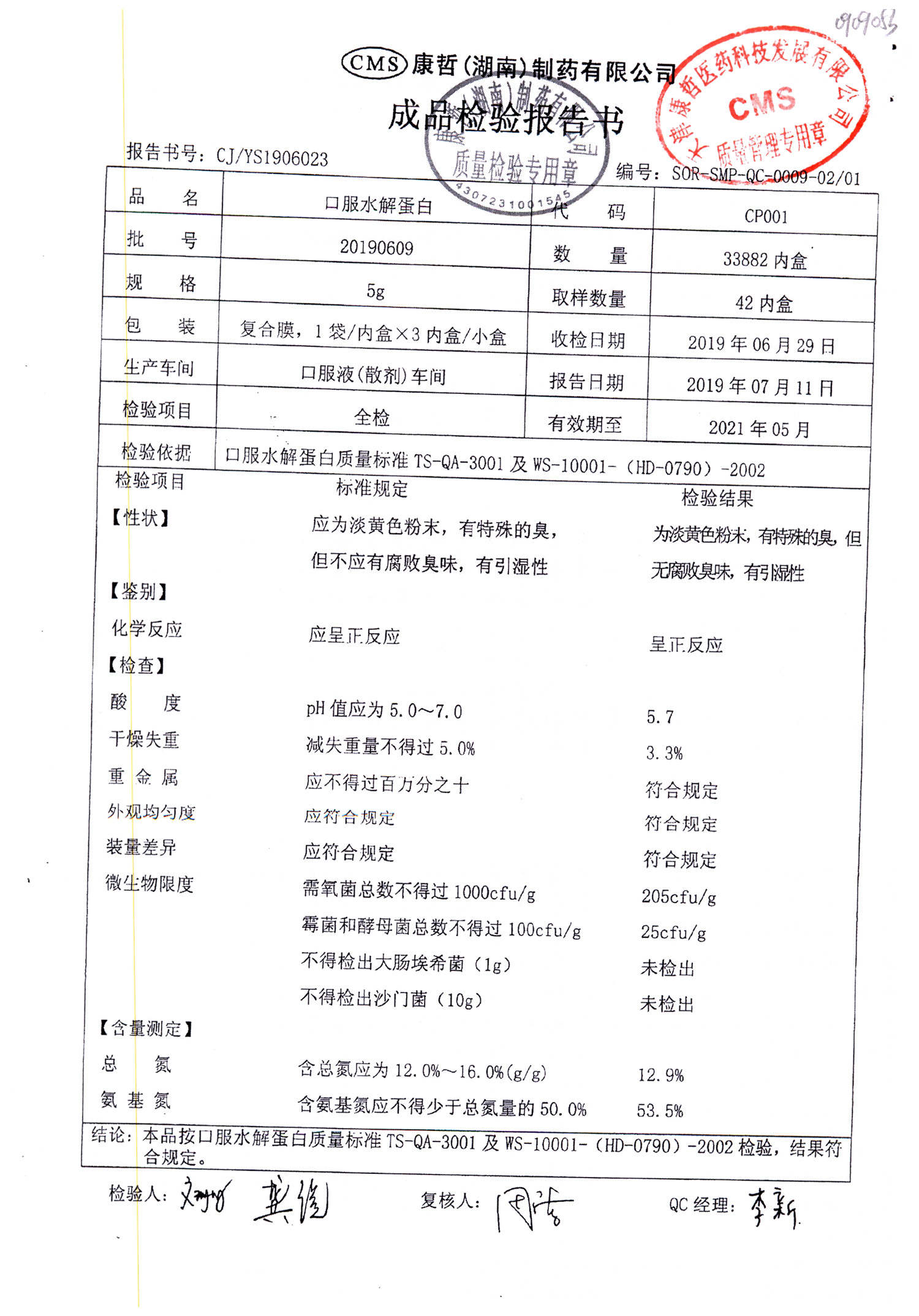 口服水解蛋白 | 5g*1袋 | 20190609 | 查看详情 |