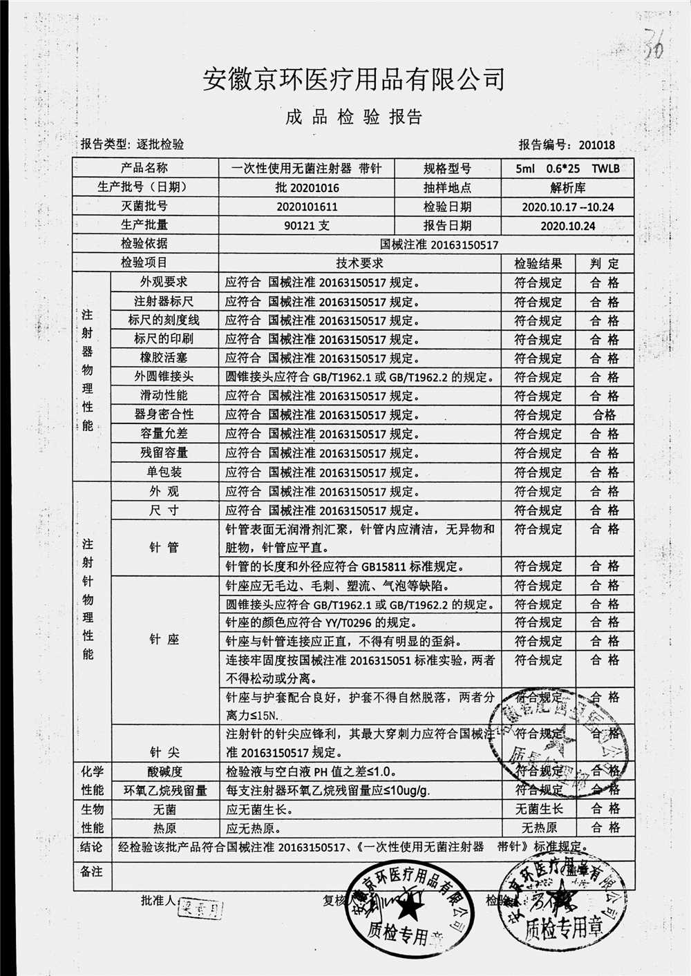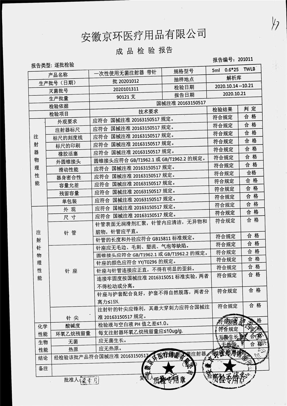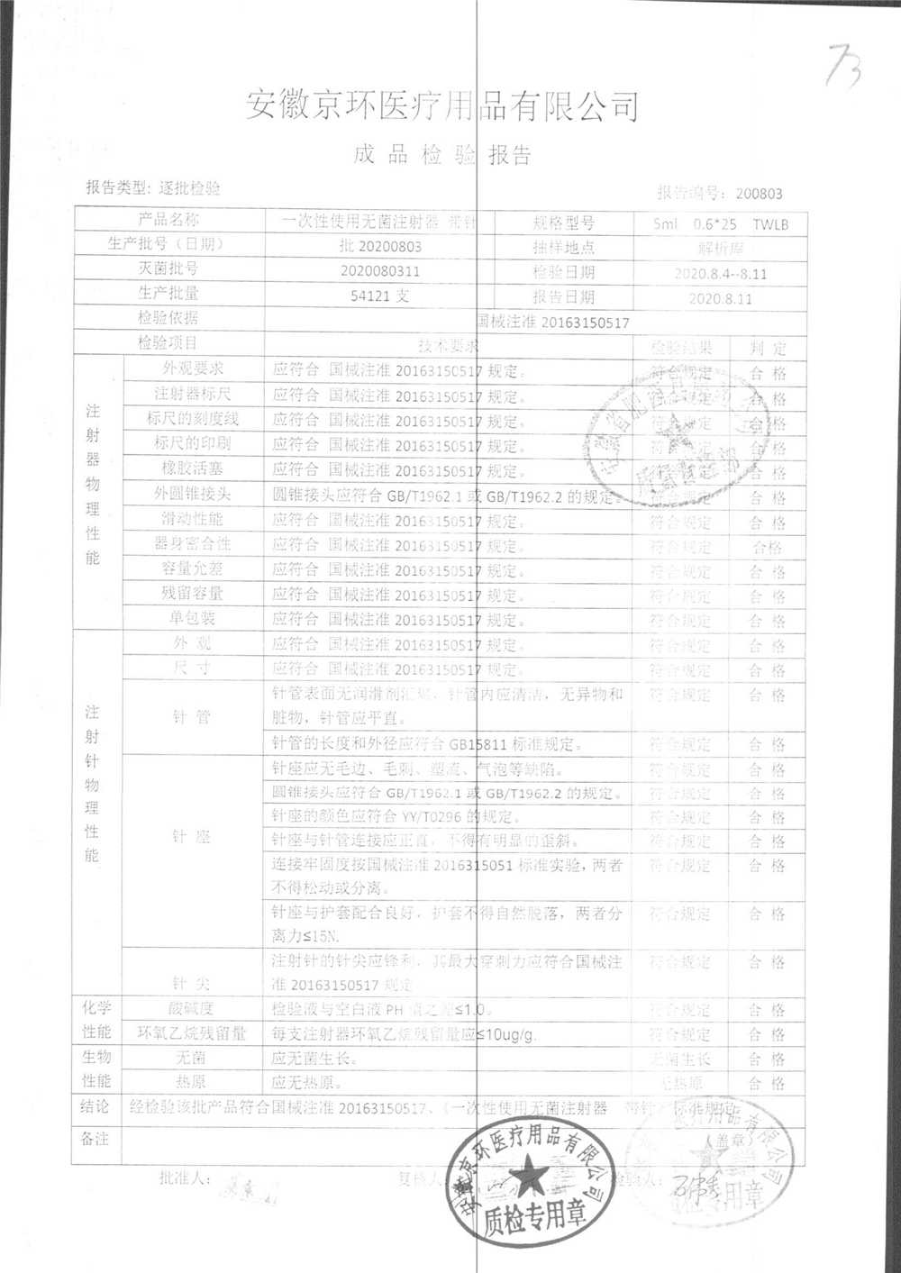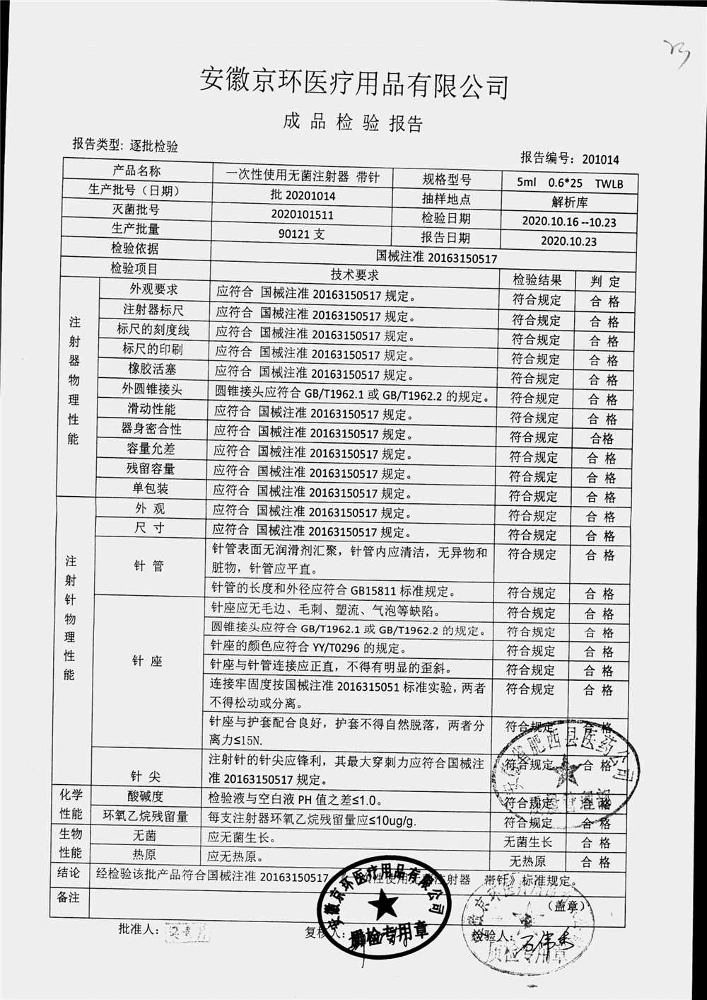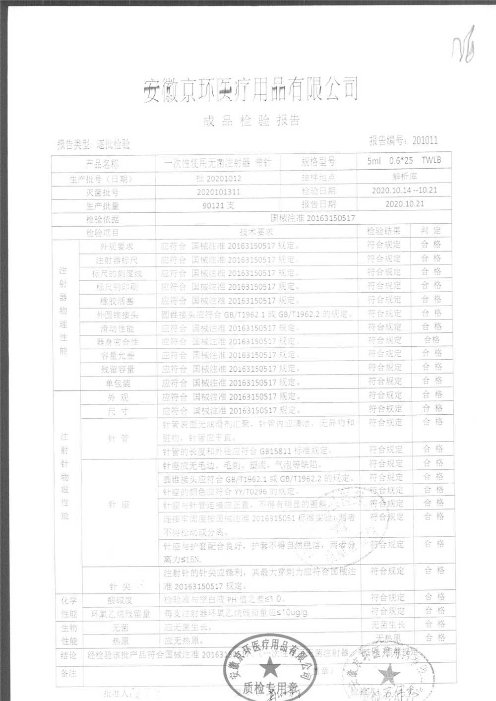 | 一次性使用无菌注射器 带针 | 0.6*25 | 批20201012 | 查看详情 |