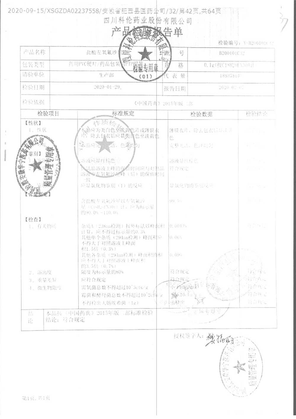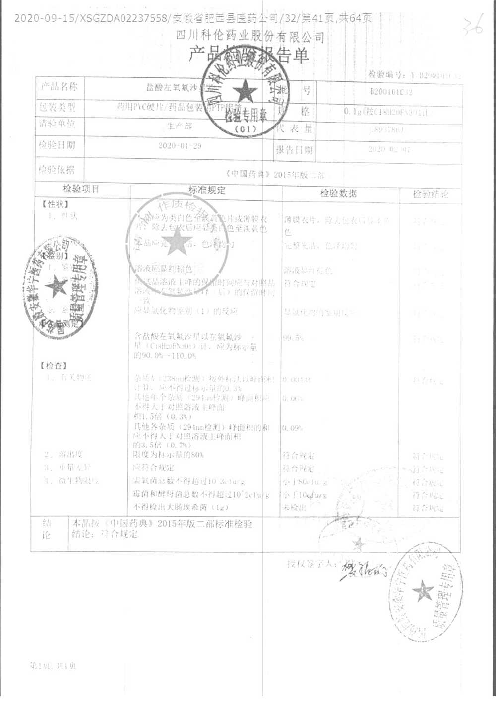 | 盐酸左氧氟沙星片 | 0.1g*6片 | B200101C32(2/2) | 查看详情 |