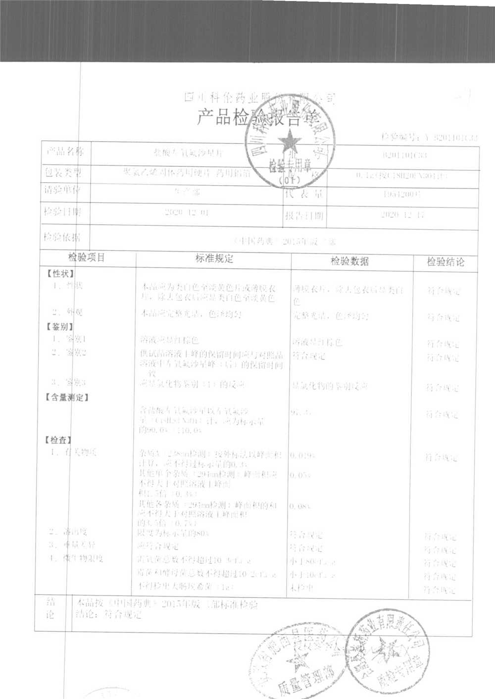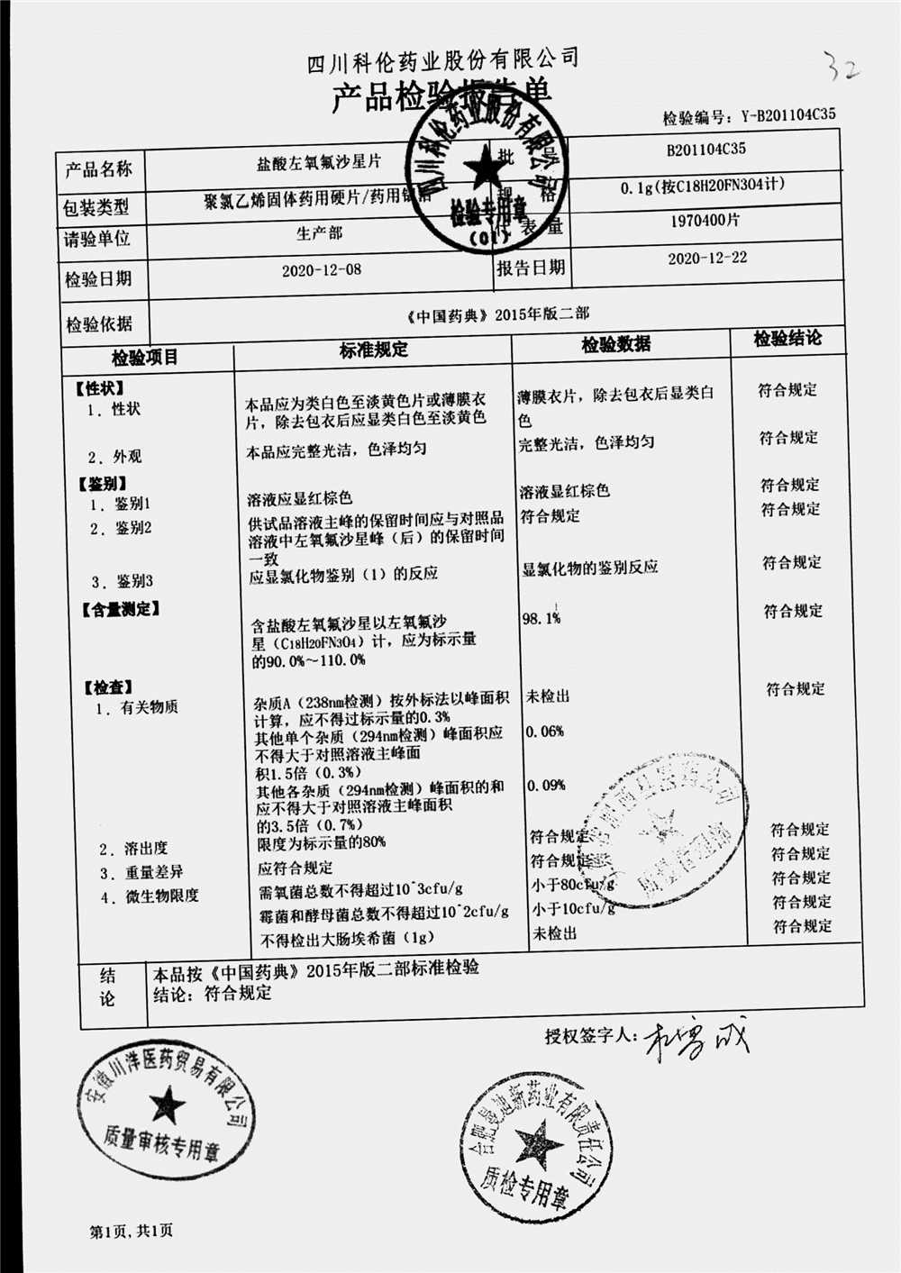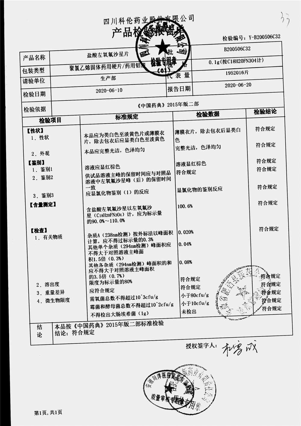 | 盐酸左氧氟沙星片 | 0.1g*6片 | B201104C35(1/2) | 查看详情 |
