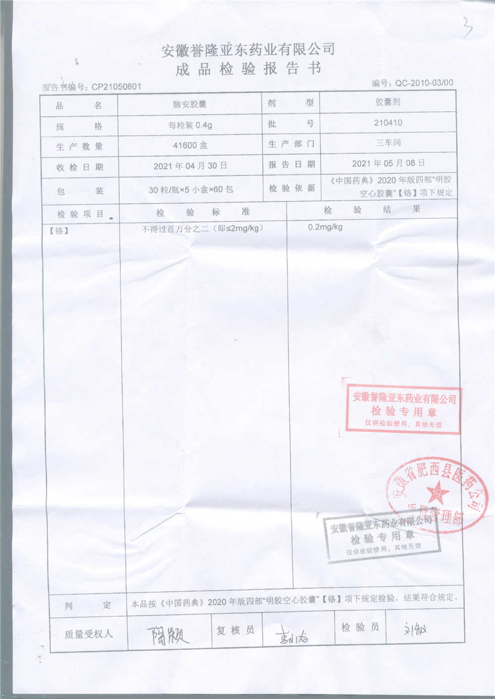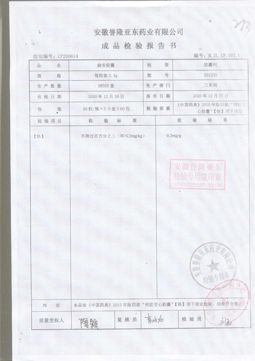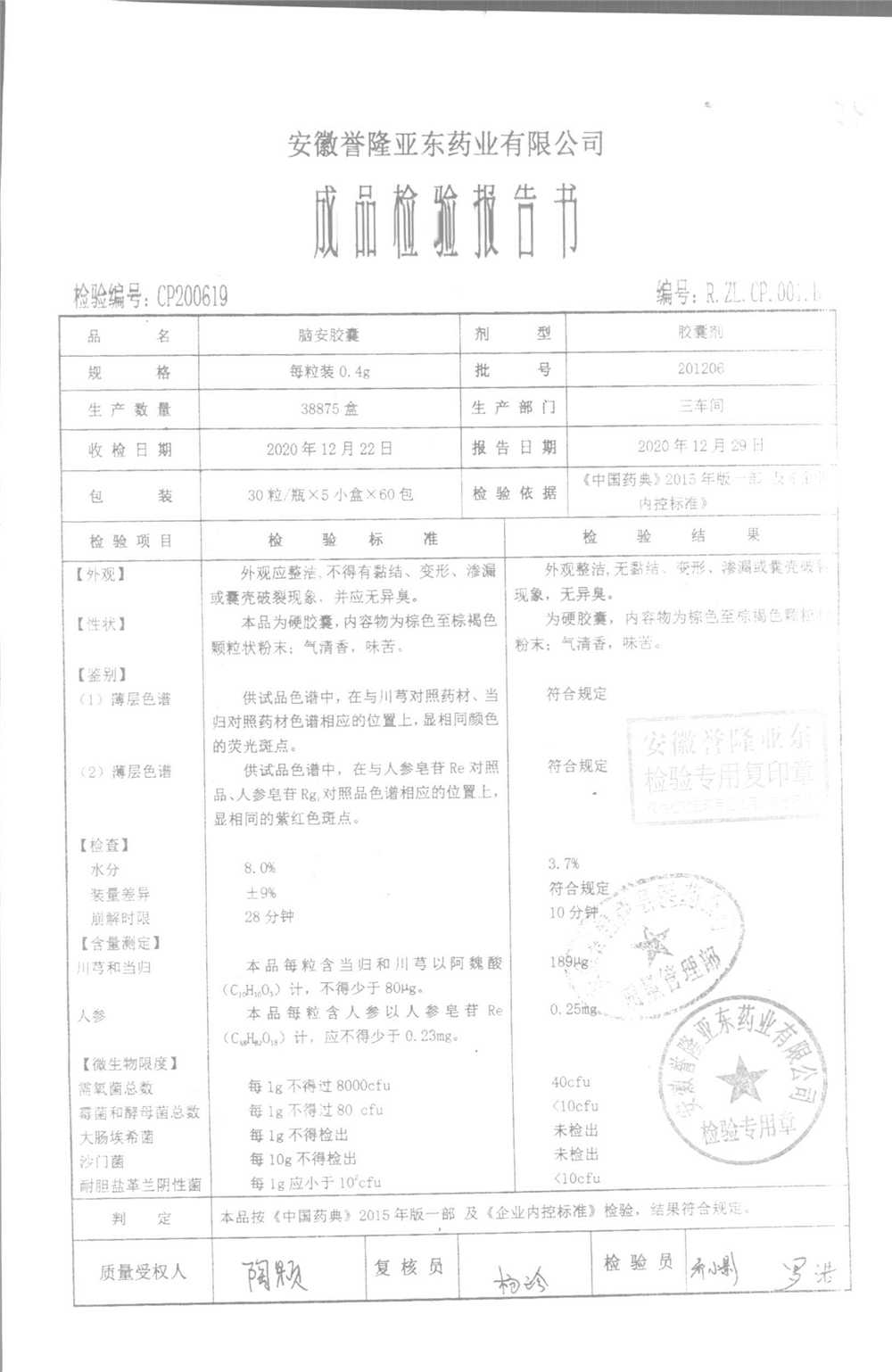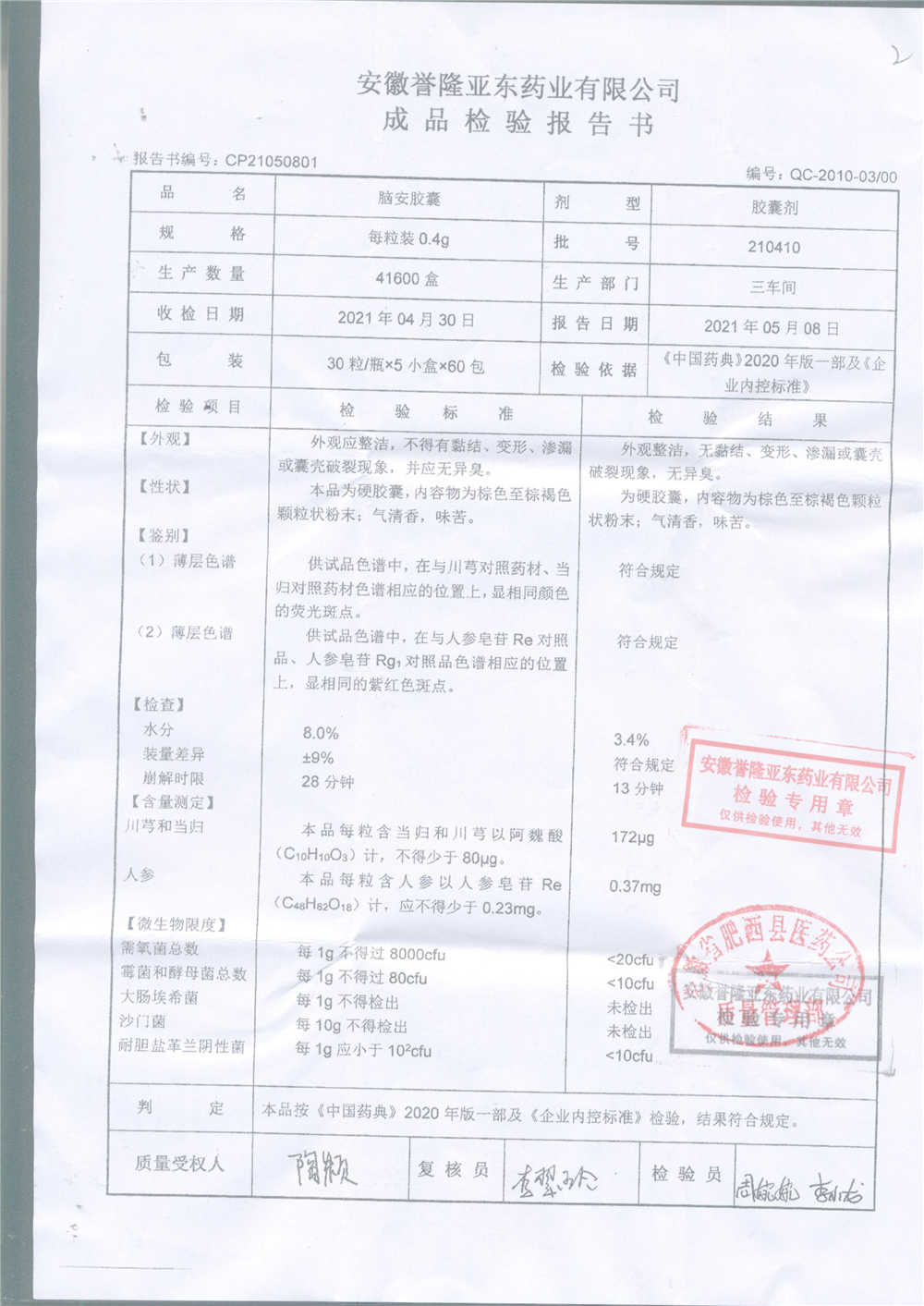 | 脑安胶囊 | 0.4g*30s | 210418(2/2) | 查看详情 |