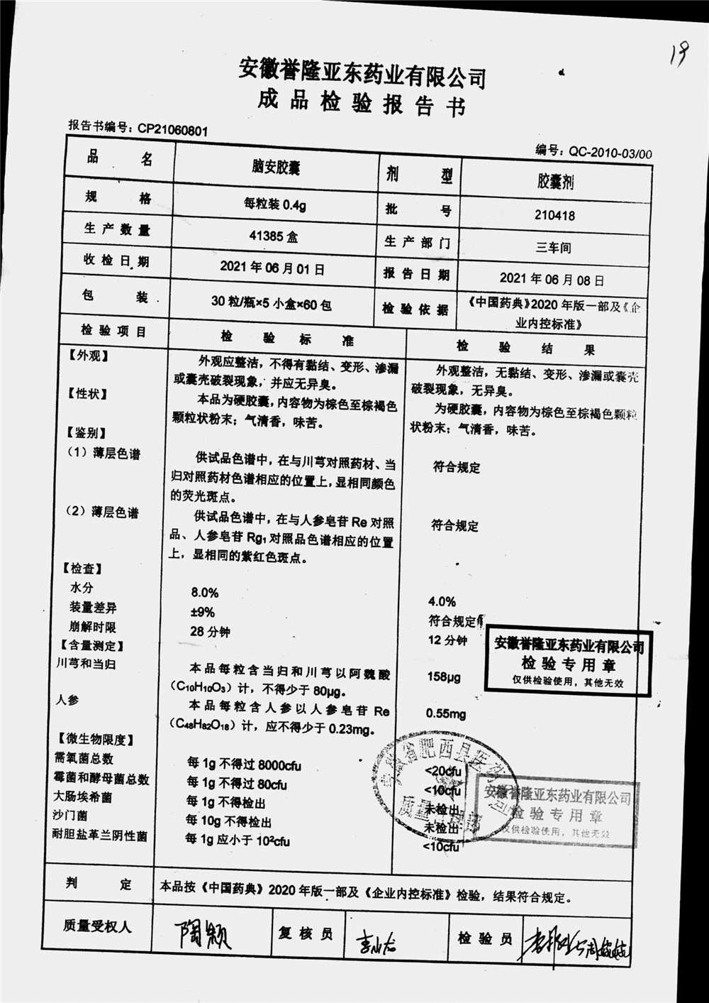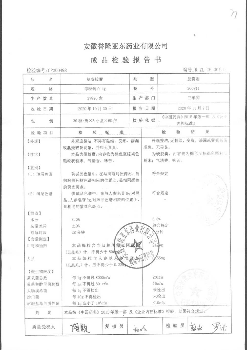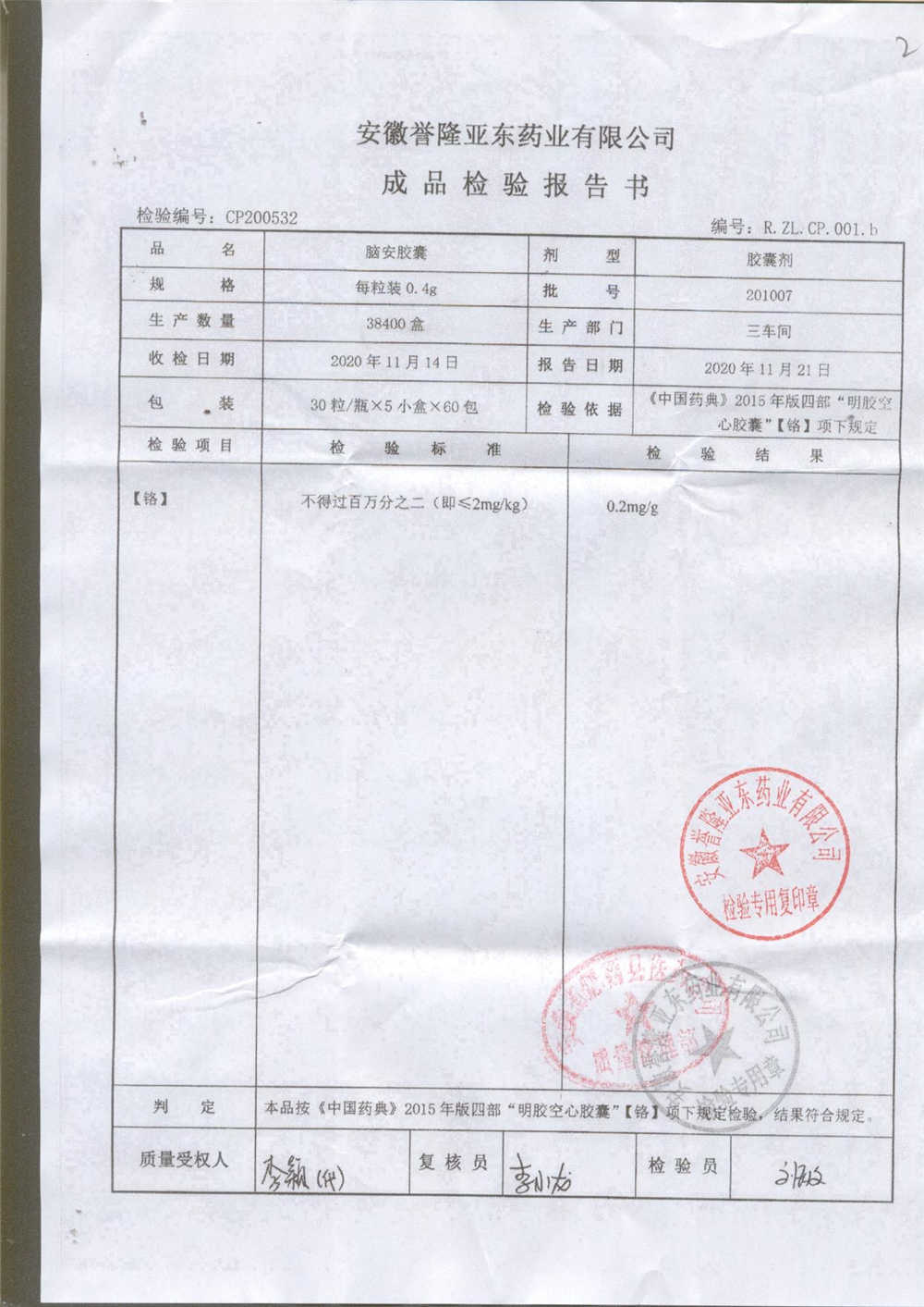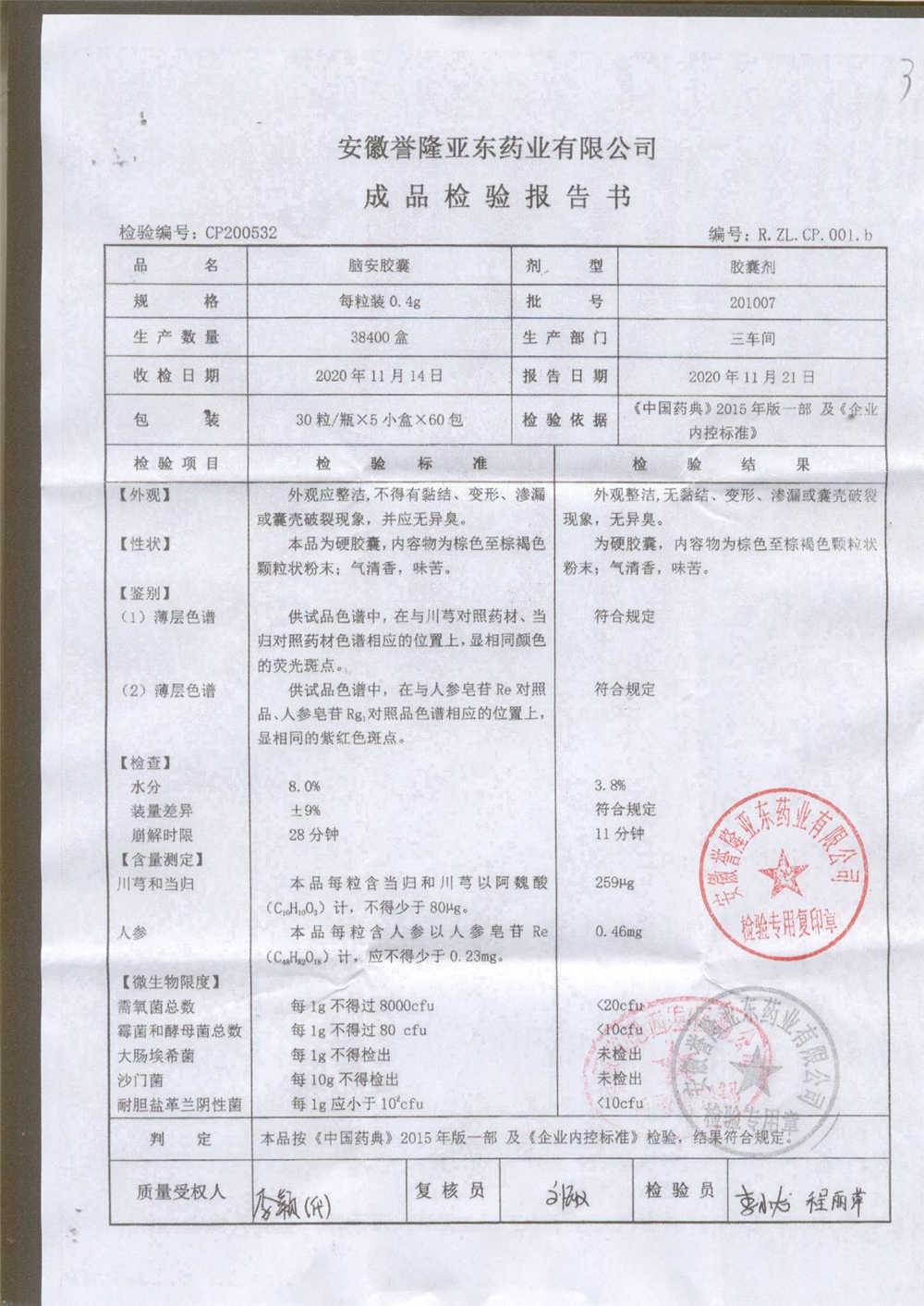 | 脑安胶囊 | 0.4g*30s | 210418(2/2) | 查看详情 |