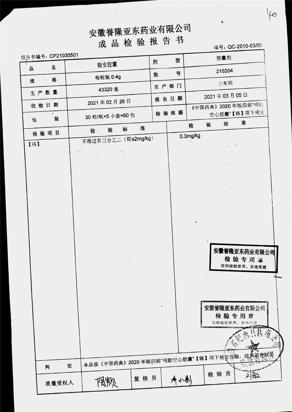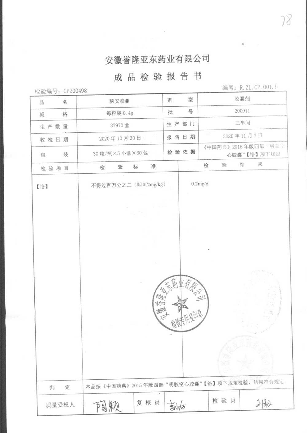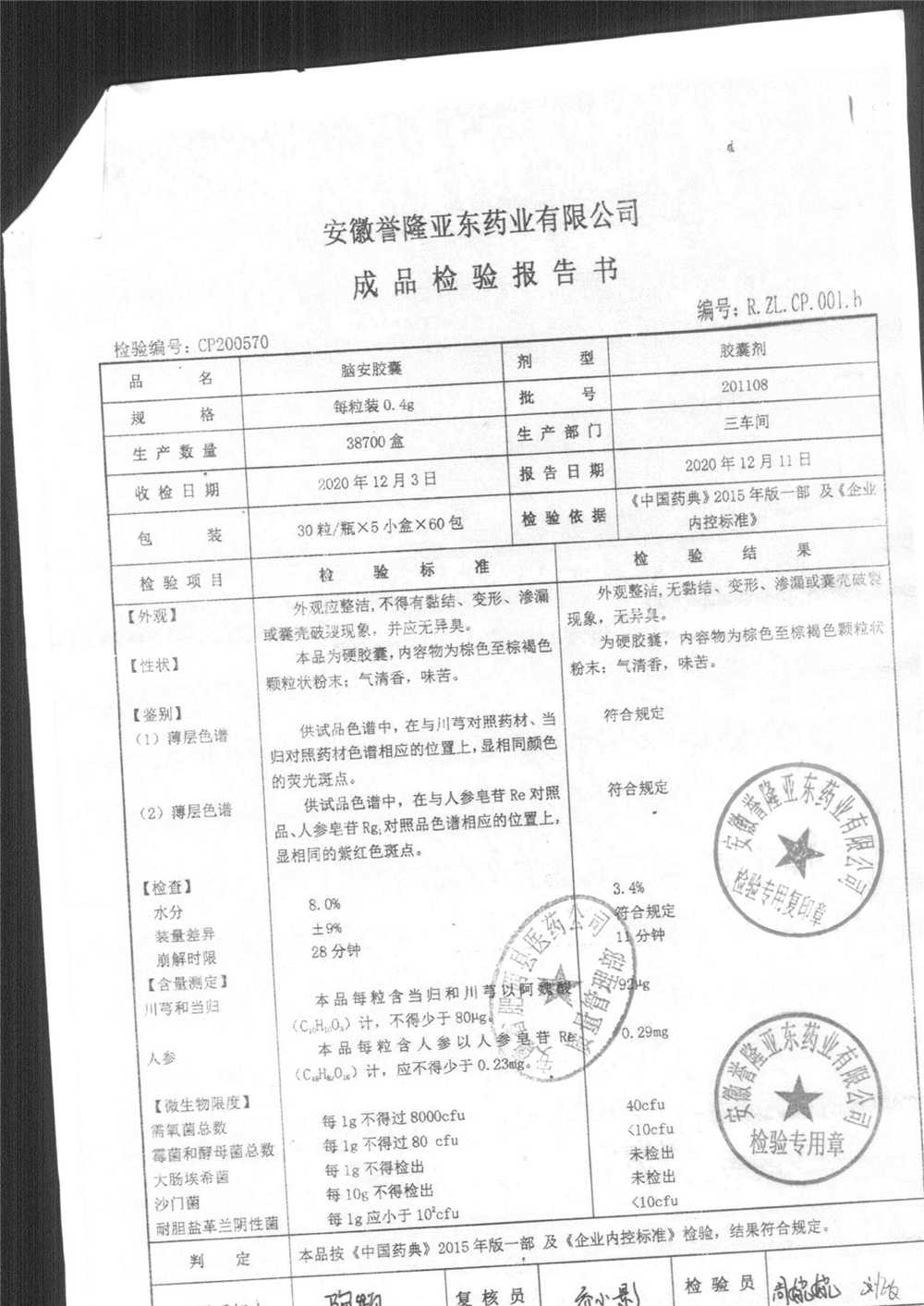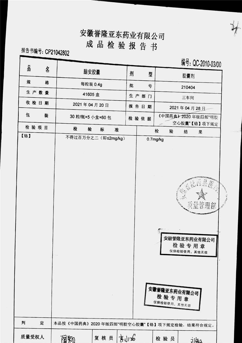 | 脑安胶囊 | 0.4g*30s | 210418(2/2) | 查看详情 |