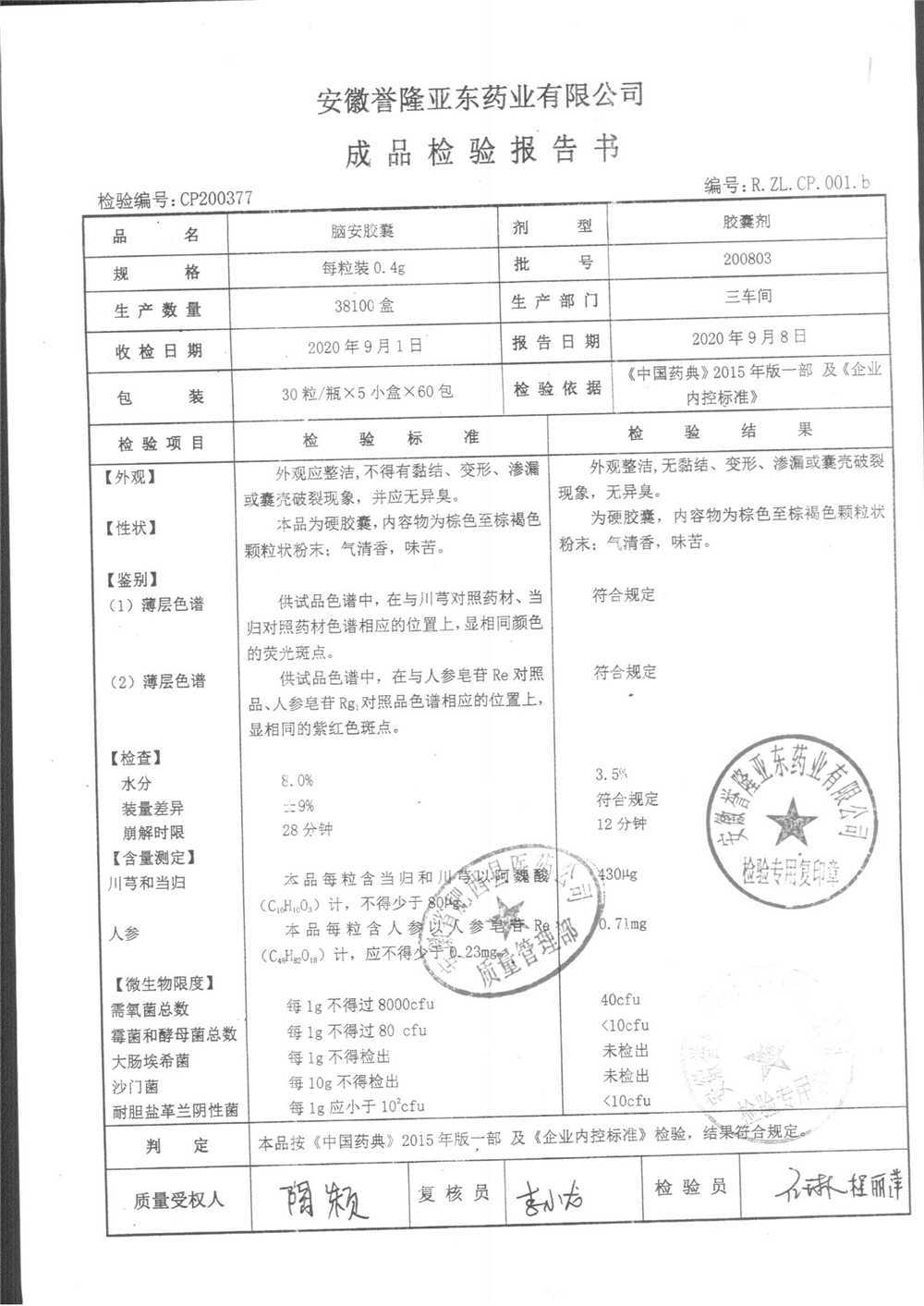 | 脑安胶囊 | 0.4g*30s | 200803(2/2) | 查看详情 |