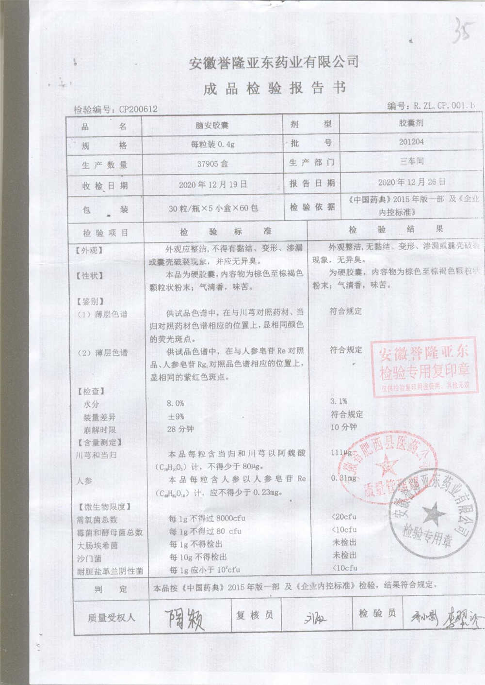 | 脑安胶囊 | 0.4g*30s | 210204(2/2) | 查看详情 |