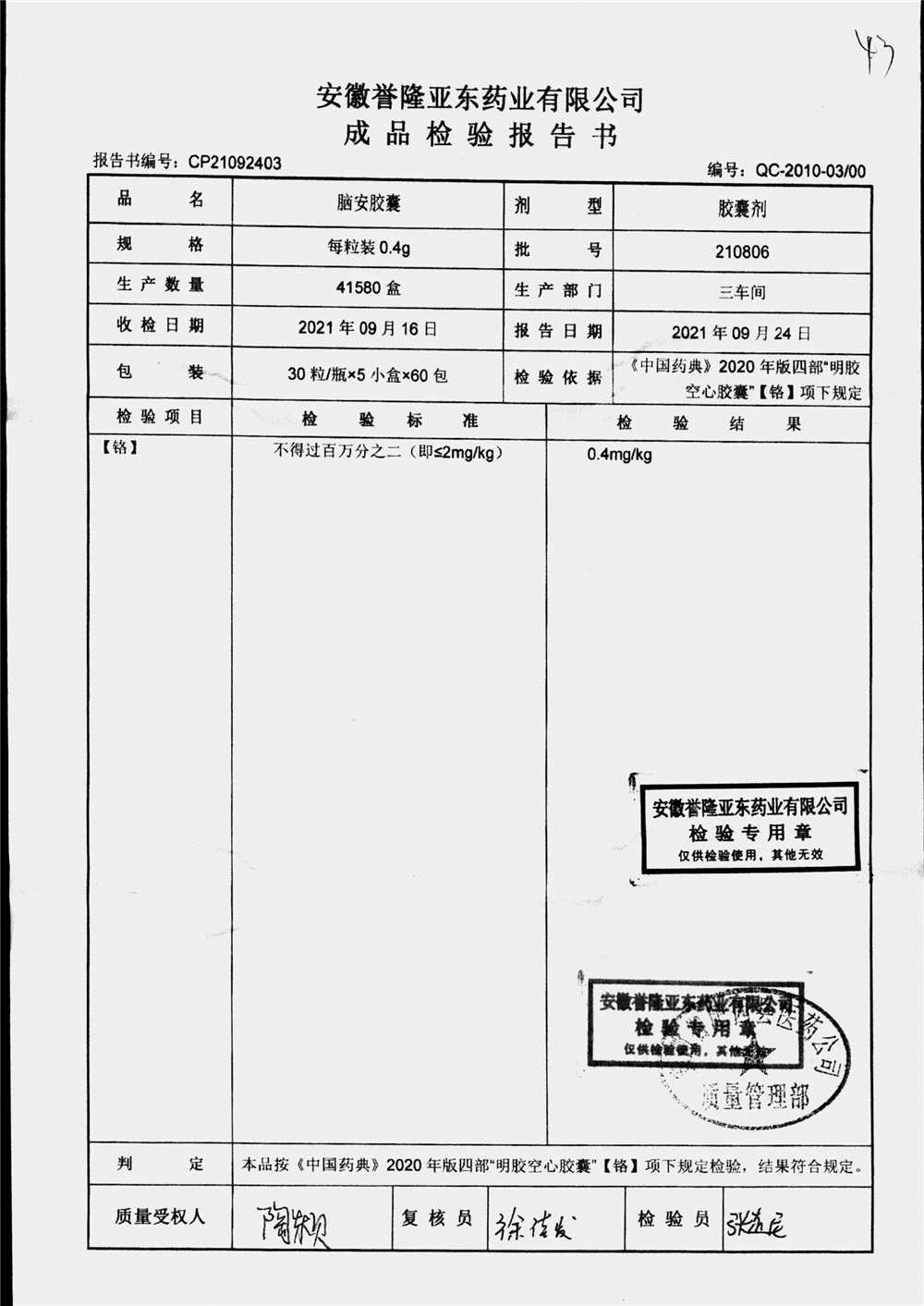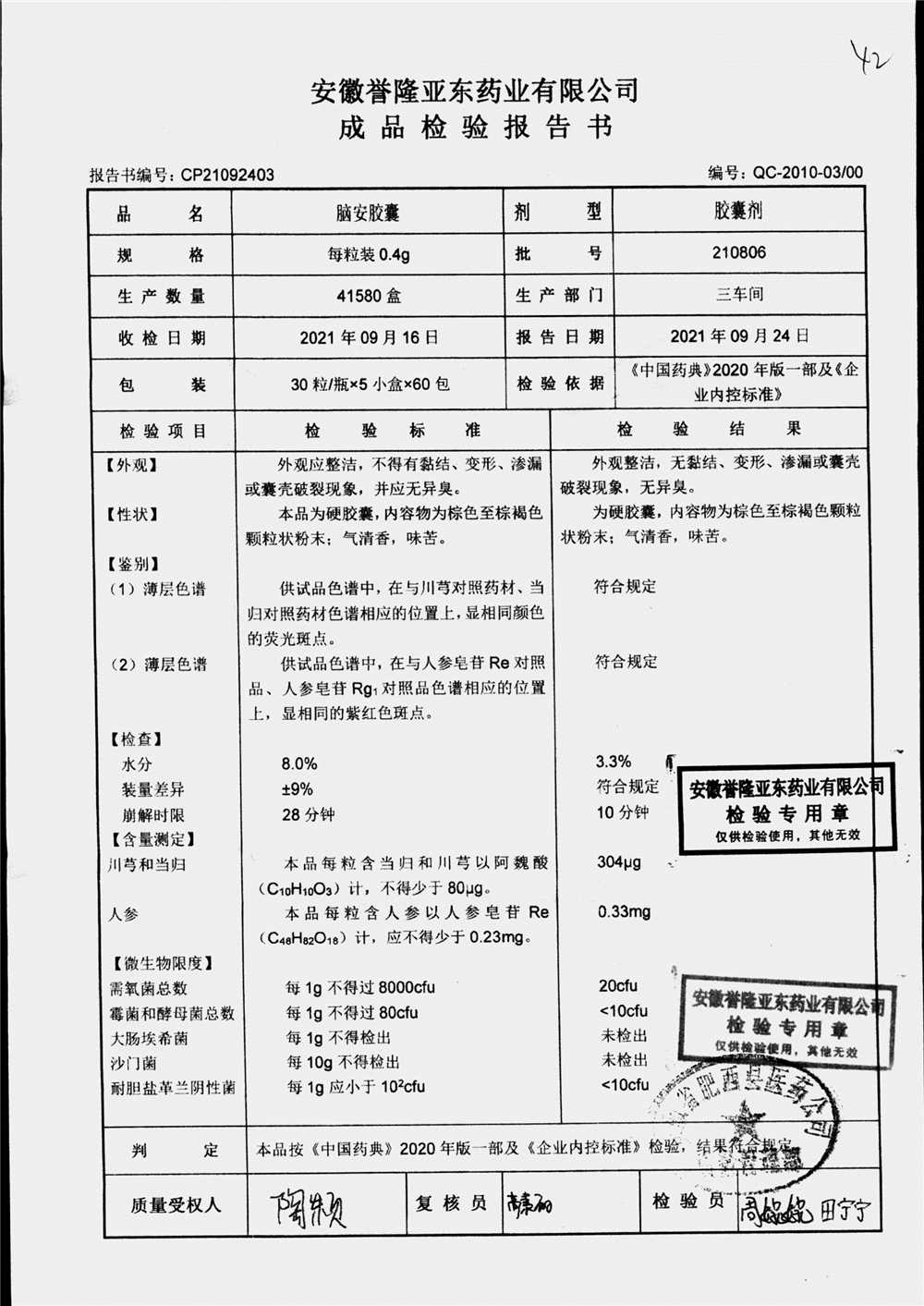| 脑安胶囊 | 0.4g*30s | 210806(2/2) | 查看详情 |
