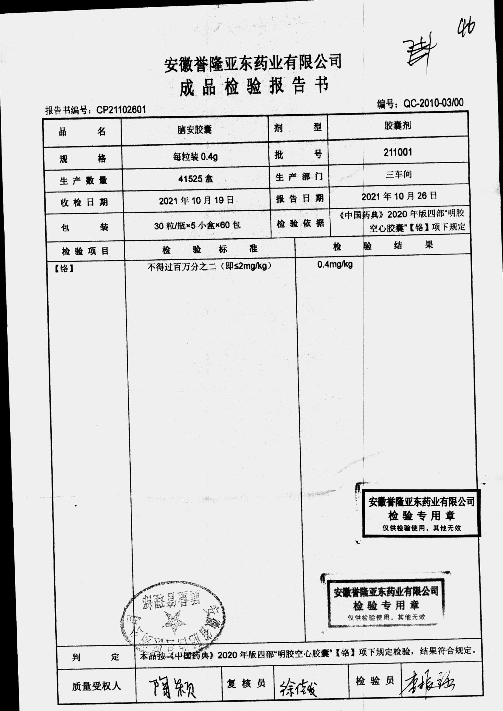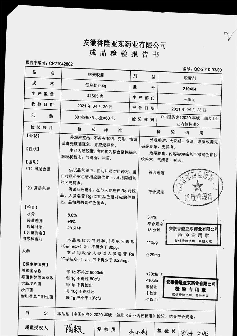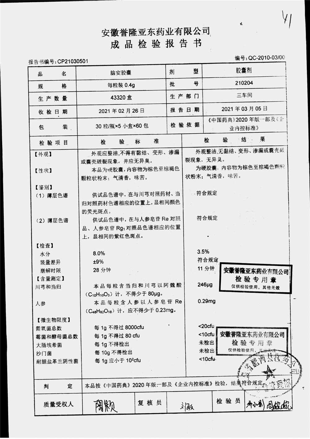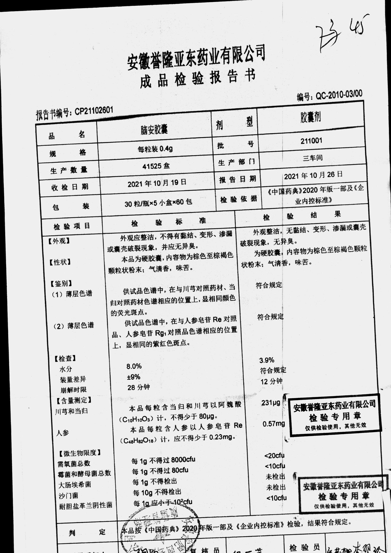 | 脑安胶囊 | 0.4g*30s | 210410(2/2) | 查看详情 |