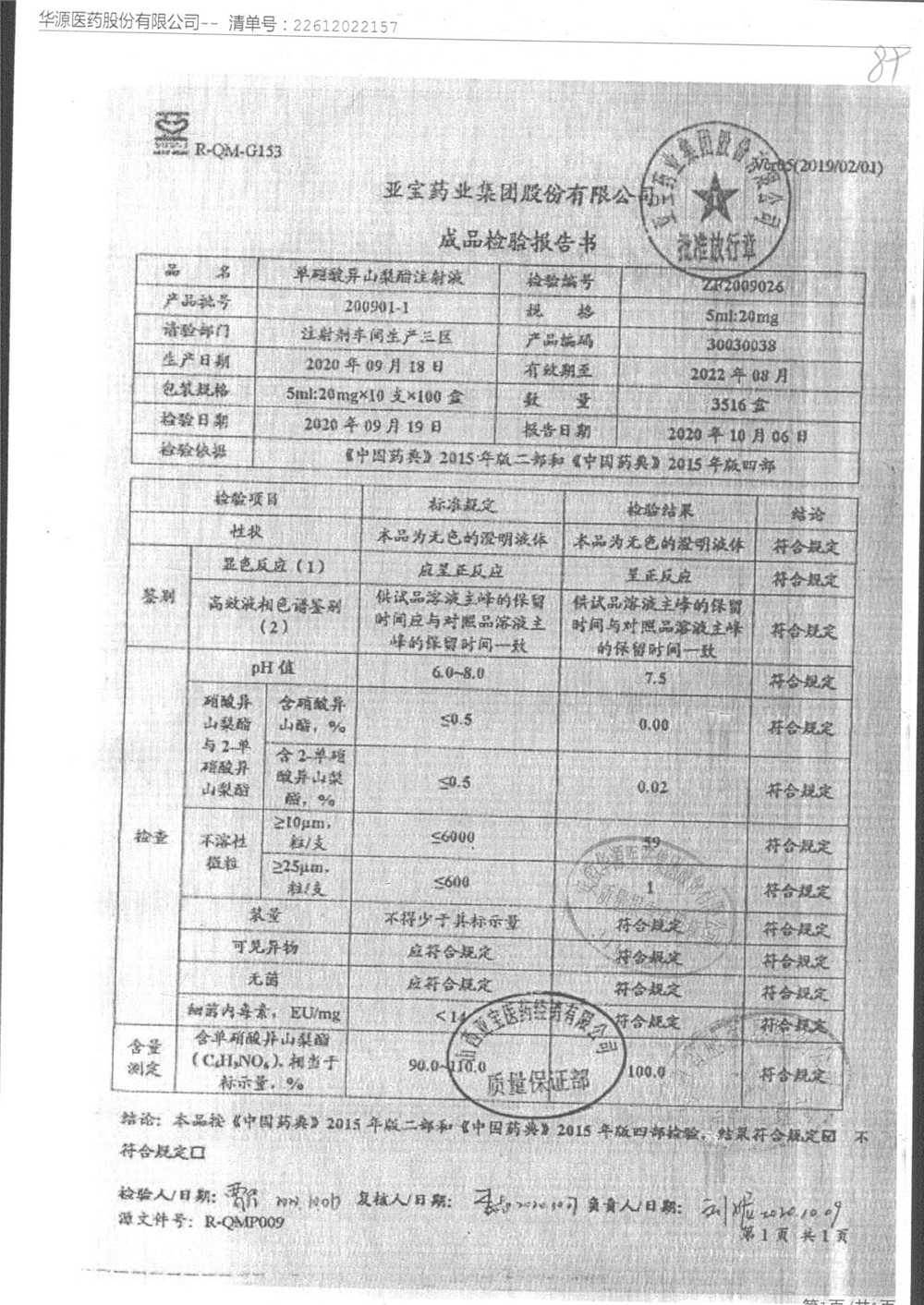 | 单硝酸异山梨酯注射液 | 5ml | 200901-1 | 查看详情 |