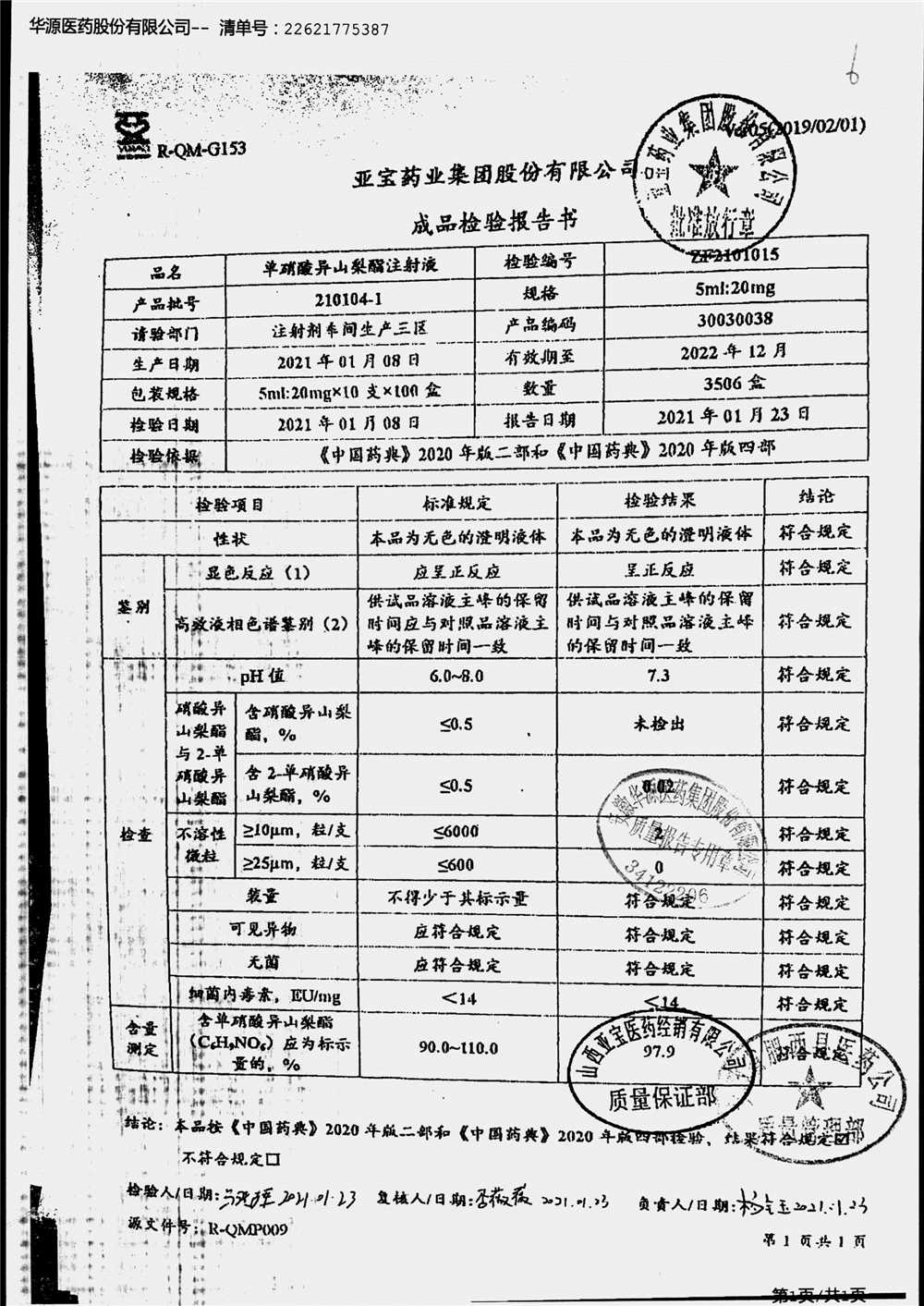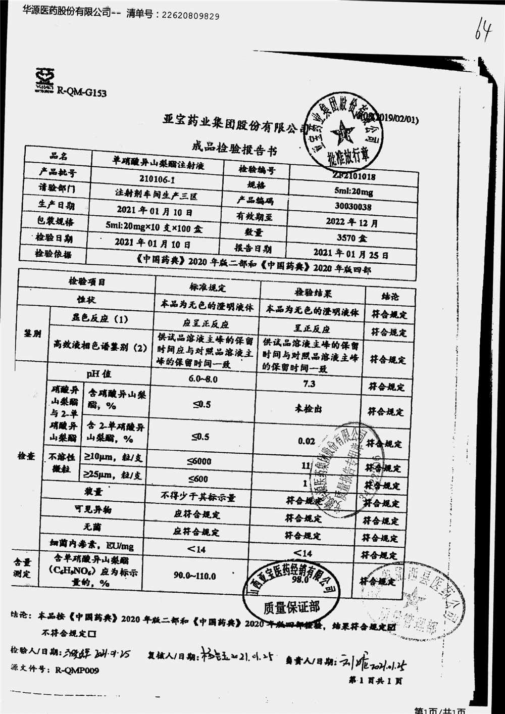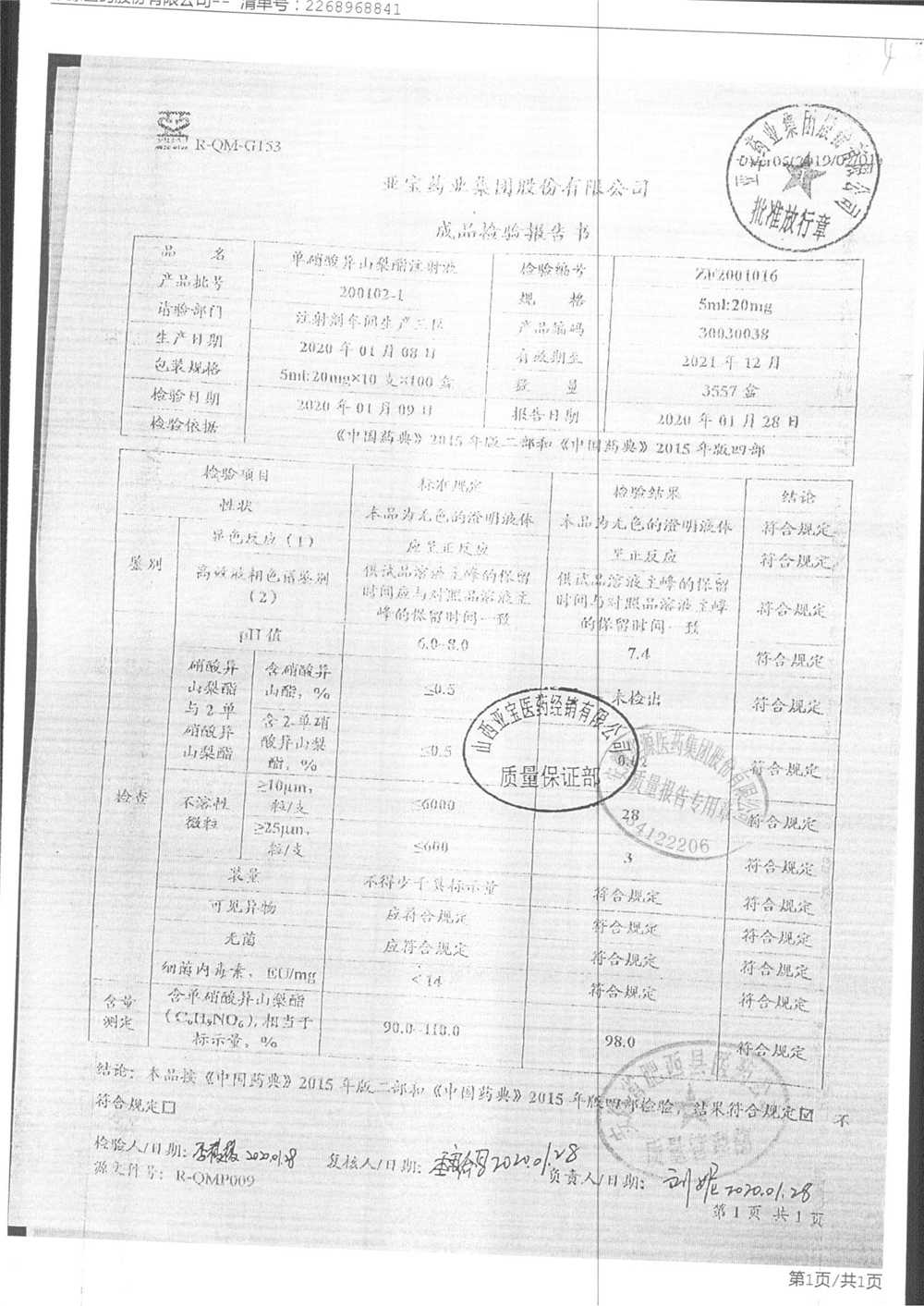 | 单硝酸异山梨酯注射液 | 5ml | 210106-1 | 查看详情 |
