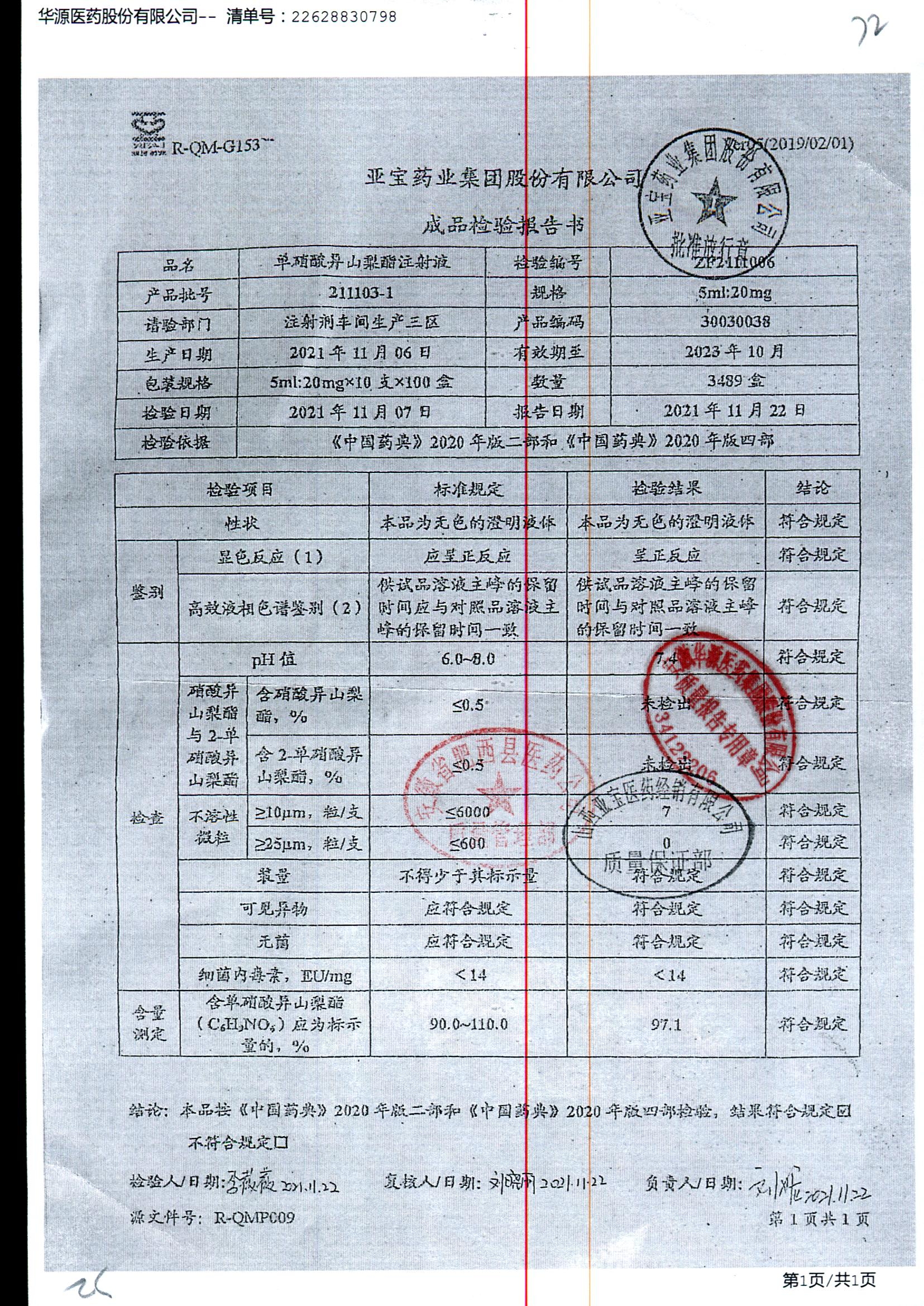 | 单硝酸异山梨酯注射液 | 5ml | 211103-1 | 查看详情 |