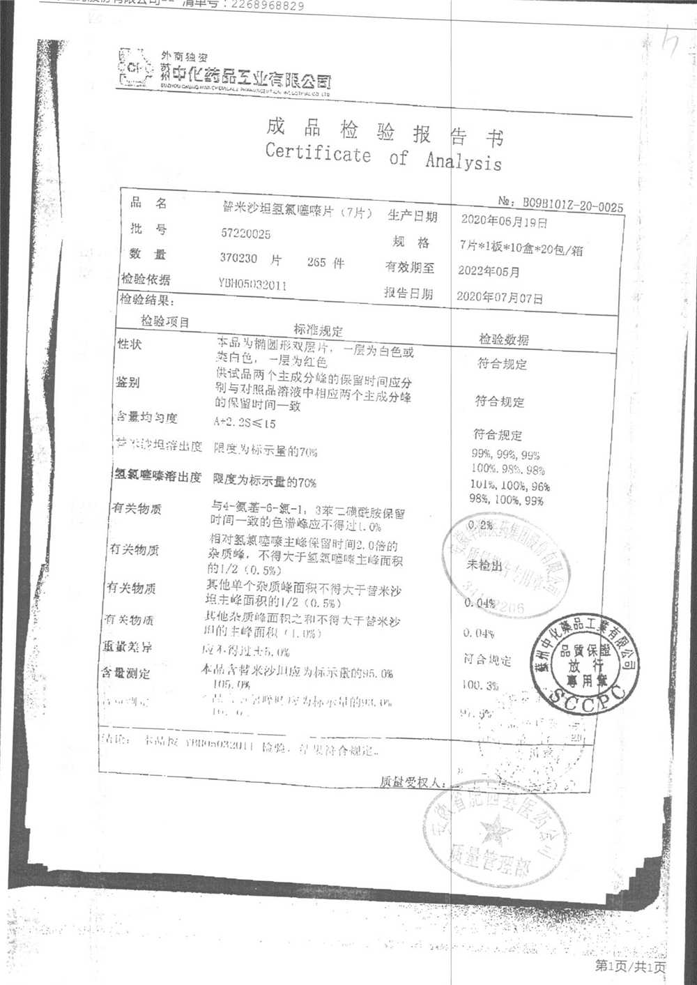 | 替米沙坦氢氯噻嗪片 | 7s | 50825038A/1 | 查看详情 |