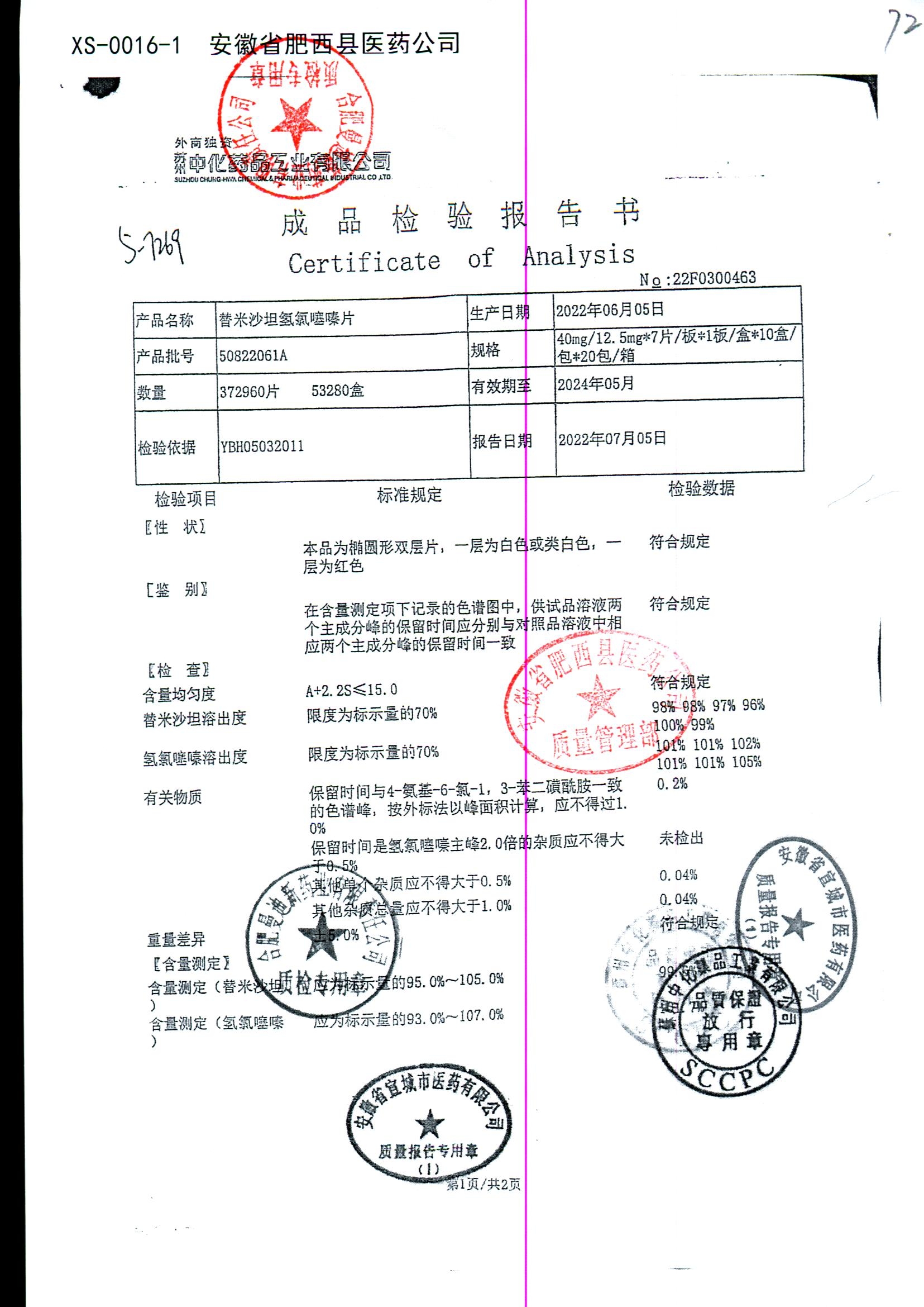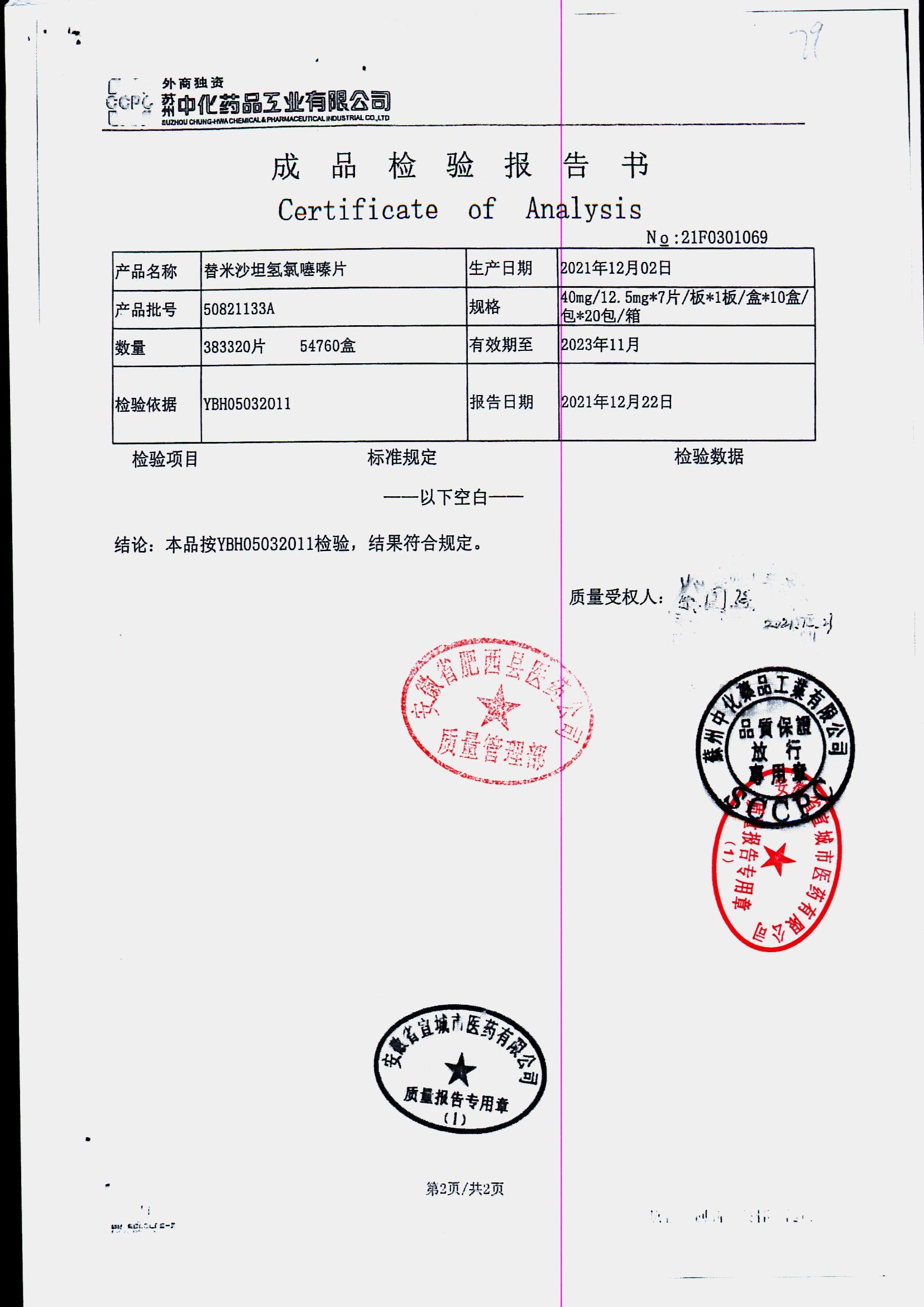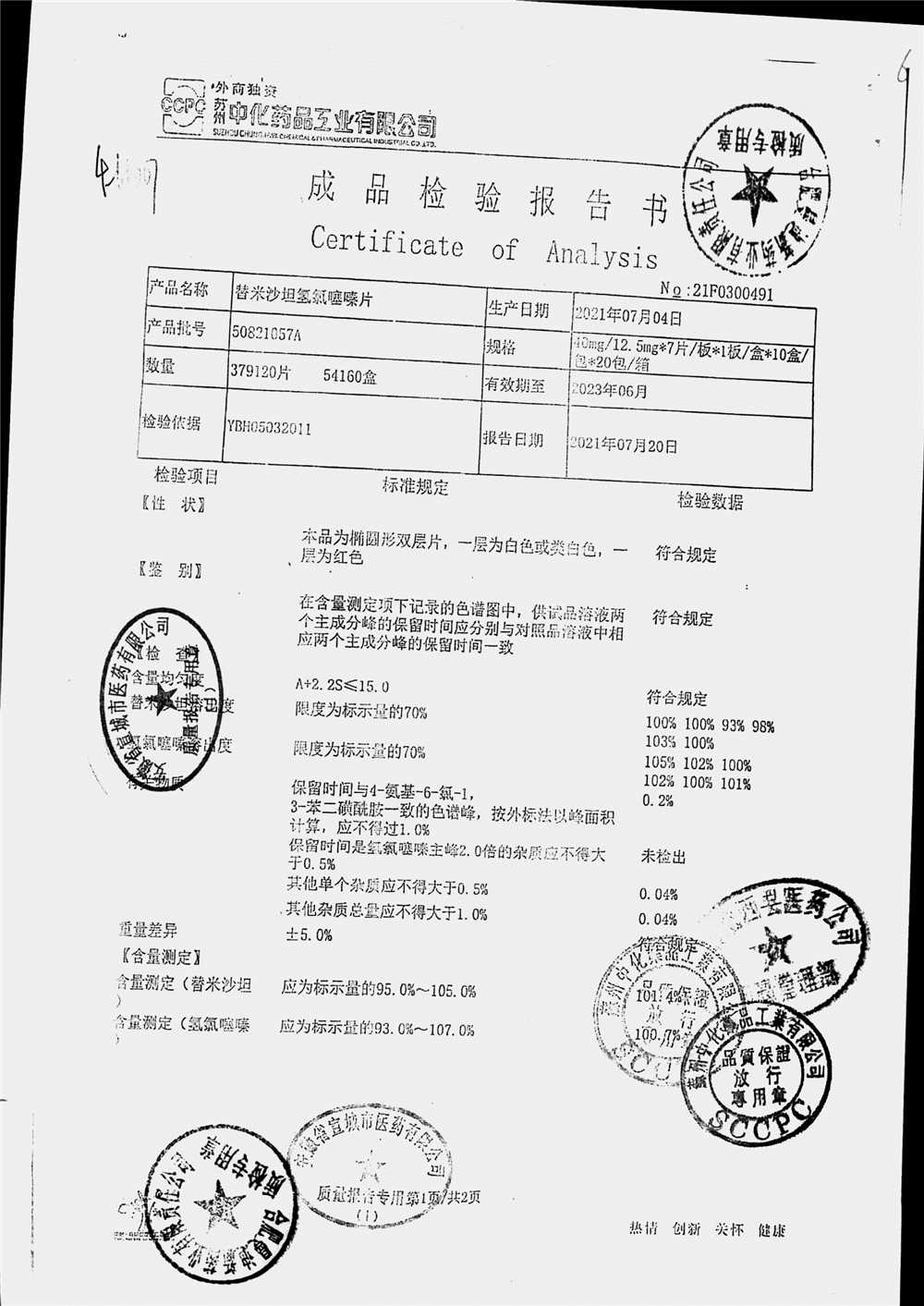 | 替米沙坦氢氯噻嗪片 | 7s | 50822061A/1 | 查看详情 |